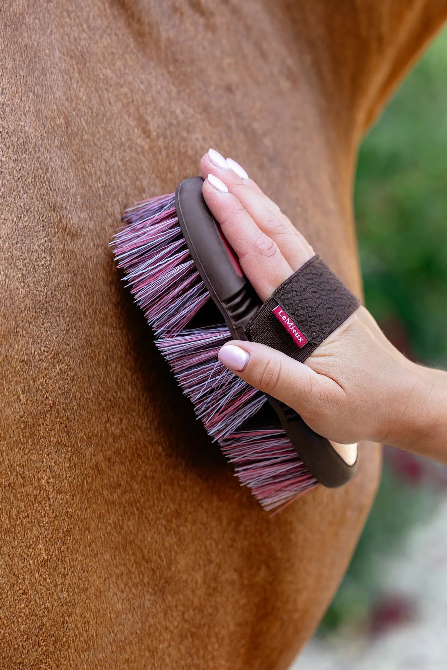 Ist dies die tollste Pferdepflegebürste auf dem Markt? Die langen, zurückfedernden Borsten eignen sich perfekt, um Staub und Schmutz vom Fell zu entfernen, während die flexible Form mühelos jede Kontur erreicht. Durch den elastischen Webriemen liegt sie perfekt in der Hand.