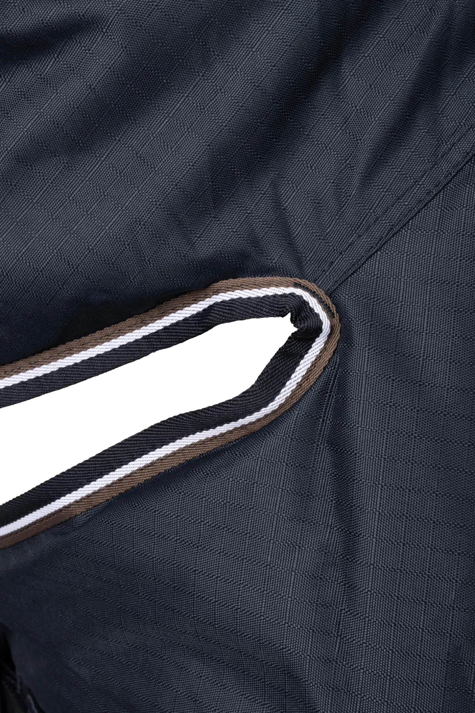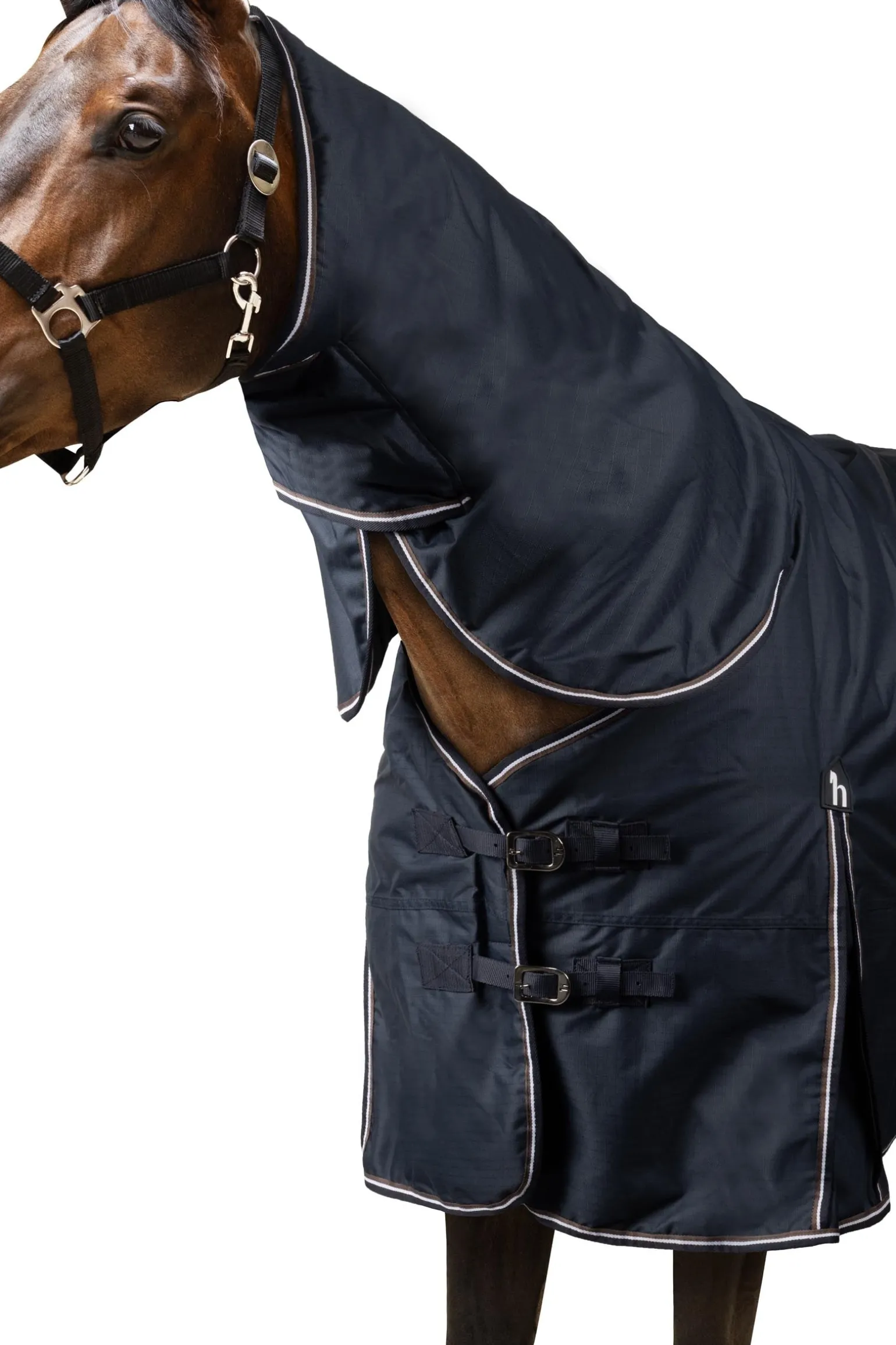 Die Regendecke mit Halsteil besteht aus wasserdichtem, atmungsaktivem Material. Die gute Passform an Hals und Schultern sorgt für Komfort, die hohe Gehfalte für Bewegungsfreiheit. Die Brustverschlüsse, Kreuzriemen, Beinschnüre und der Schweiflatz halten die Decke sicher an ihrem Platz.