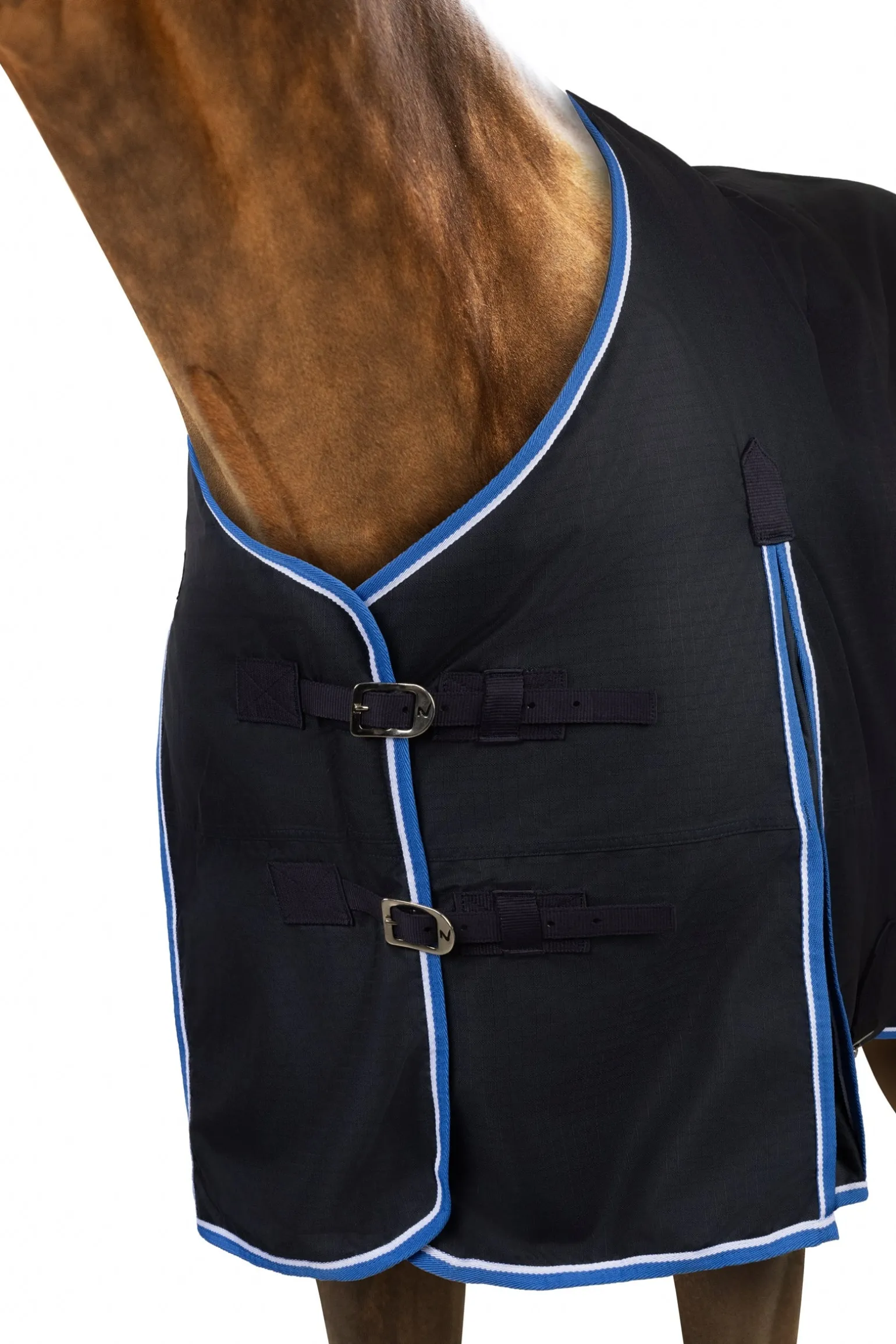 Diese Decke ist aus wasserdichtem, atmungsaktivem Material gefertigt. Der gute Sitz an Hals und Schultern macht sie bequem und die hohen Gehfalten bieten Bewegungsfreiheit, damit sich dein Pferd austoben kann und nicht eingeschränkt wird. Frontverschlüsse, Kreuzgurte und Beinschnüre halten die Decke sicher an ihrem Platz und verhindern Verrutschen.