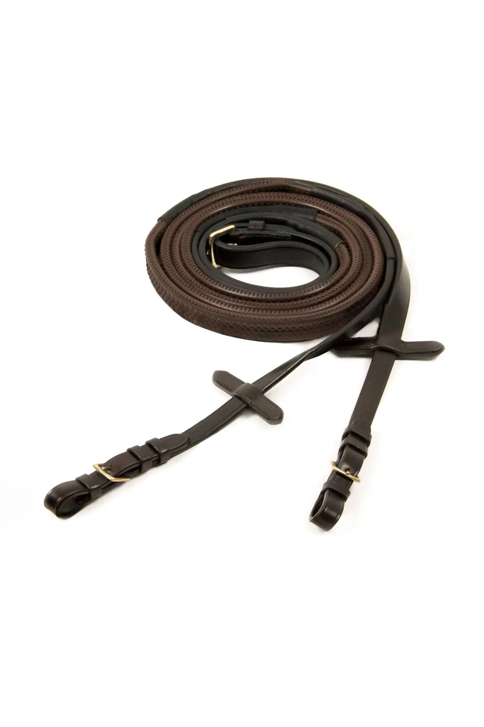 Einfache Gummizügel mit Schnalle und einer mittleren Breite von 17 mm. Die Zügel liegen angenehm in der Hand und werden mit Martingalstoppern geliefert.