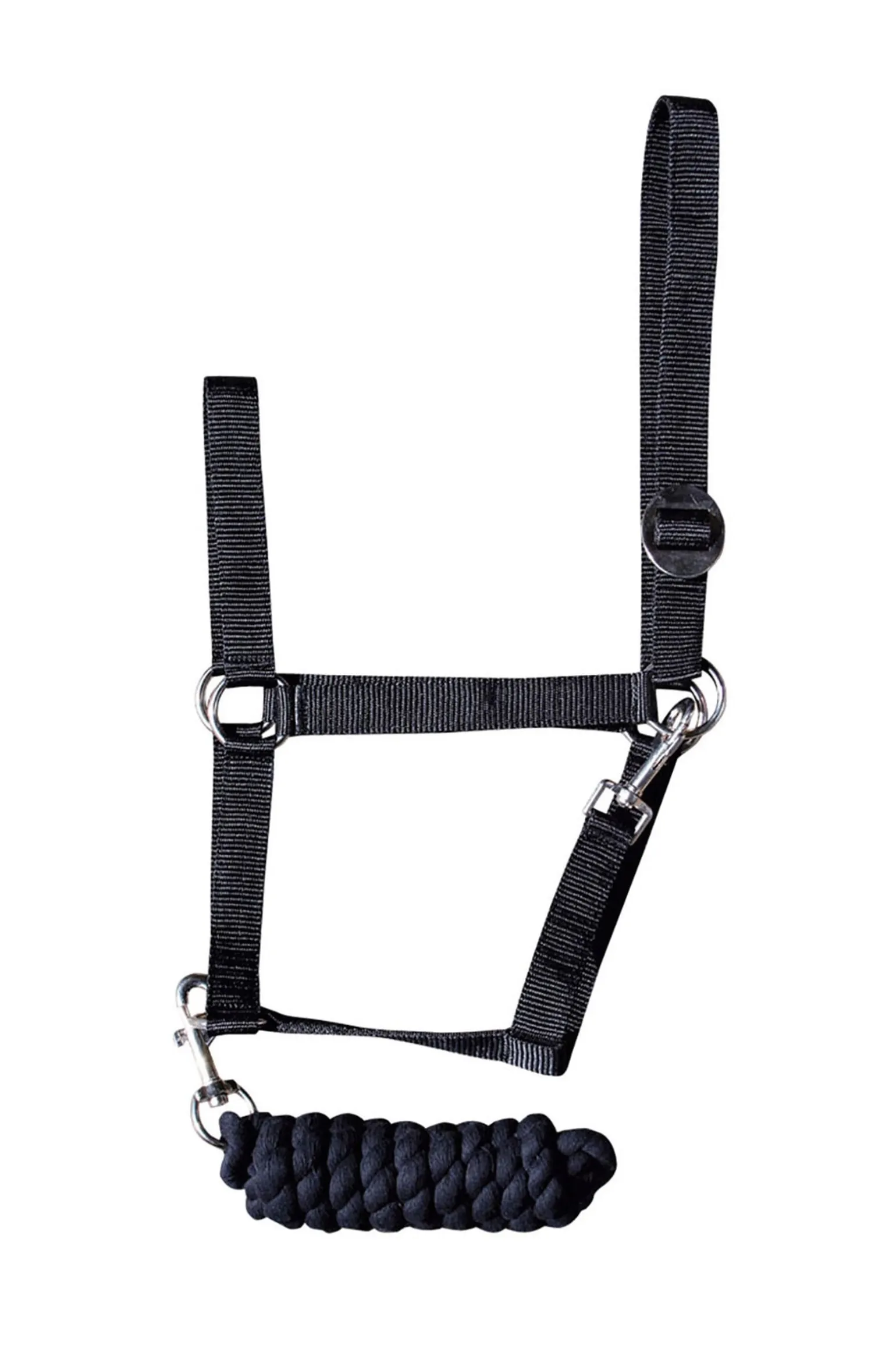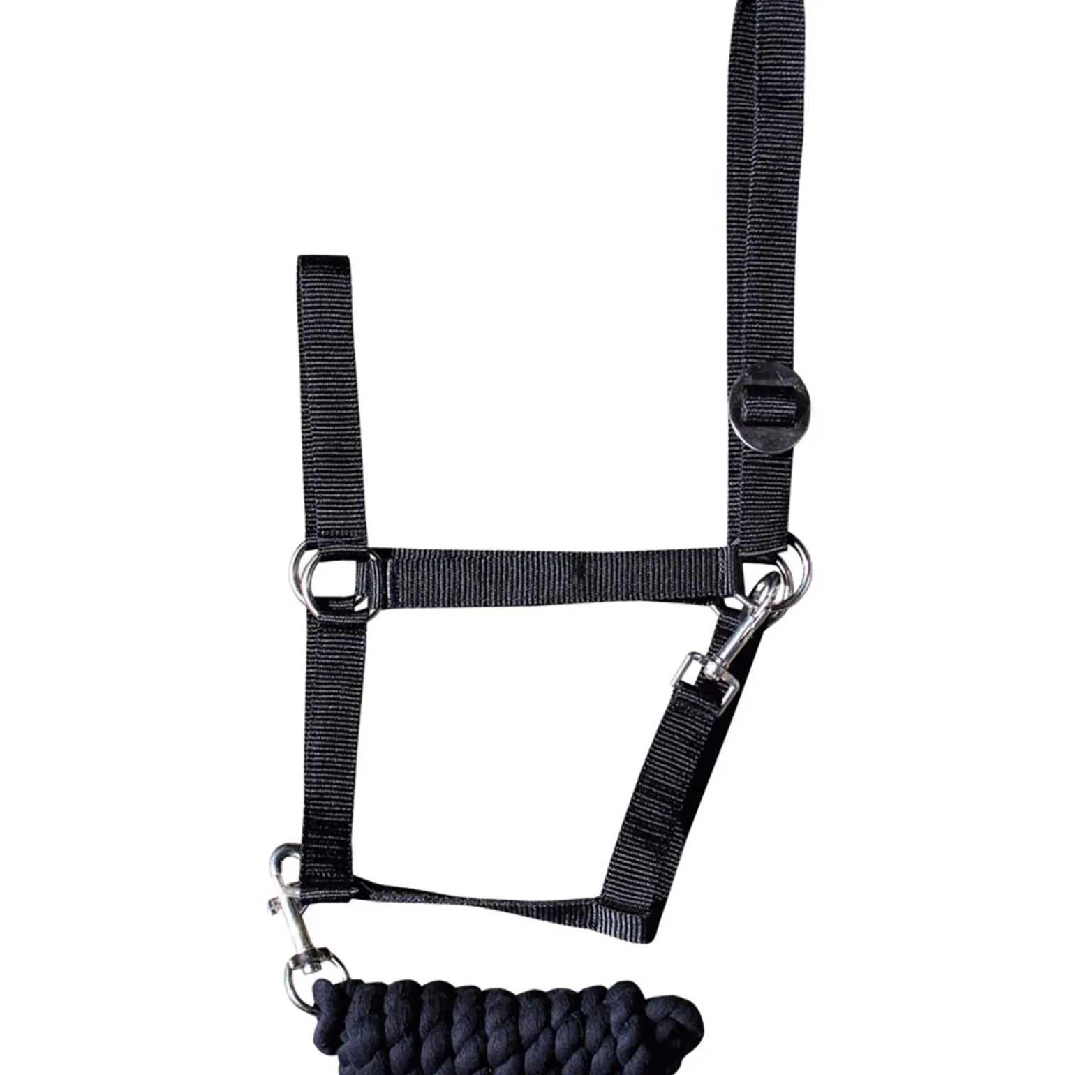 Basis-Halfter mit vernickelten Beschlägen. Das Halfter ist am Kopfstück mittels Schiebeschnalle verstellbar. Länge Führstrick: 180 cm.