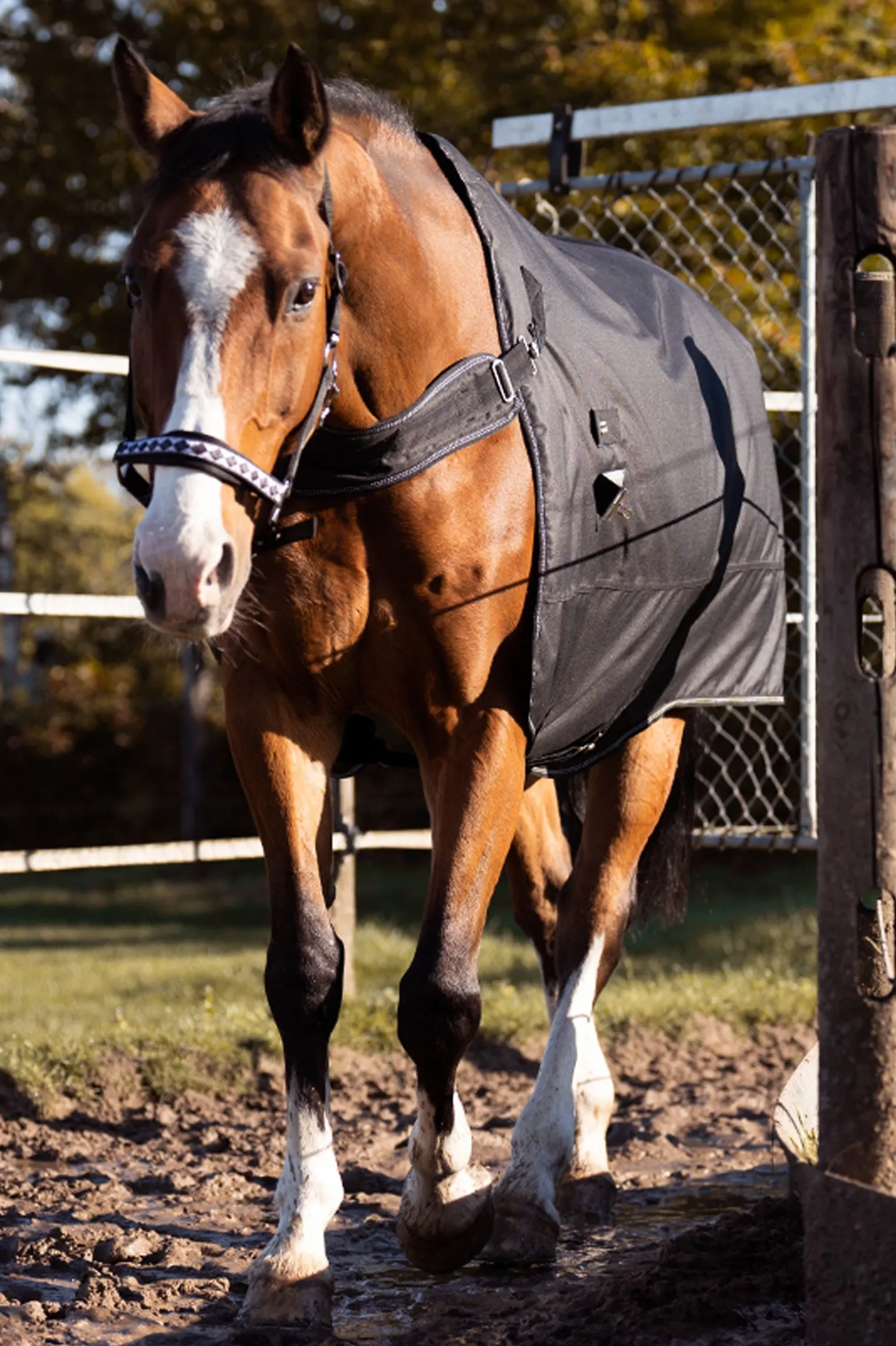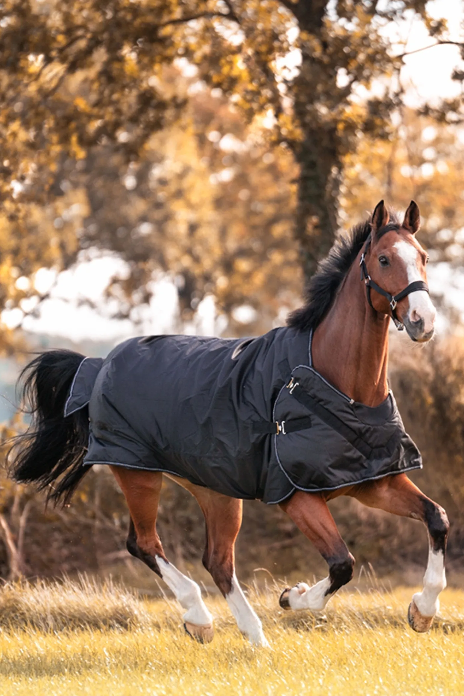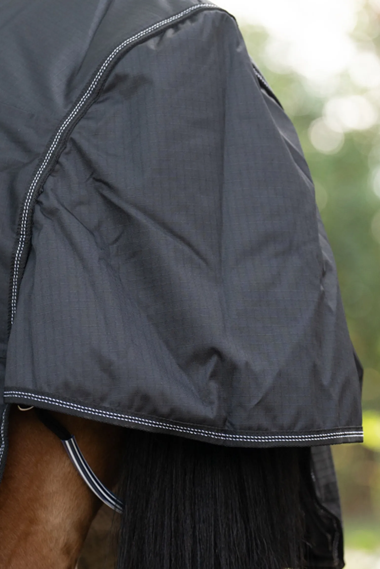 Dank des schnellen und einfachen Austauschs des Brustgurts kann die Decke Halifax sowohl als Outdoordecke als auch als Führanlagendecke (im Freien) verwendet werden. Es gibt zwei Befestigungsoptionen für den Brustgurt: Die untere Befestigung ist besonders für schmalere Pferde geeignet. Die Decke Halifax 2in1 gibt deinem Pferd die Bewegungsfreiheit, die es in der Führanlage oder auf dem Laufband benötigt. Die Outdoordecke bietet ebenfalls diesen Komfort: Da die Decke an den Schultern nicht geschlossen ist, wie es bei herkömmlichen Outdoordecken der Fall ist, hat dein Pferd ausreichend Bein- und Schulterfreiheit, ohne dass sich die Decke an den Schultern dehnt. Der anatomisch geschnittene Rückenbereich mit hervorstehendem Widerrist sowie die Schweifklappe und der tiefe Schweifriemen sorgen für einen idealen Sitz ohne Verrutschen. Die tiefer geschnittenen Seiten der Decke Halifax 2in1 schützen auch den empfindlichen Bauchbereich vor Kälte. Die Polsterung am Widerrist und das glatte Innenmaterial geben deinem Pferd den Komfort, den es benötigt.