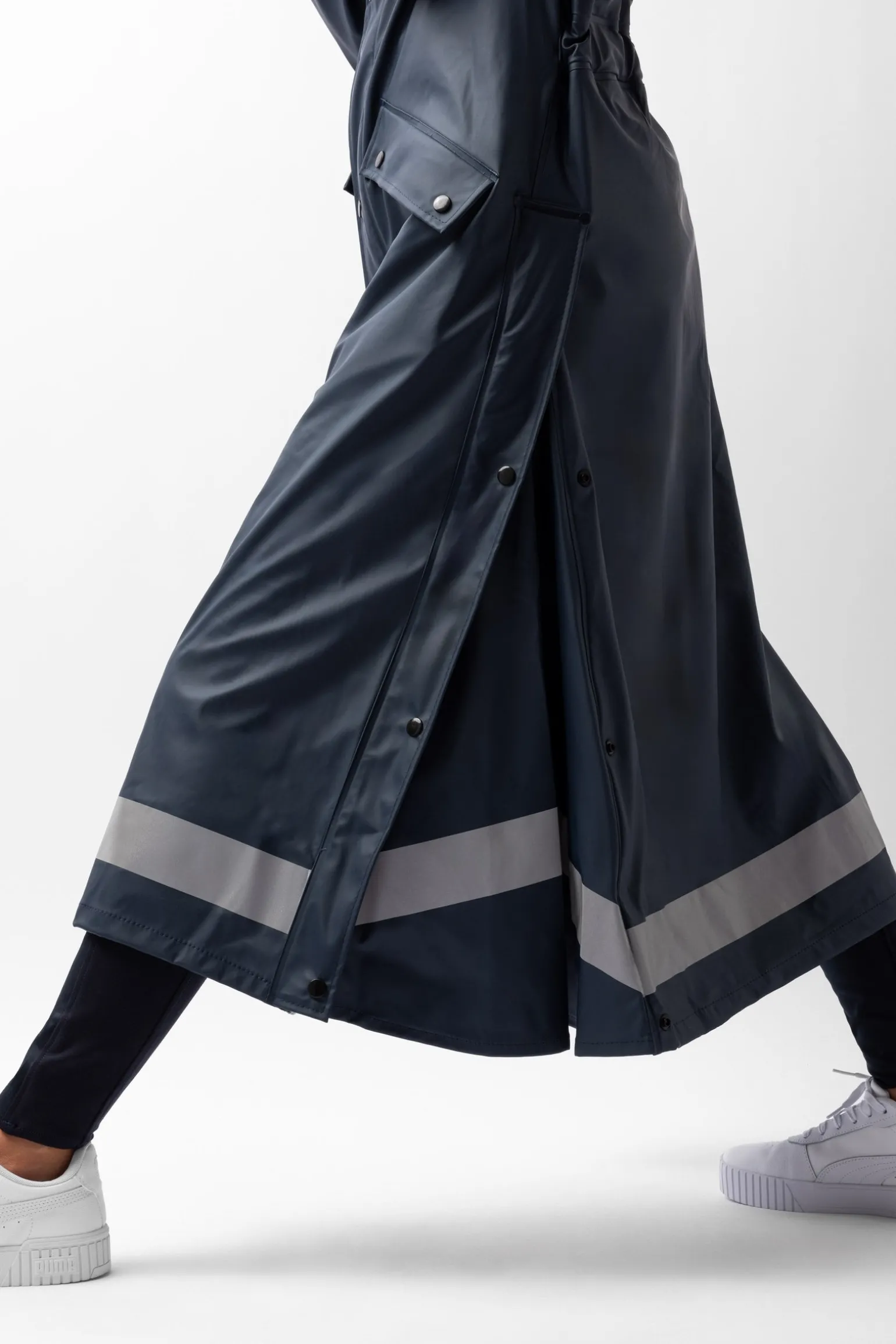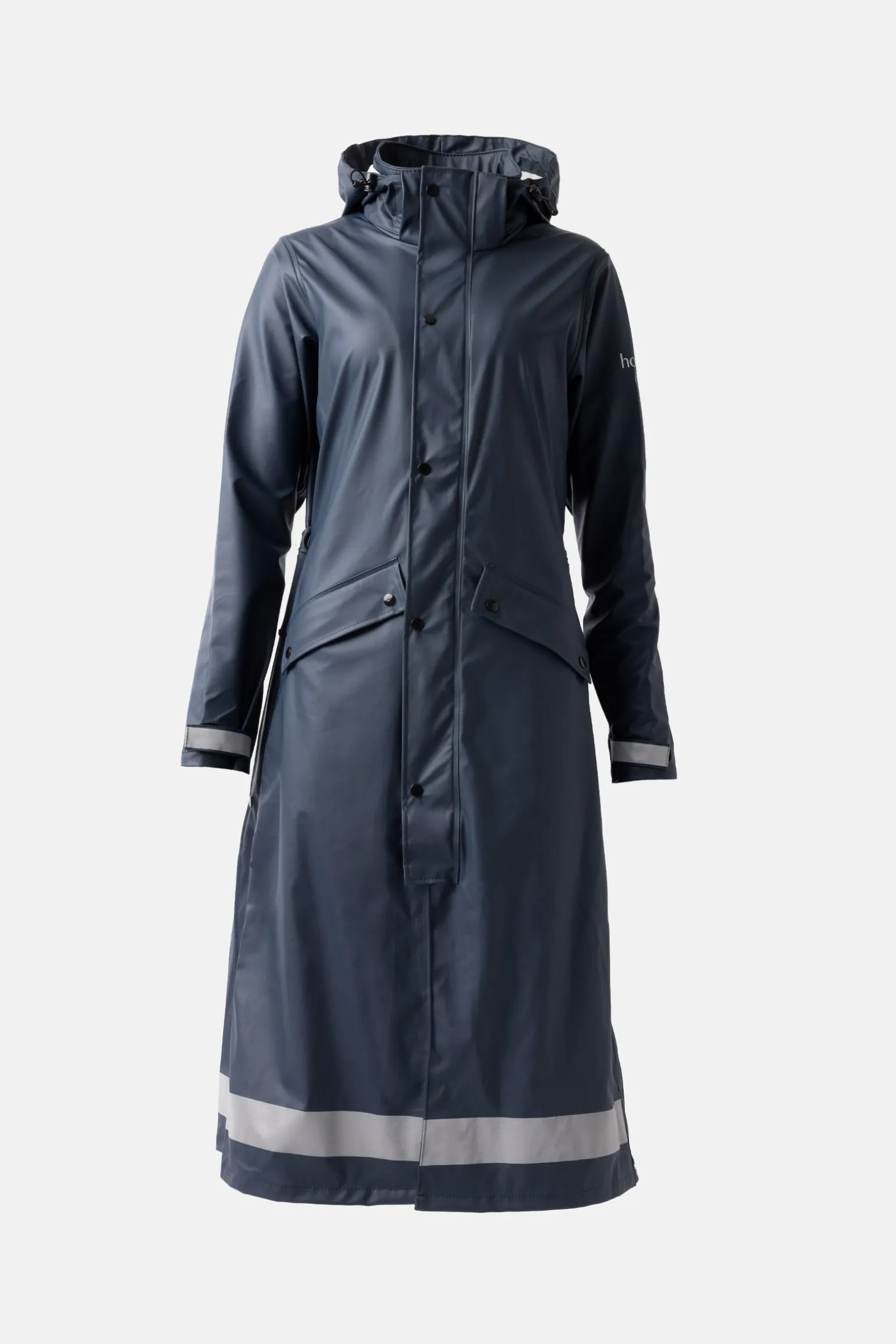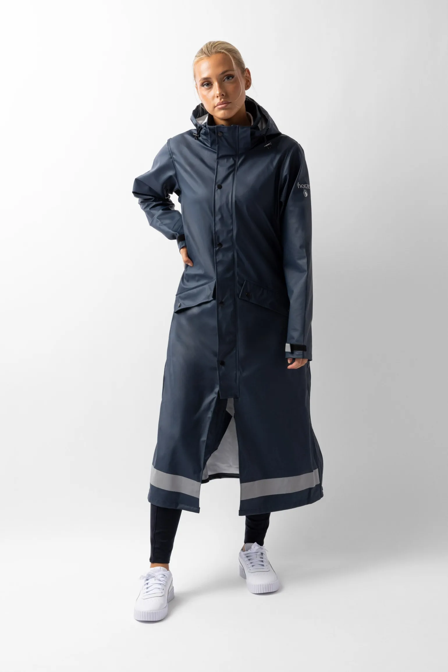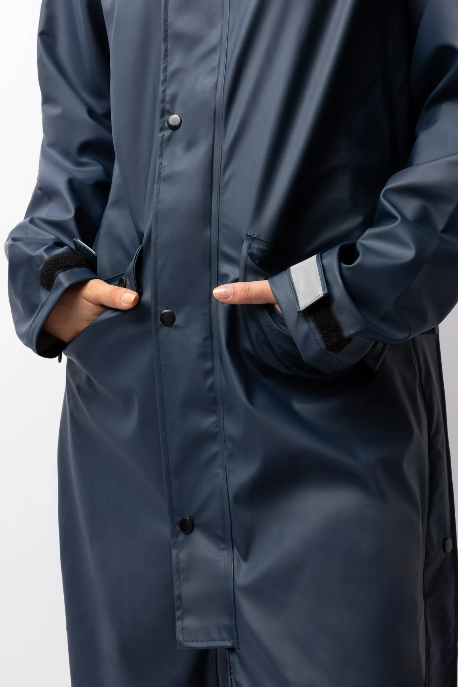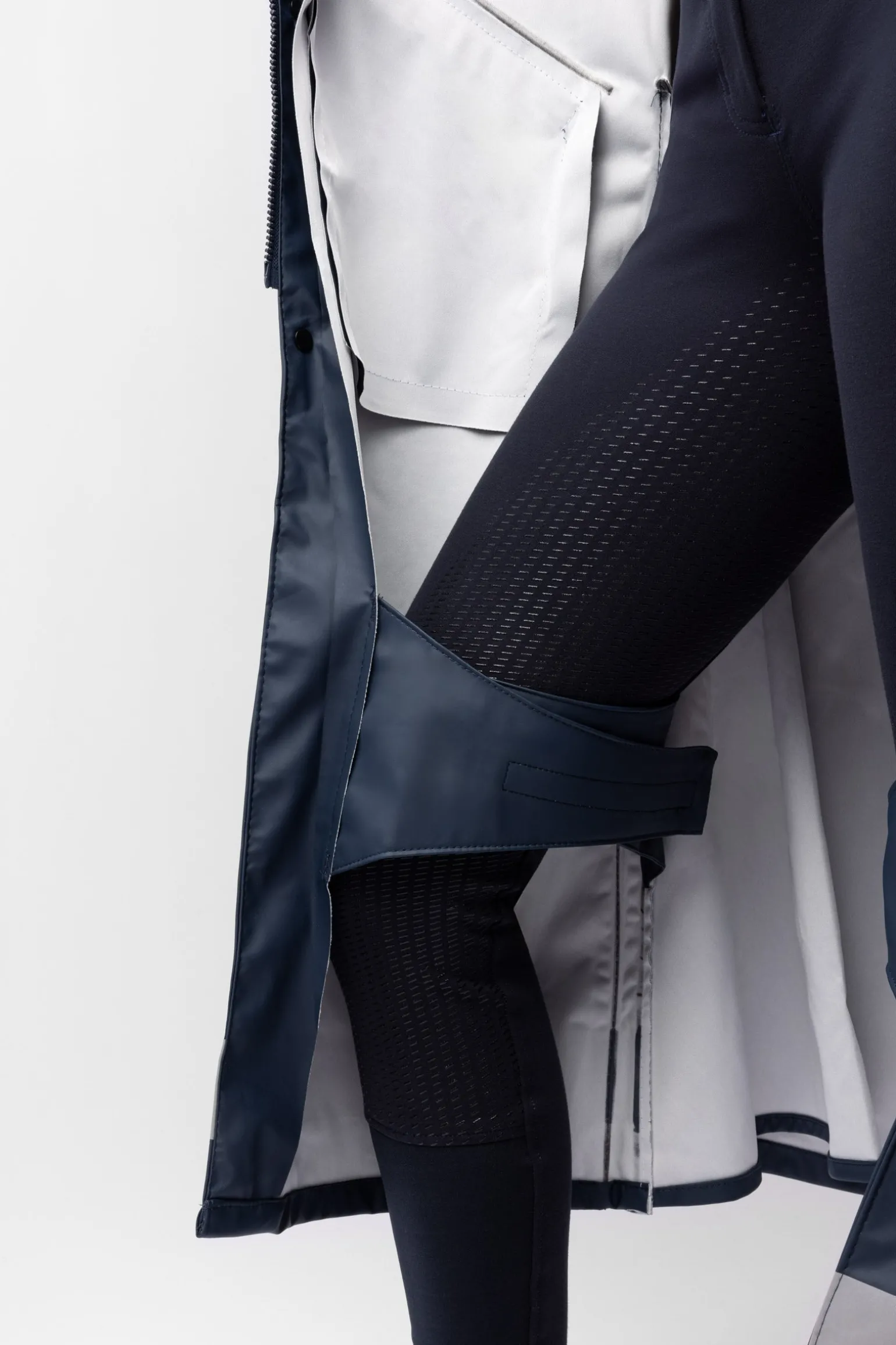 Mit diesem langen Regenmantel macht das Reiten sogar im Regen Spaß. Er verfügt über seitliche Schlitze mit Druckknöpfen. Diese können weit geöffnet werden und werden zur schützenden Regendecke über deinen Beinen und dem Sattel. Riemen an der Innenseite halten den wasserdichten Saum beim Reiten an seinem Platz. Die Kapuze schützt deinen Kopf und kann abgetrennt werden, wenn der Regen vorbei ist. Durch die verstellbaren Bündchen an den Ärmeln und Elastik am Rücken sind Flexibilität und der perfekte Sitz gegeben. Reflektierende Streifen sorgen für Sichtbarkeit bei trübem Wetter oder in der Dunkelheit. Große Taschen verstauen deine Sachen sicher und trocken.