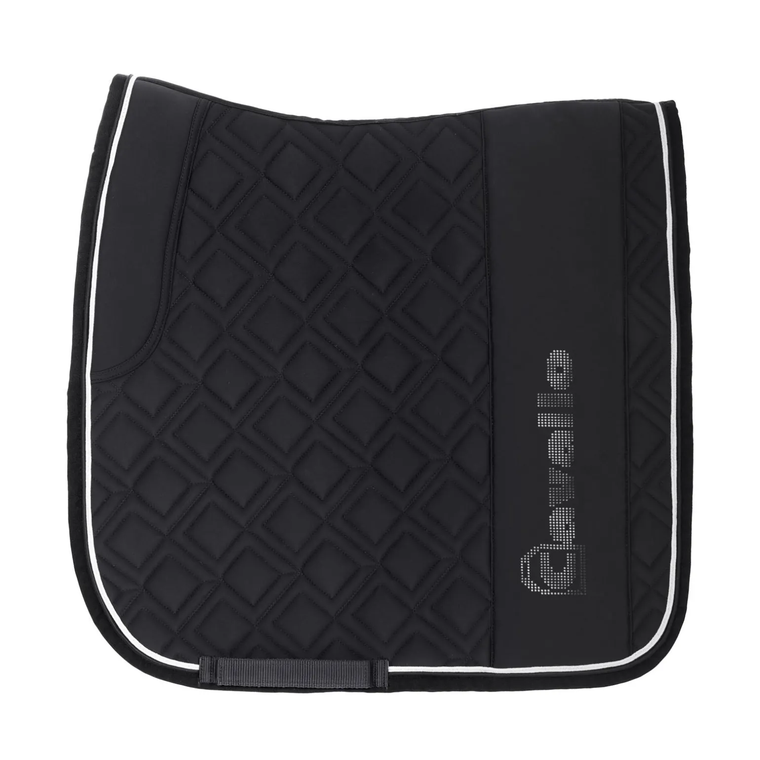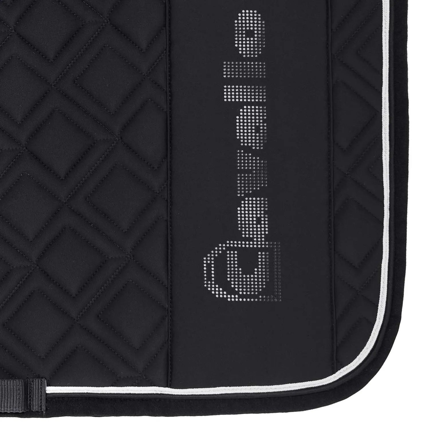 Eine sportliche Funktionsschabracke aus elastischem Softshell Material. Der Oberstoff aus Softshell ist besonders pflegeleicht. Allover mit Double Diamond Steppung versehen. Beidseitig an der Hinterseite mit einem vertikalen, glatten, tonalen Streifen versehen. Auf dem Streifen befindet sich ein perforiertes, großes, vertikales Cavallo Logo. Unter den Löchern des Cavallo Logos befindet sich schimmerndes Reflexmaterial. Die Verstärkung aus Memory Schaum an der Vorderseite gewährleistet eine optimale Lage unter dem Sattel. Eingerahmt wird die Schabracke von einem weißen Band mit schmalem silbernen Streifen. Das schnell trocknende und Feuchtigkeit transportierende Mesh-Futter ist besonders fellfreundlich und bietet höchsten Komfort. Eine formbeständige Wattierung ermöglicht der Schabracke eine perfekte Lage auf dem Pferderücken.