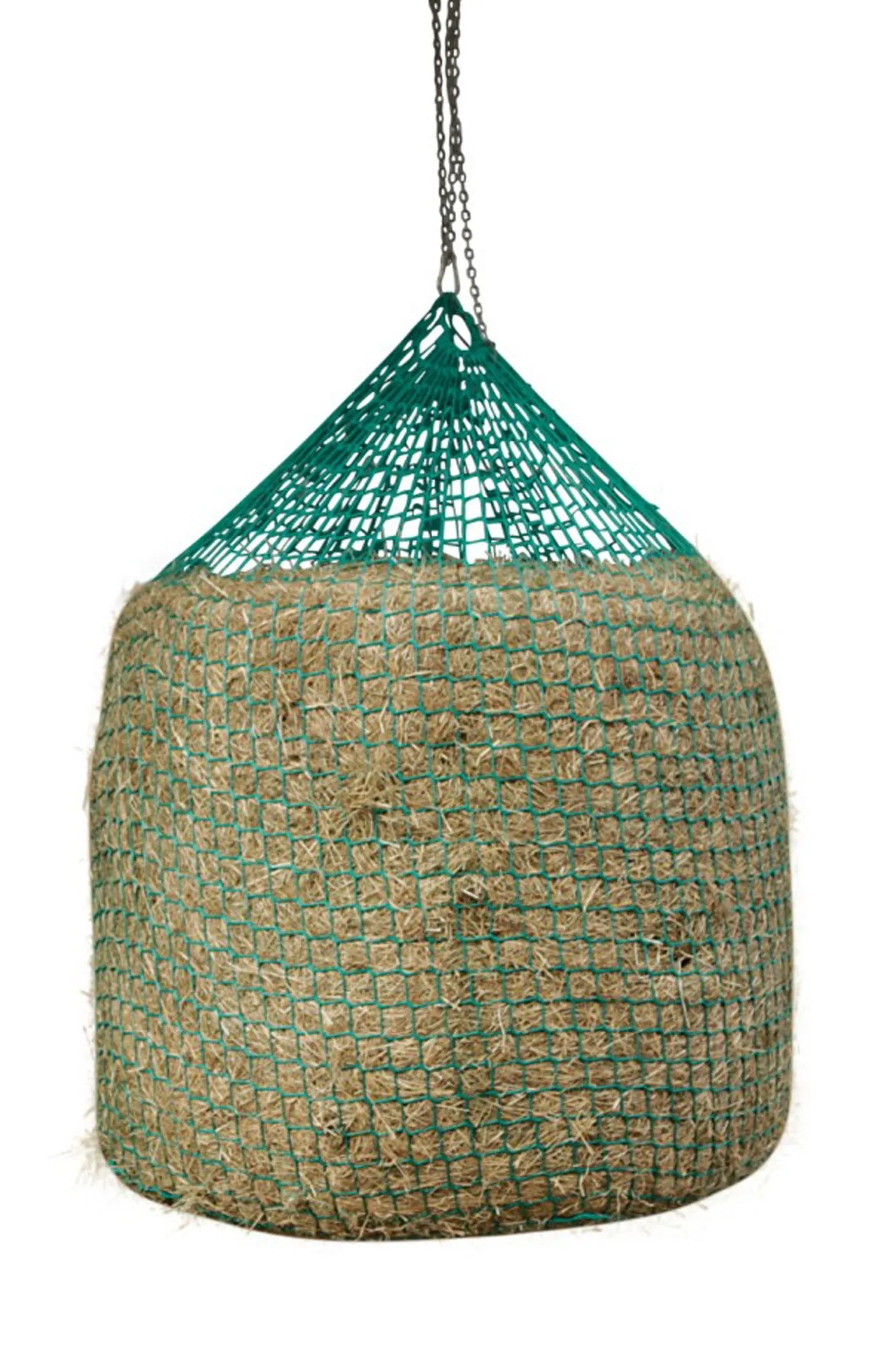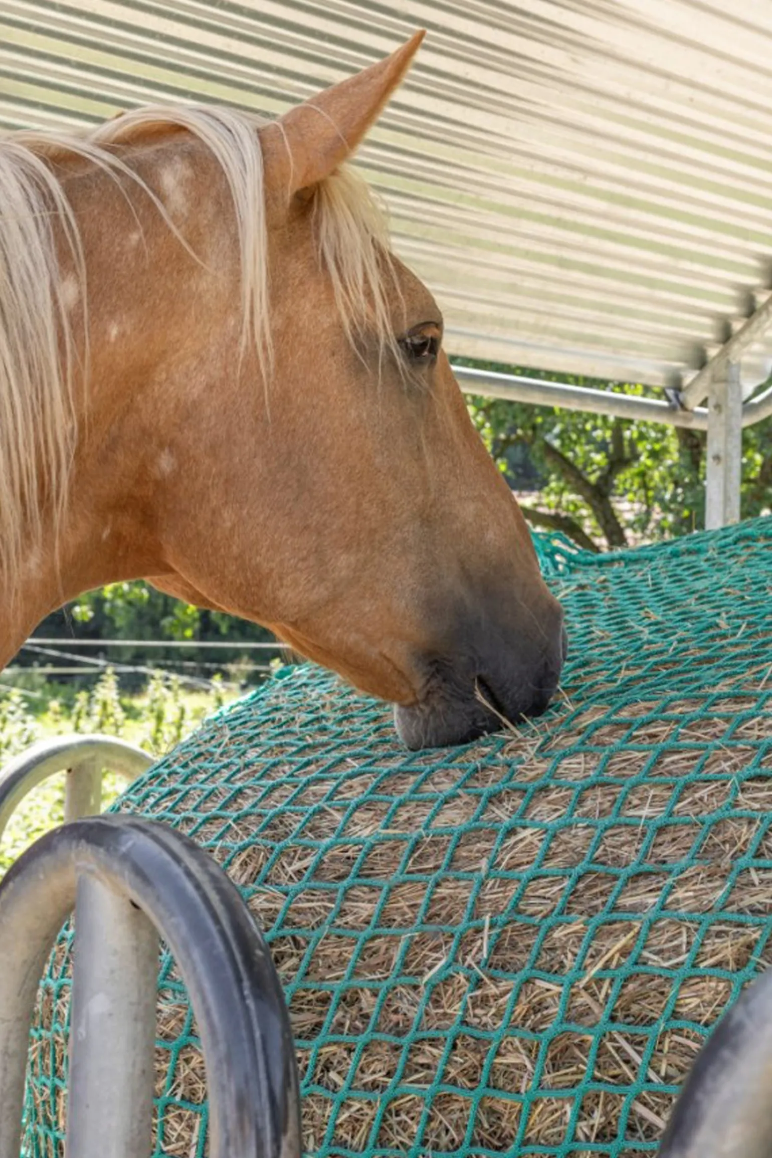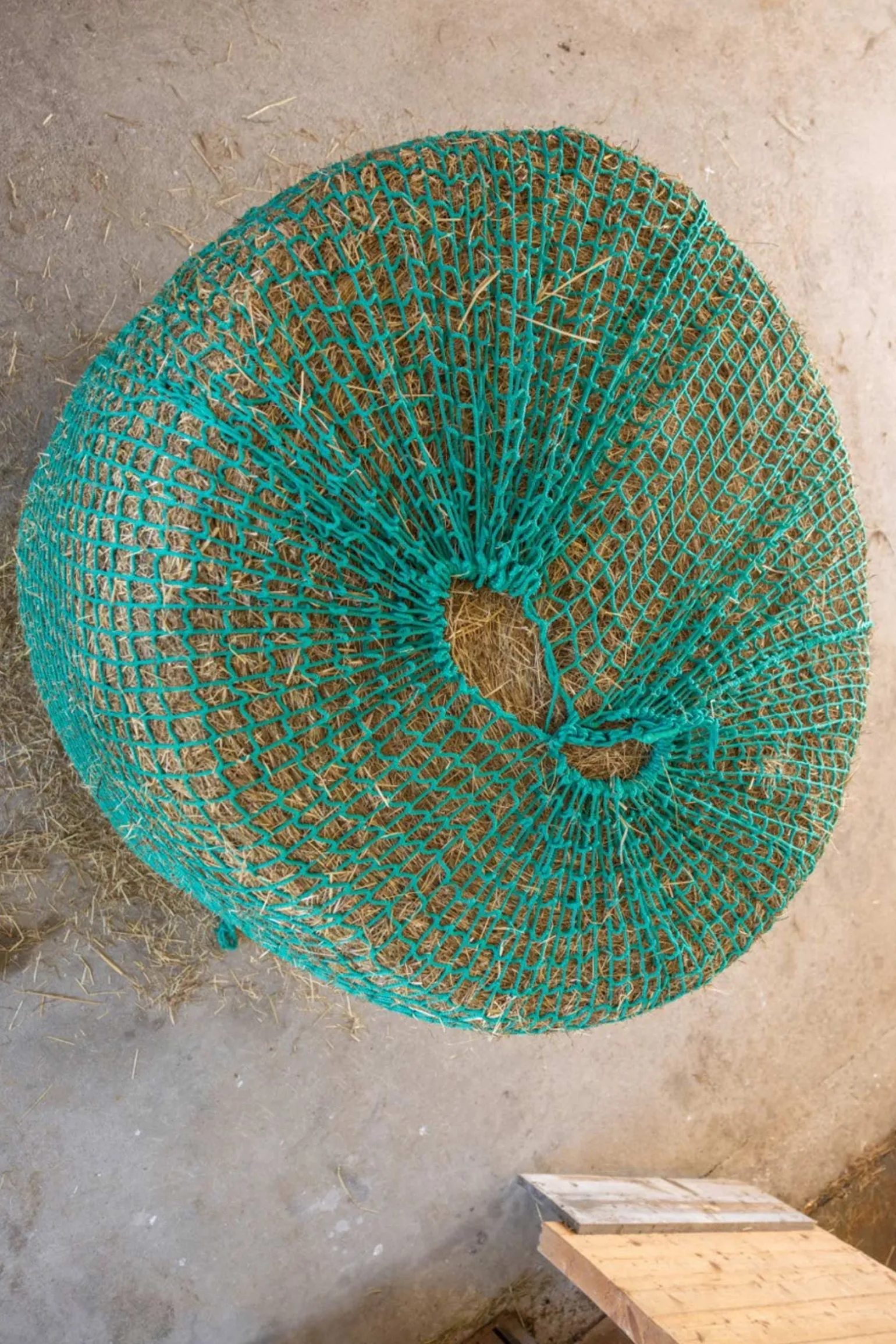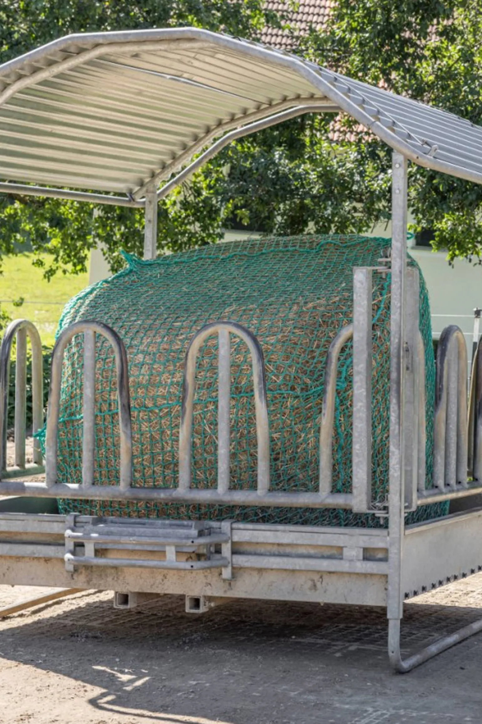 Hängbares Futternetz für Heu- und Silageballen zur fütterungssparenden Raufutterversorgung für Pferde.