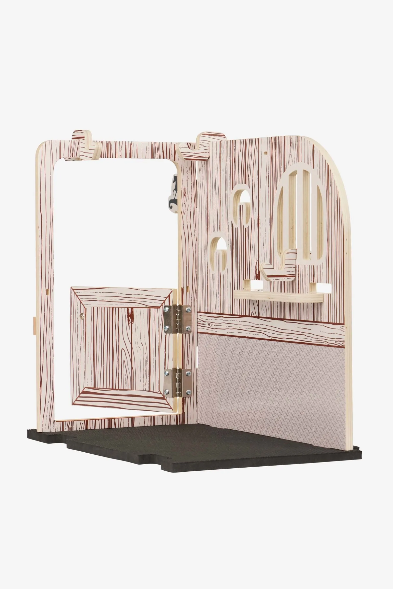 Die Teile umfassen eine klappbare Boxentür mit funktionalem Riegelverschluss, eine Bodenmatte aus Gummi, einen abnehmbarer Sattelhalter aus Holz, Trensenaufhänger und einen Deckenaufhänger.