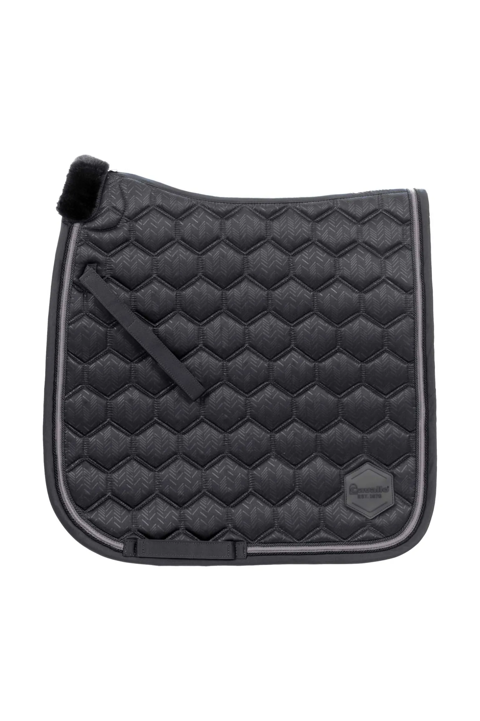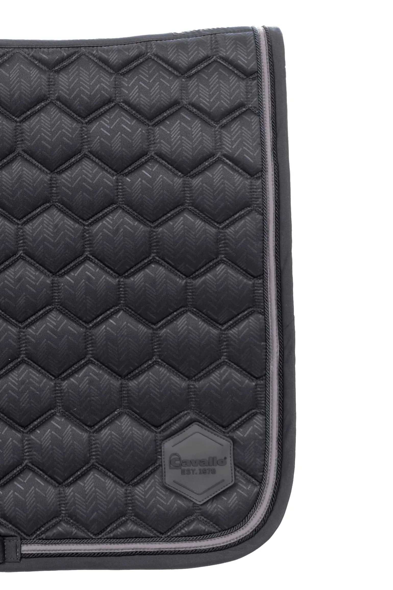 Eine sportliche Funktionsschabracke. Das mit einem Muster geprägte Obermaterial gibt der Schabracke einen besonderen Look. All Over mit einer Rautensteppung versehen. Ausgestattet mit einem Widerristpolster aus weichem Webpelz im Bereich der Sattelkammer. An den hinteren Ecken der Schabracke befinden sich tonige Cavallo Gummilabel. Eingerahmt wird die Schabracke von einem kontrastfarbenen Band, das umgeben ist von zwei schmalen Kordeln. Eine formbeständige Wattierung ermöglicht der Schabracke eine perfekte Lage auf dem Pferderücken. Die oberen und unteren Gurtstrupfen sind mit einem Klettverschluss zu fixieren.
