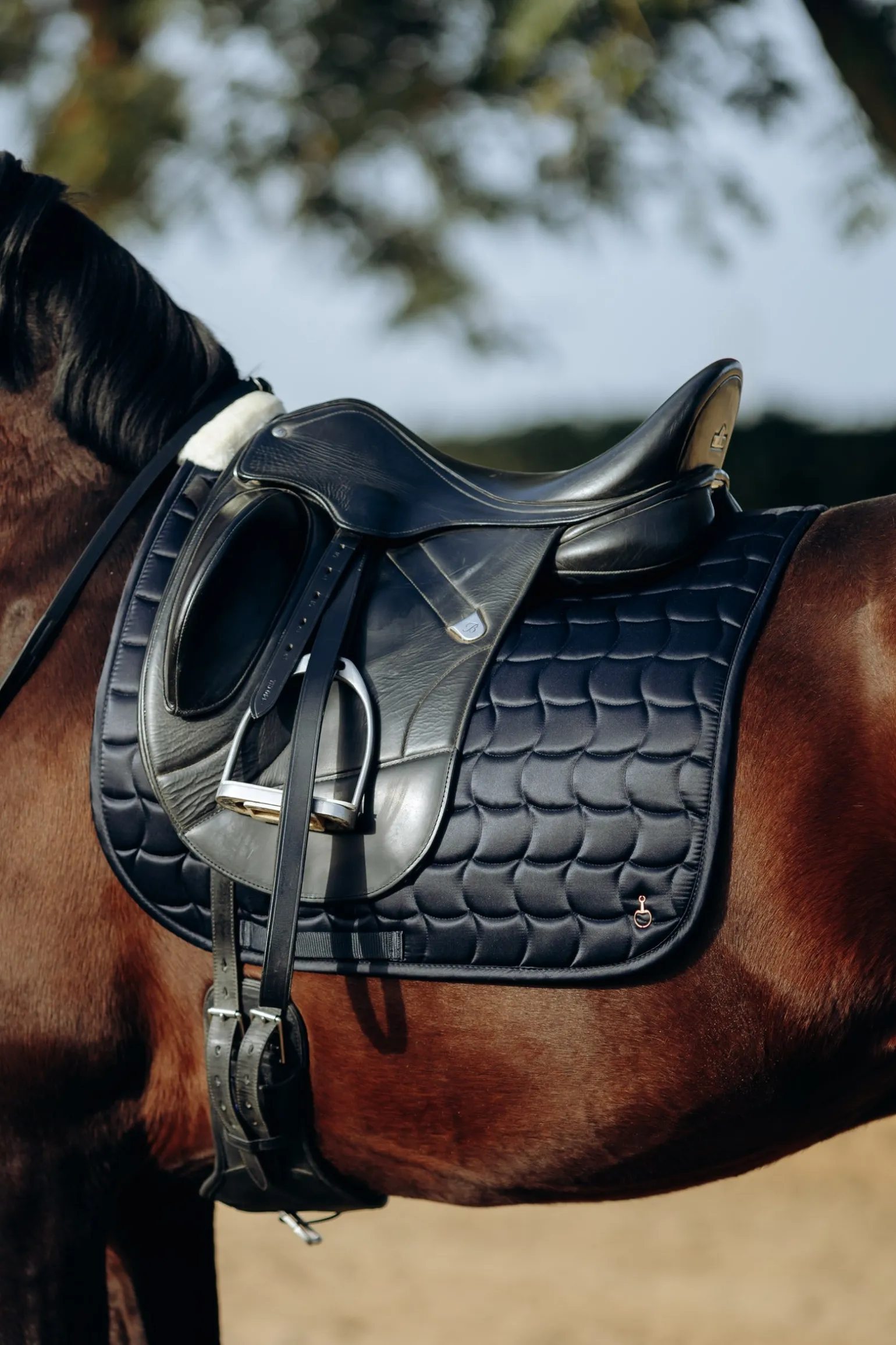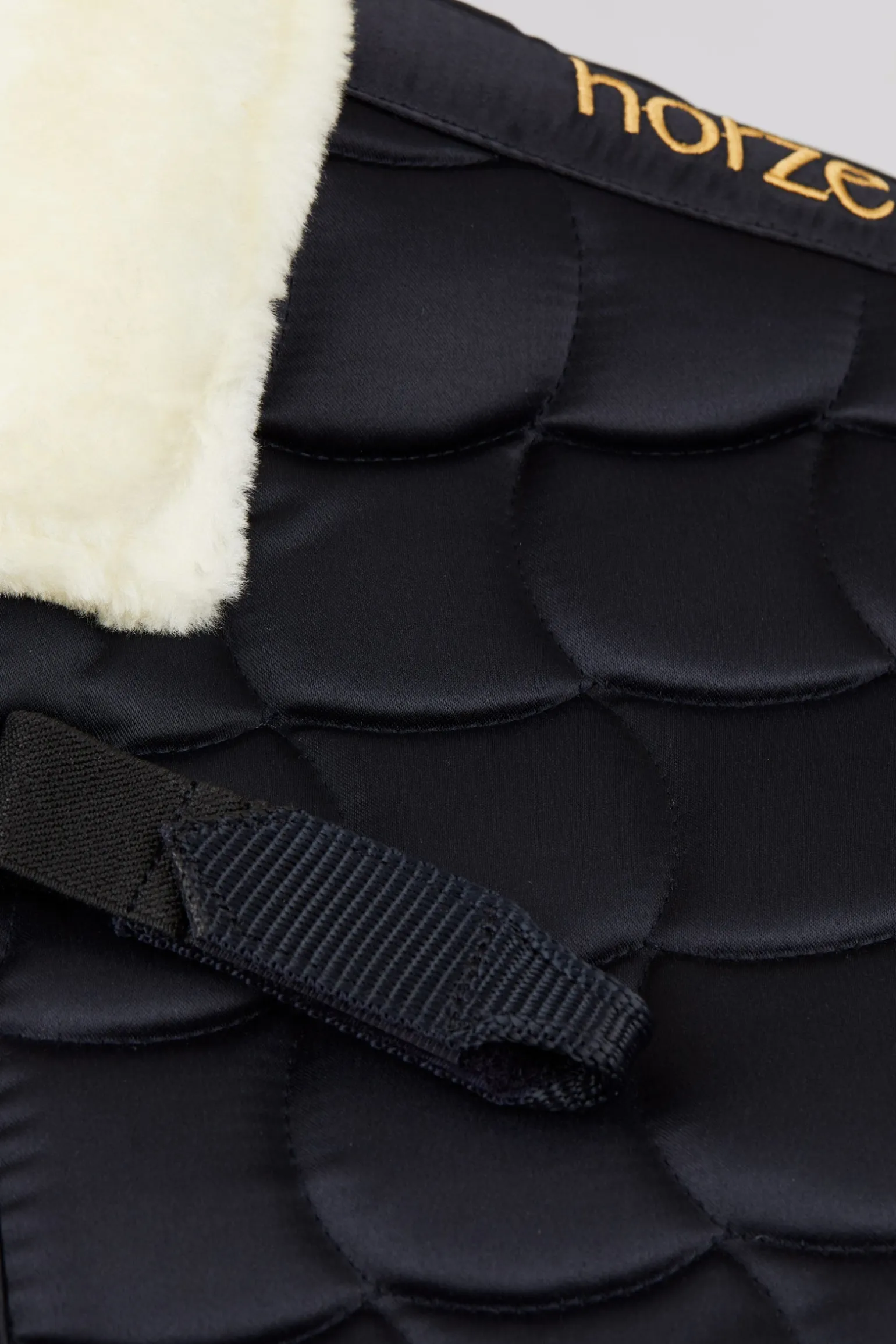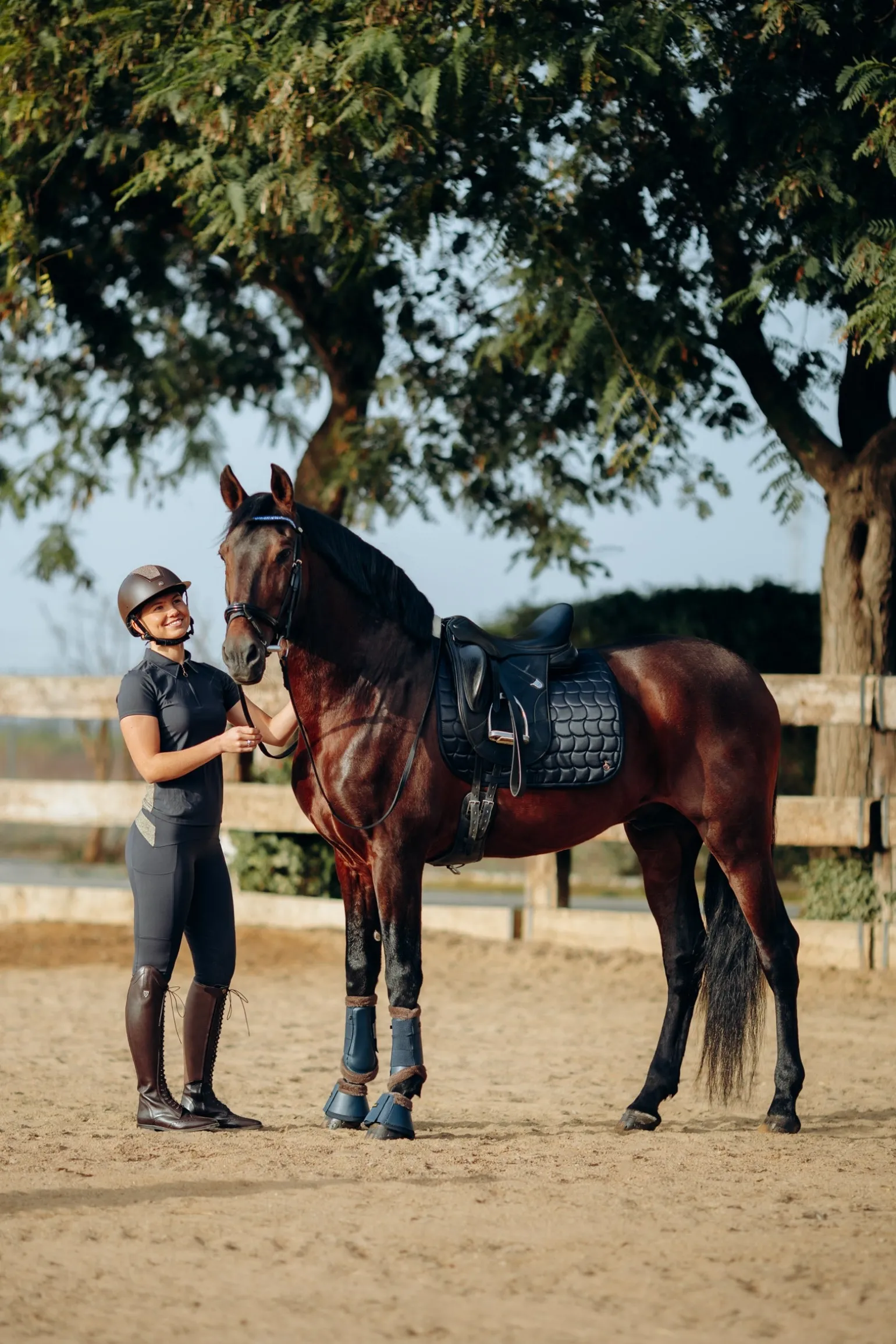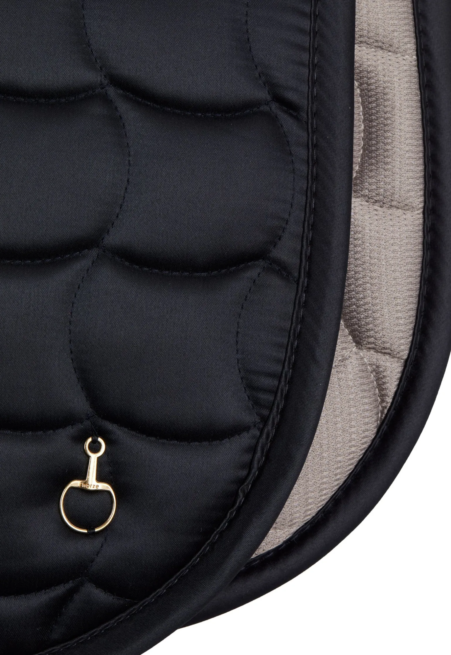 Die Horze Houston Schabracke ist mit einem atmungsaktiven Futter ausgestattet, das Feuchtigkeit ableitet. Die Wellensteppung sorgt für Komfort unter dem Sattel, und das Kunstfell am Widerrist ist besonders weich. Die gedeckten Farben sind zeitlos und passen gut zu deinem Sattelzeug. Diese Schabracke ist auch im Allzweckschnitt erhältlich. Kombiniere sie mit den Horze Houston Gamaschen für einen kompletten Look!