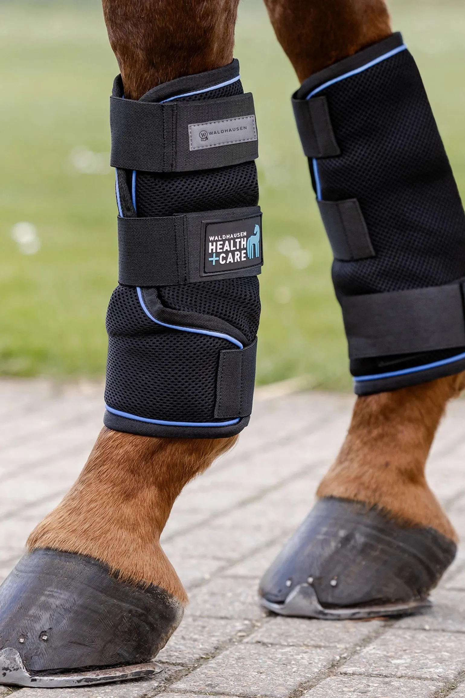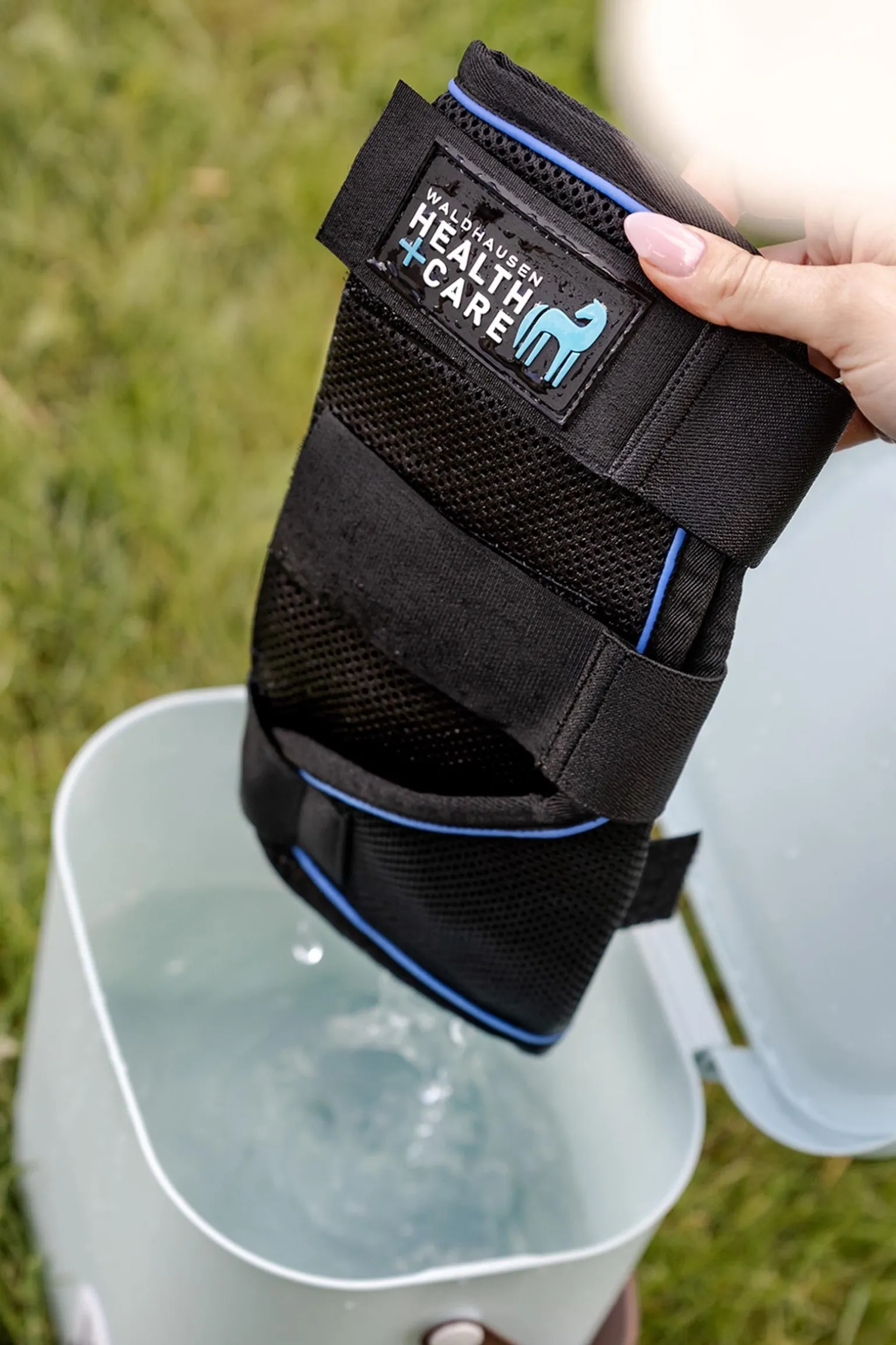 Passend zur Waldhausen Health + Care Ice Layer Kühldecke bieten die Waldhausen Health + Care Ice Layer Gamaschen einen schonenden Kühleffekt für angestrengte Pferdebeine. Hitze, intensive Trainingseinheiten und körperliche Beschwerden können belastend für die Pferdegesundheit sein. Die Waldhausen Health + Care Ice Layer Gamaschen sind eine sinnvolle Unterstützung entgegen diesen Belastungen. Die Waldhausen Health & Care Ice Layer Gamaschen in einen Wassereimer tauchen, bis sich das Material vollgesogen hat, anschließend auswringen und um das Pferdebein legen. Dank der speziellen Materialien verdunstet das Wasser langsam und entzieht dabei Wärme – für einen angenehmen Kühleffekt. Für eine entspannende Anwendung sollte das Pferd in Ruhe stehen, sich nicht frei bewegen und nicht unbeaufsichtigt sein.