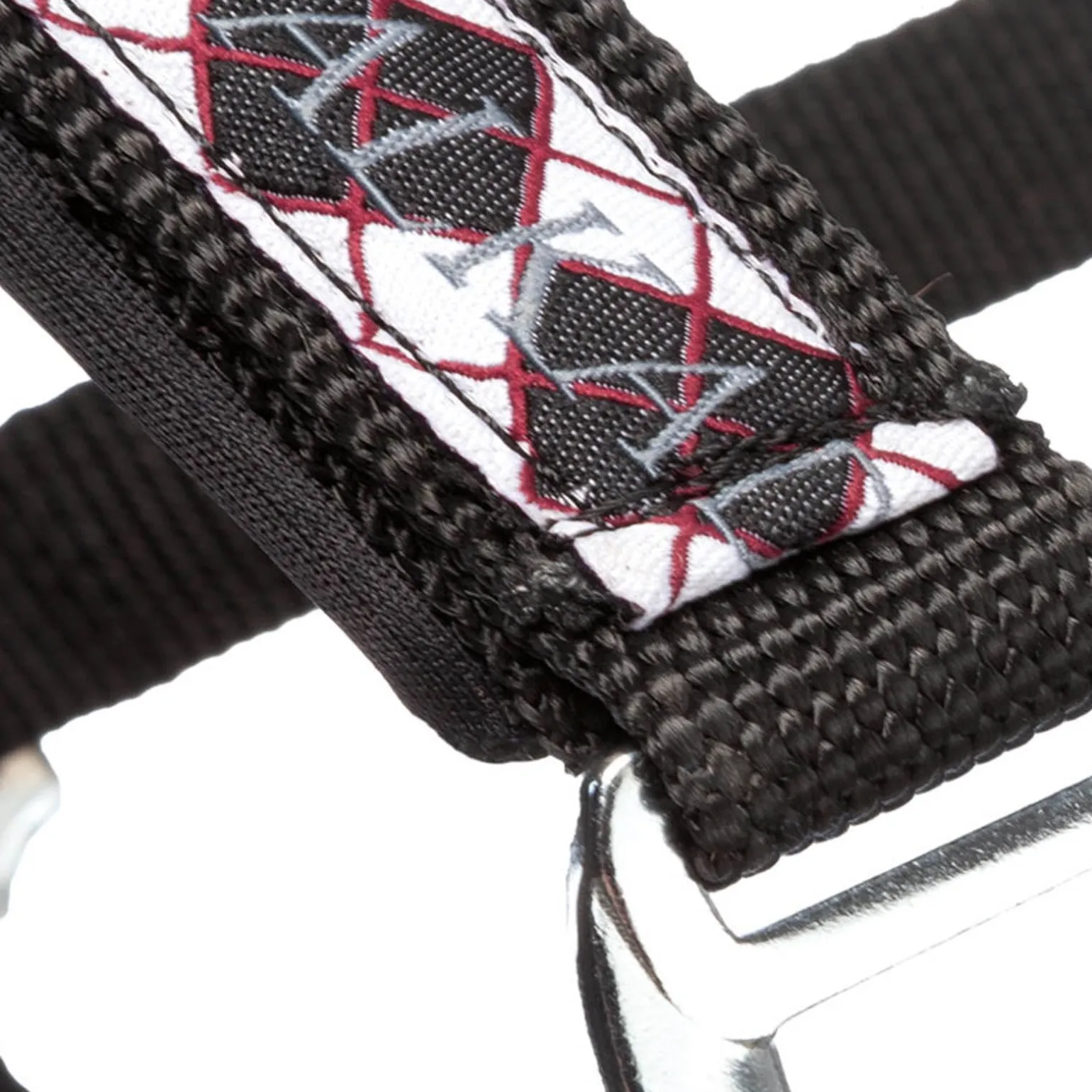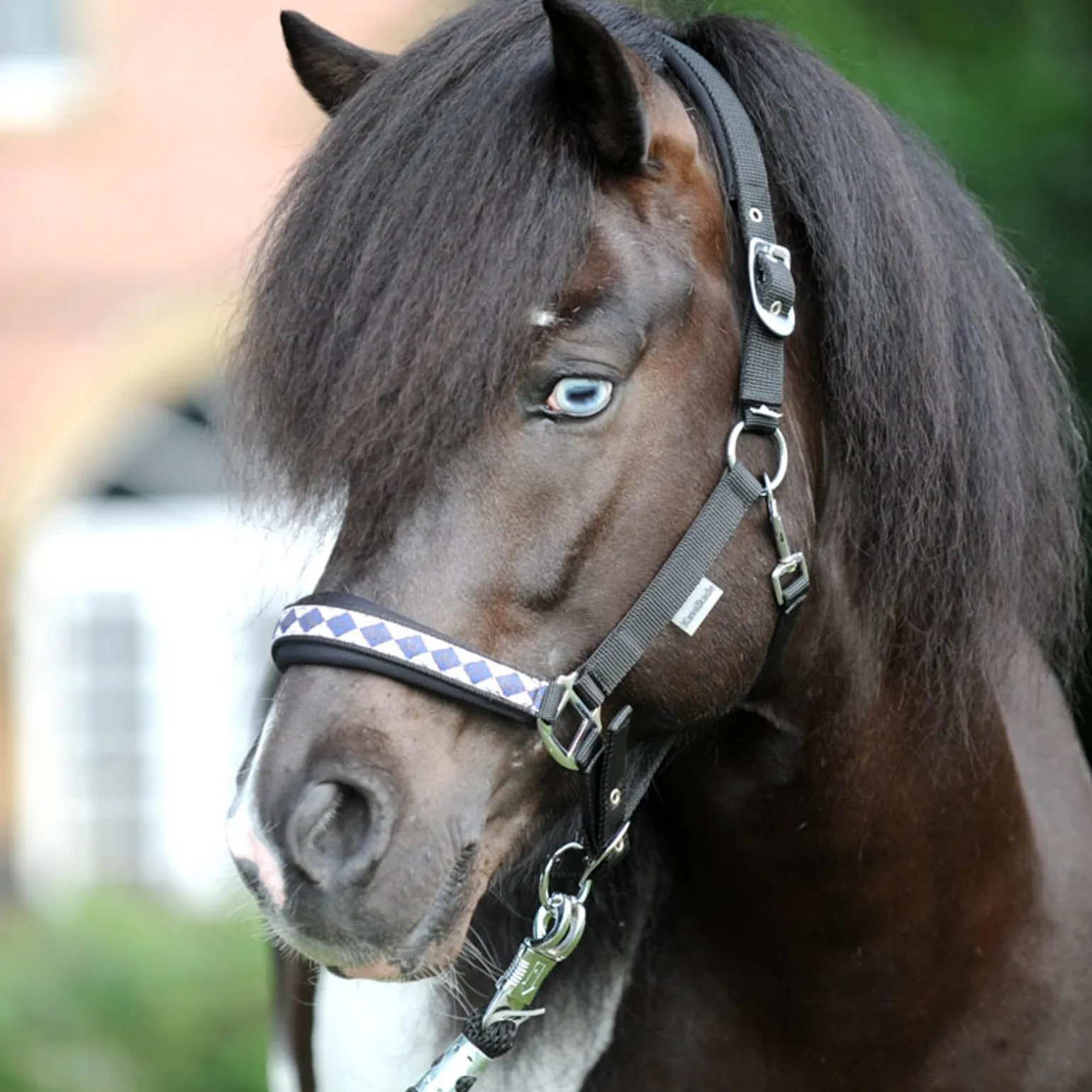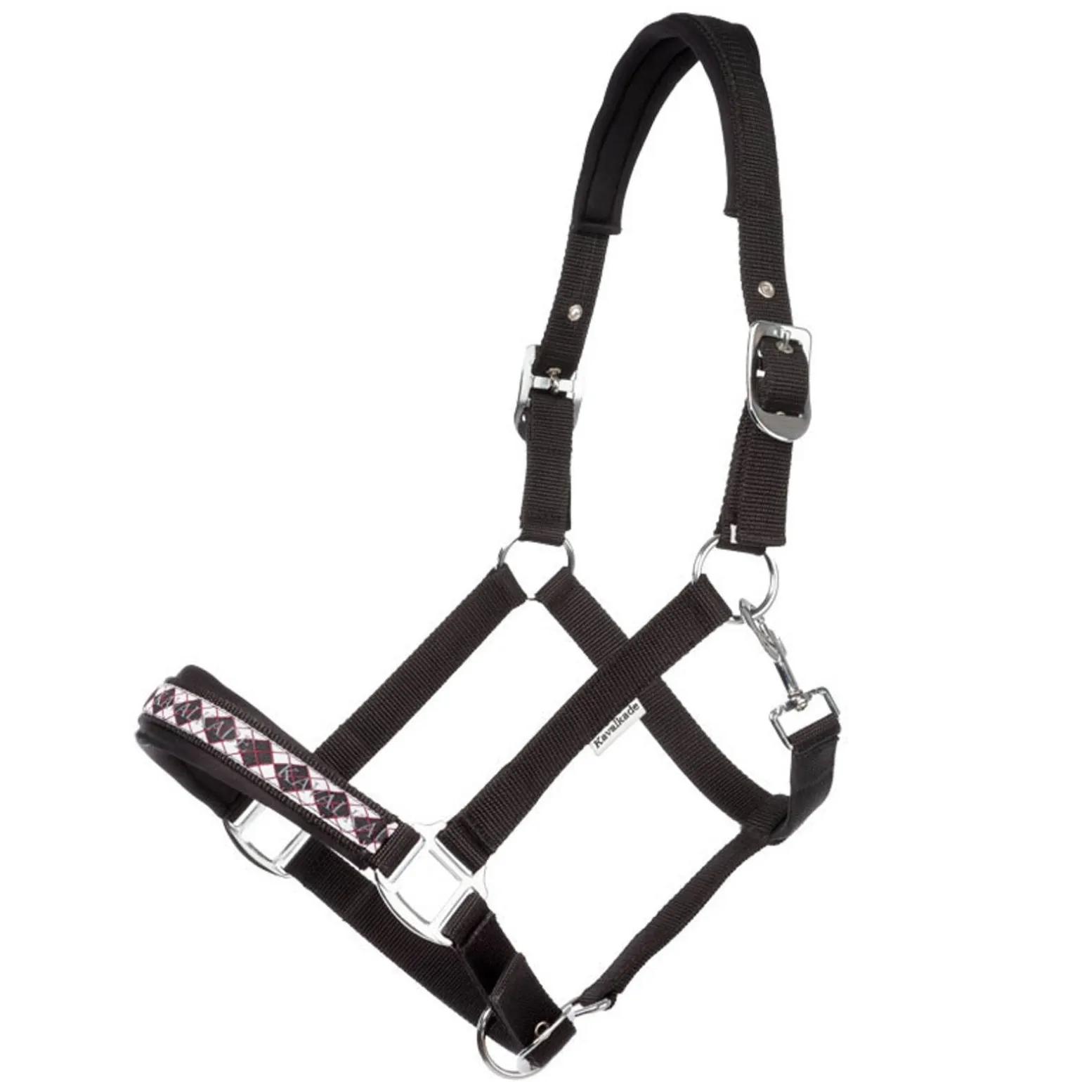 Das Nasenzierband im Karodesign ist farblich abgestimmt und gepolstert. Das Genick und die Nase sind weich gepolstert. Das Halfter ist beidseitig verstellbar.