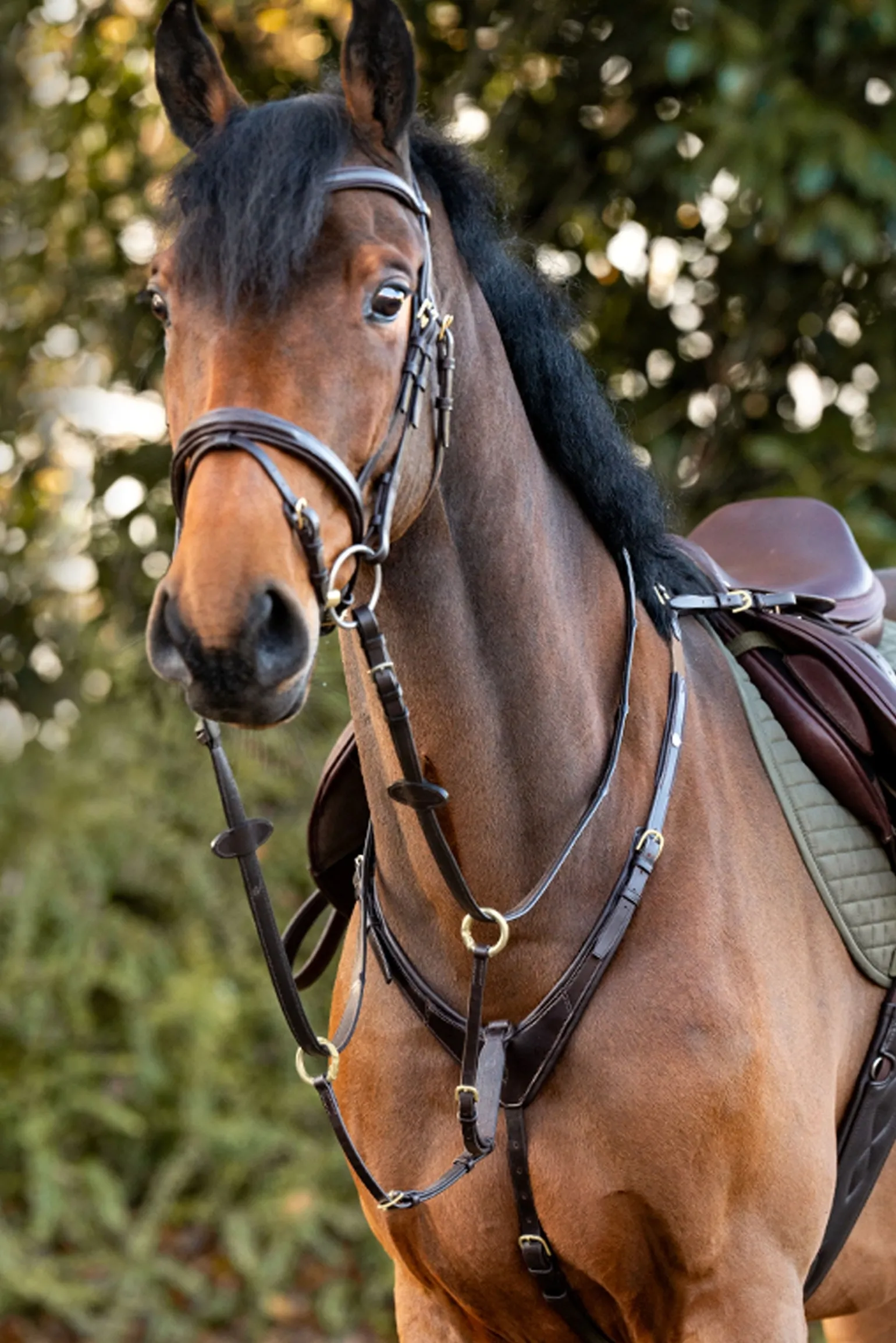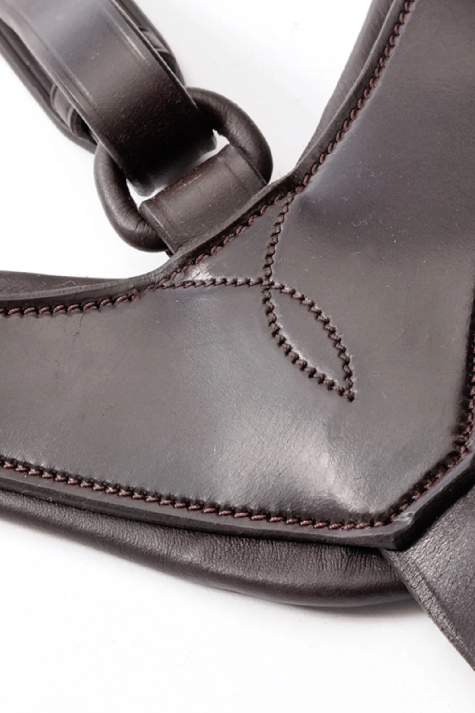 Entwickelt und getestet von und mit Kavalkades Partner und Profi-Vielseitigkeitsreiter „Jérôme Robiné“. Das 2-Punkt Vorderzeug „Jérôme“ aus hochwertig geöltem europäischem Leder wird ausschließlich an den Seiten des Sattels befestigt, um das Risiko des Einfädelns mit den Vorderhufen zu verhindern. Das breite und weiche Brustpolster sorgt durch die seitliche Befestigung für genügend Halt des Sattels und wirkt ein nach hinten rutschen entgegen. Dabei gibt die anatomische Form und der Elast an den Seitenriemen dem Pferd den Freiraum, den es beim Springen und in der Vielseitigkeit benötigt: Genügend Beinfreiheit und kein Einengen der Schulter. Das weiche Widerristpolster und die unterlegten Ringe und Schnallen geben dem Pferd ebenfalls einen besonderen Komfort. Die Kontrastnähte und der Dekostick auf dem Brustpolster mit Kavalkade-Emblem lassen das Vorderzeug, trotz seiner Funktionalität, elegant aussehen. Geöltes Leder ist pflanzlich gegerbt und hat seine natürliche Maserung. Es wird während des Gerbungsprozesses mit hochwertigen Ölen versehen, so dass es sehr weich sowie wasser- und schmutzabweisend wird. Dadurch bleibt das Leder lange geschmeidig, strapazierfähig und pflegeleicht. Die besondere Patina, die sich bei Benutzung entwickelt, ist dabei keinesfalls ein Makel, sondern verleiht dem Produkt eine unverwechselbare Persönlichkeit, Individualität und Charakter.