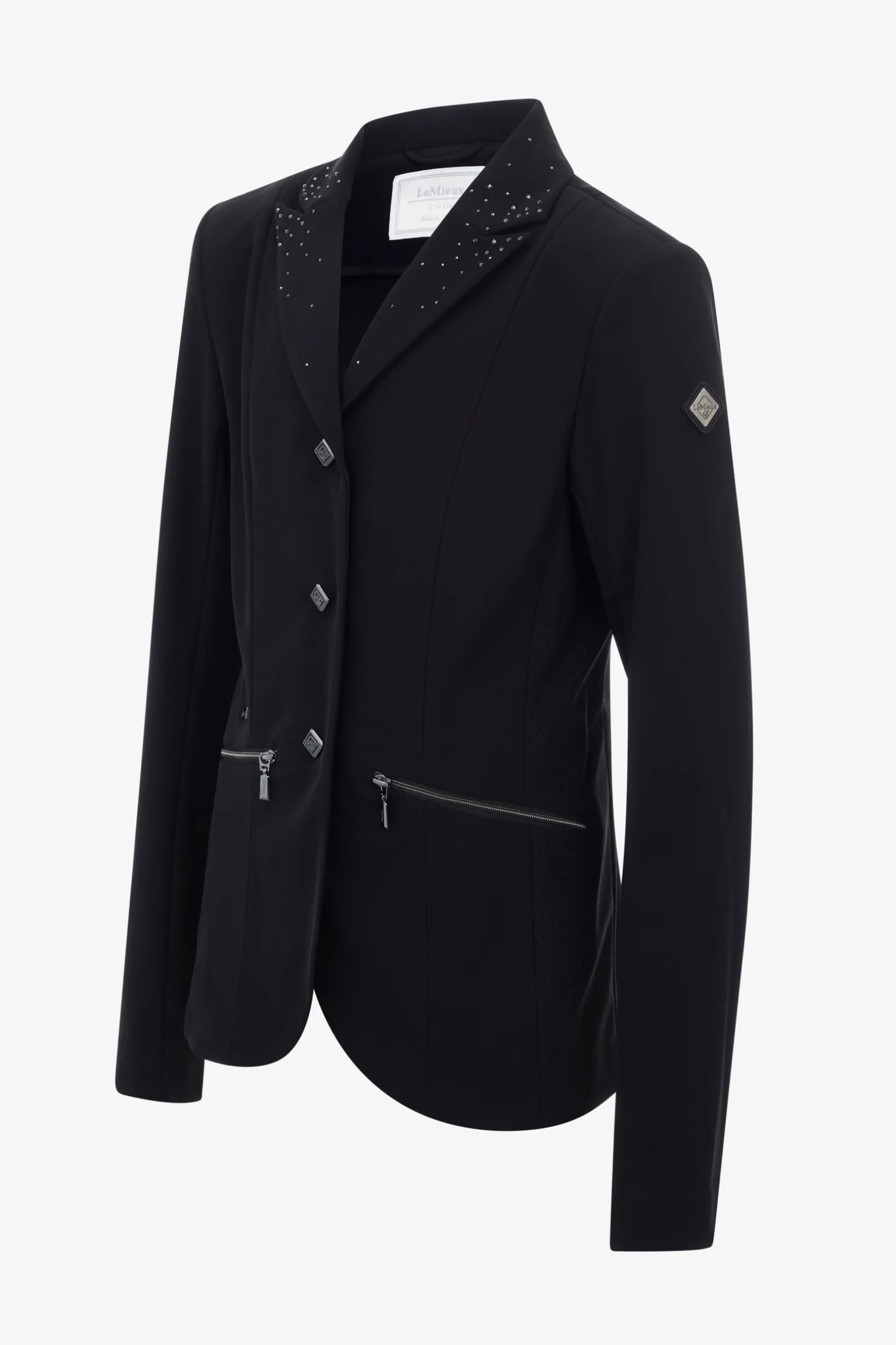 Das charakteristische LeMieux Premium Turnierjacket, angepasst für junge Reiter, besticht durch raffinierte Kristalldetails am Kragen, Rückenband und an den geteilten Enden des Rückenschlitzes. Ein langlebiger Frontreißverschluss und unverwechselbare LeMieux-Druckknöpfe unterstreichen die hochwertige Verarbeitung. Perforierte seitliche Belüftungsschlitze mit einer Innenfütterung aus leistungsstarkem Air-Mesh sorgen für Komfort und Atmungsaktivität. Groß dimensionierte seitliche Reißverschlusstaschen bieten ausreichend Stauraum. Feine LeMieux-Markendetails an Hüfte und Arm runden das Design ab.