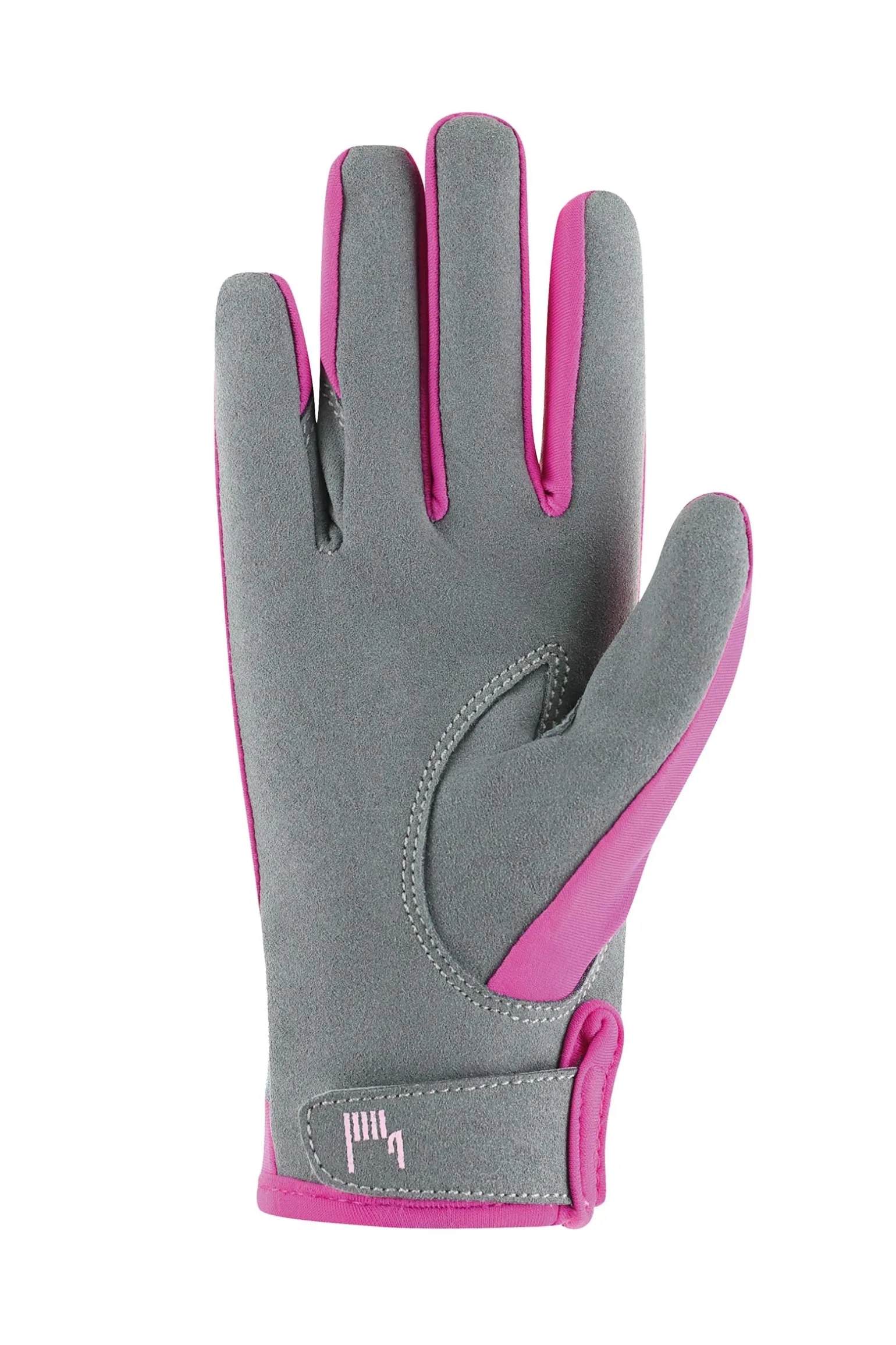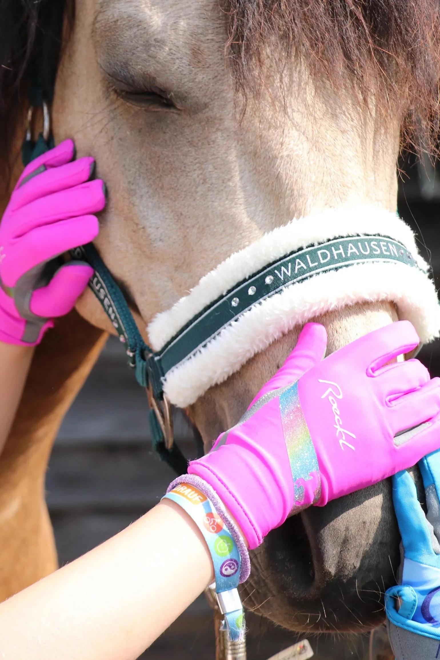 Eine Hommage an die Spanische Hofreitschule: Pferdebegeisterte Kinder, die schon immer vom berühmten Luftsprung „Kapriole“ geträumt haben, finden im KAPRIOLE den perfekten Partner. Das elastische Material auf dem Handrücken passt sich allen Bewegungen geschmeidig an – auch denen eines springenden Pferdes, wie auf dem glitzernden Band zu sehen ist. Die Innenhand besteht aus weichem, flexiblem und zugleich äußerst strapazierfähigem DURADERO Synthetik-Wildleder, das optimalen Grip und die benötigte Sensitivität für die Zügelführung (auch mit Gummibesatz) ermöglicht.