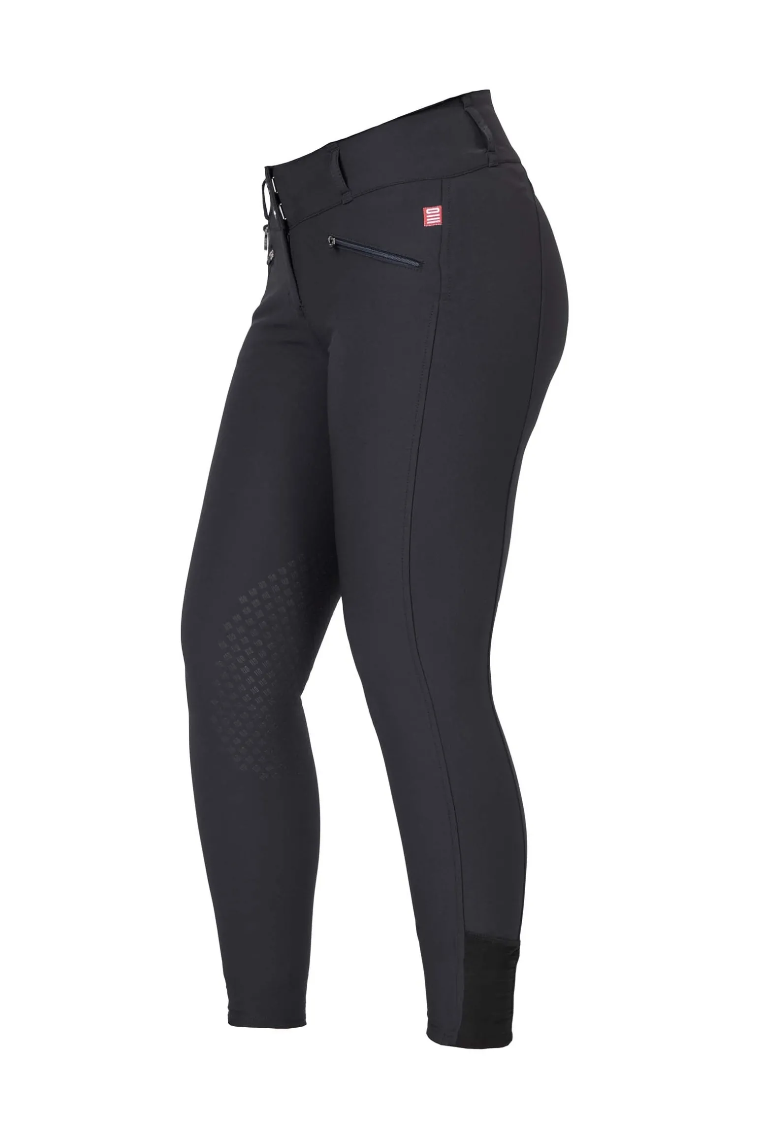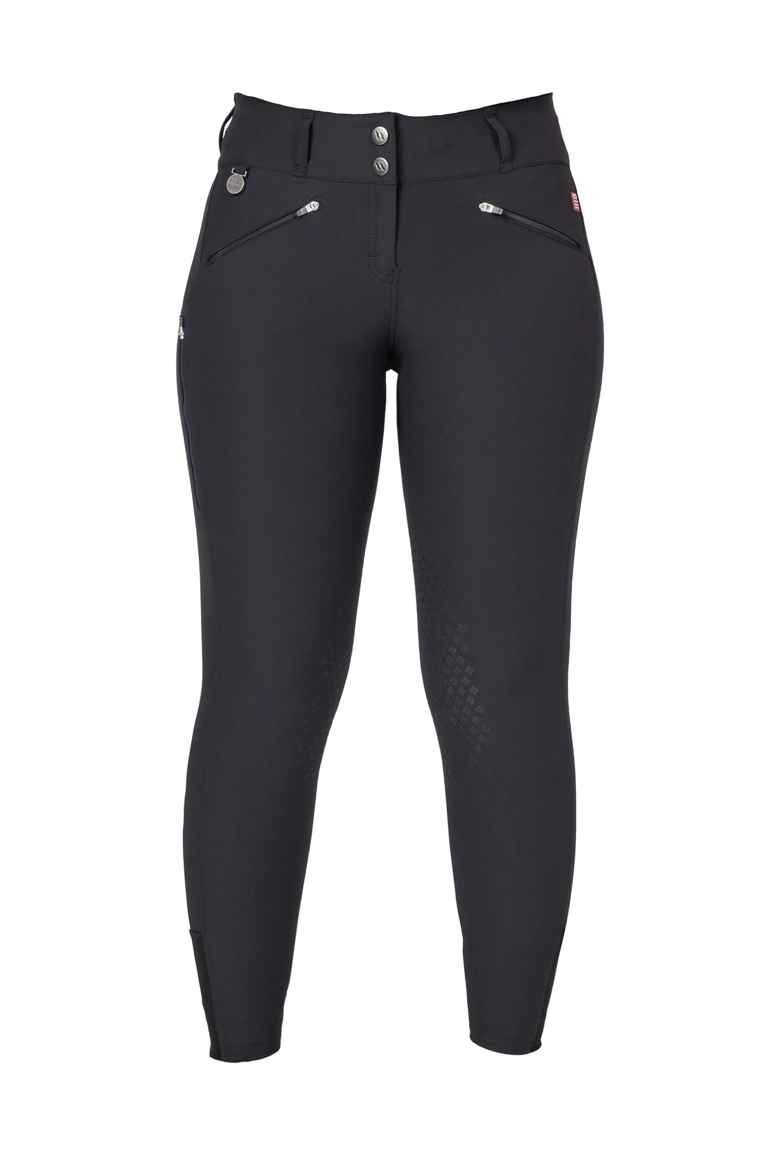 Die Taille ist mittelhoch mit einem elastischen und bequemen breiten Bund. Er passt sich den Konturen des Körpers an und gibt dort zusätzlichen Halt, wo er beim Reiten am meisten gebraucht wird. Der Kniebesatz hat ein innovatives und langlebiges Grip-System für Stabilität und Halt im Sattel. Auf der Vorderseite befinden sich Taschen mit einem dünnen Futter aus atmungsaktivem Material, eine intelligente Handytasche und zwei Vordertaschen mit Reißverschlüssen.