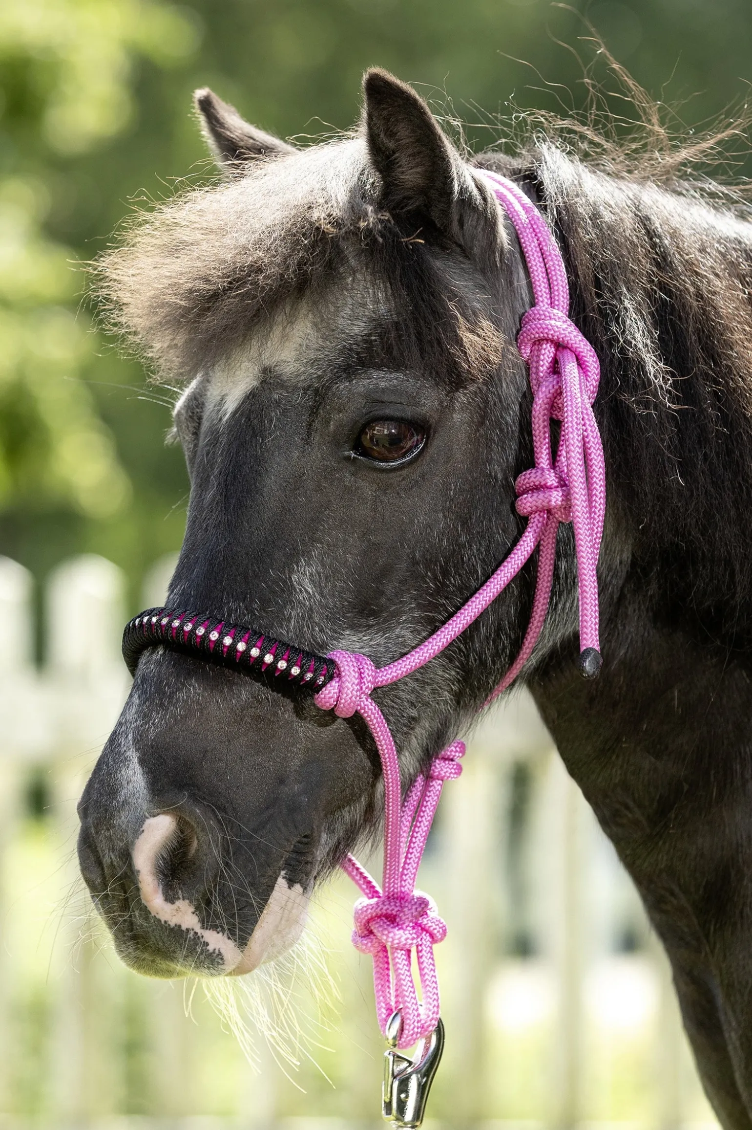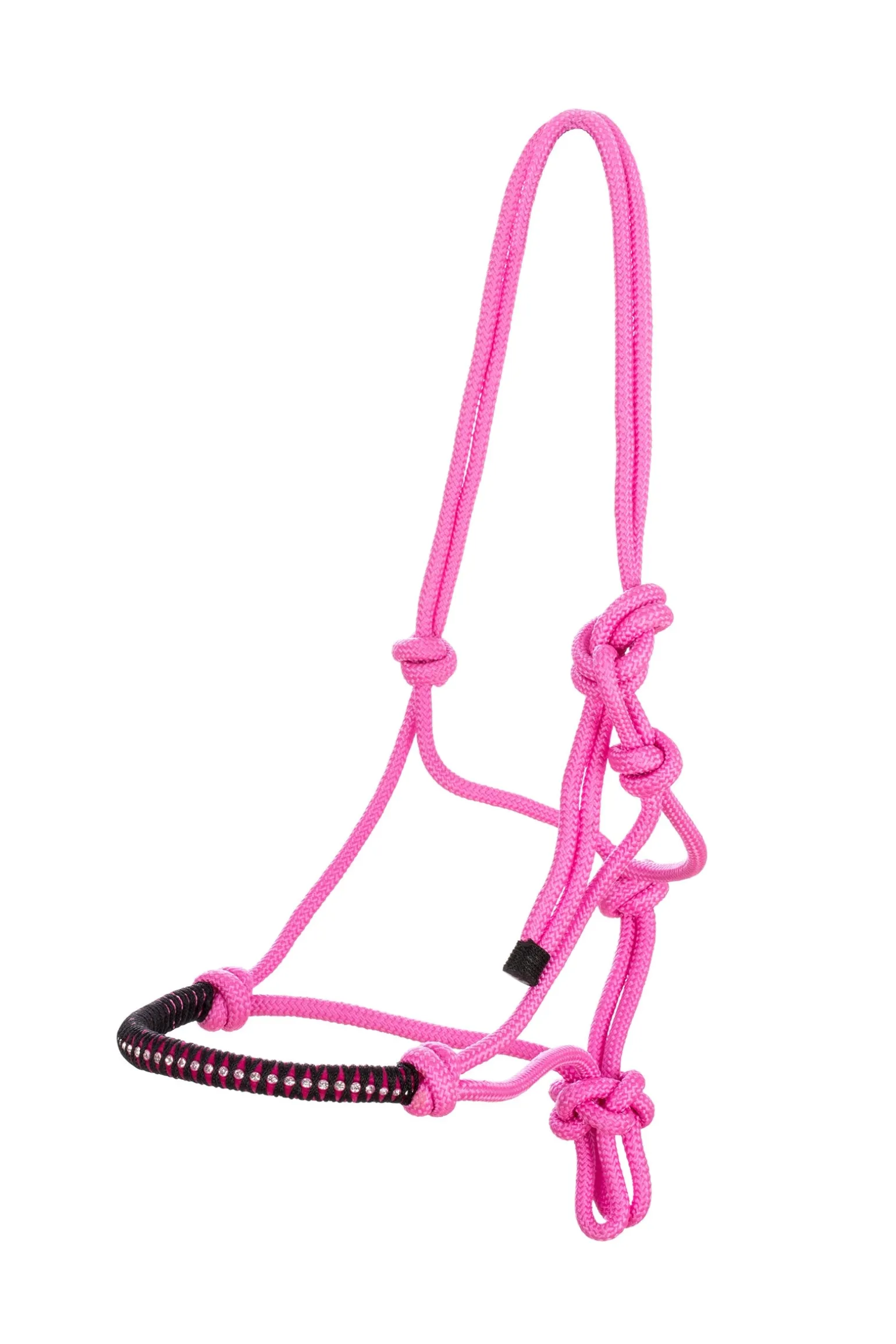 Knotenhalfter, leichtes Gewicht. Perfekt für Horsemanship, Bodenarbeit und Trekking. Die Knoten können individuell angepasst werden. Das Nasenband ist in Kontrastfarbe geflochten und mit Glitzersteinen besetzt.
