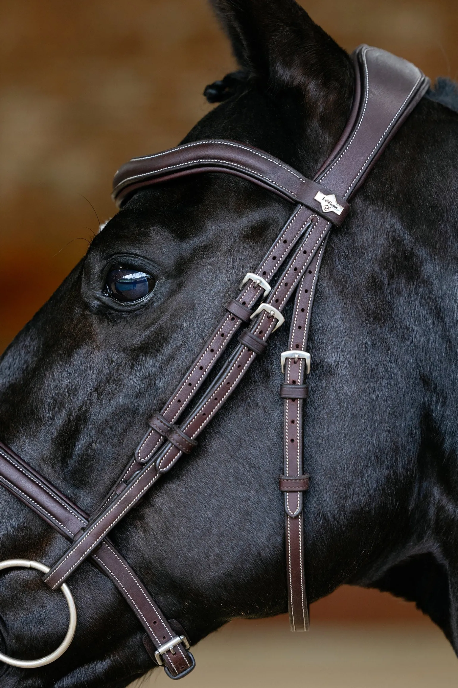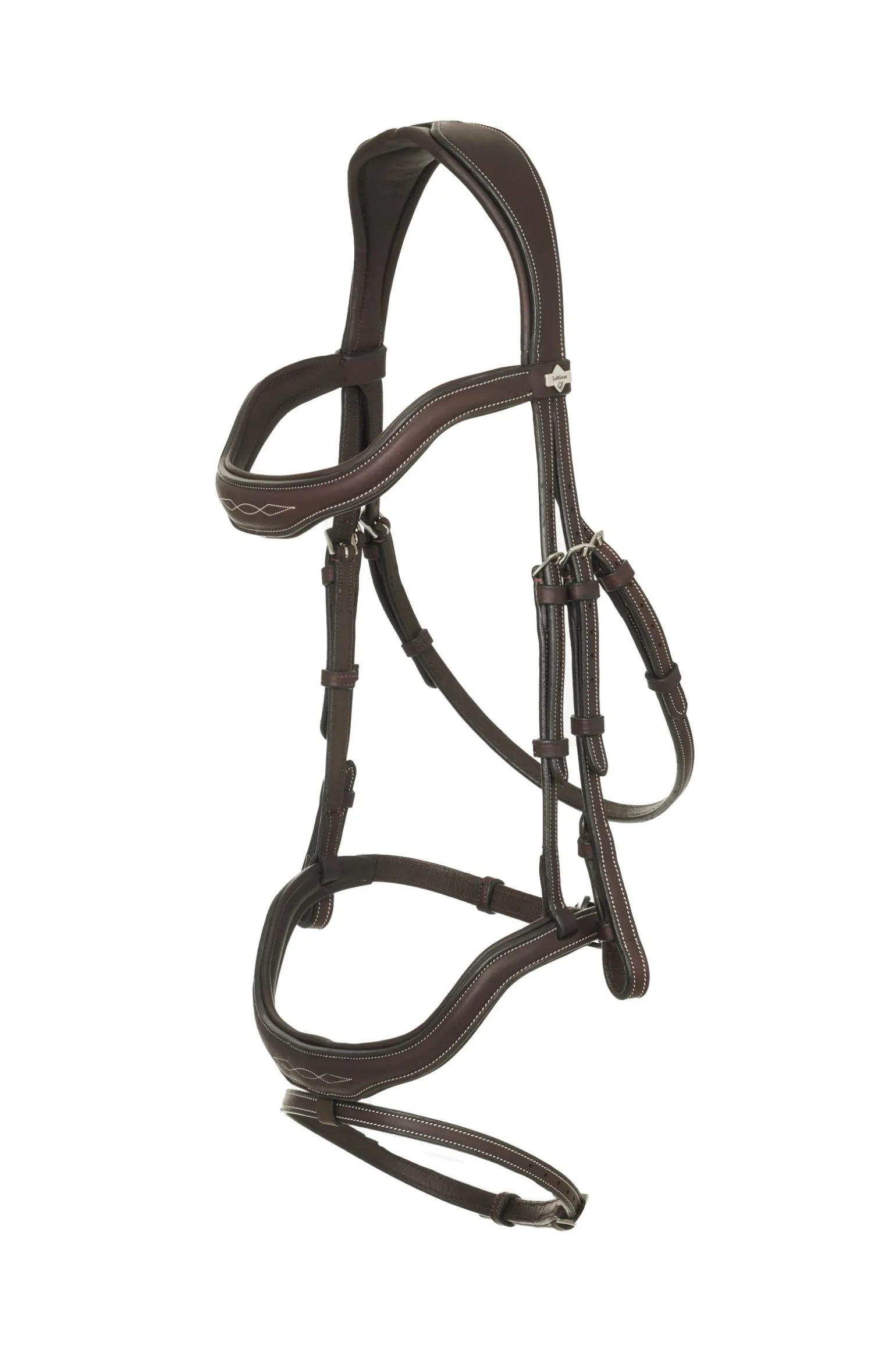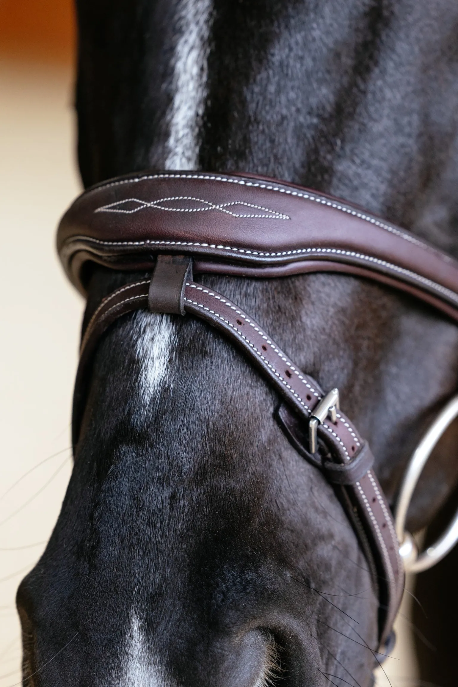 Das Kudos Contour Zaumzeug steht für echte Qualität – mit elegant geformtem, gepolstertem Stirn- und Nasenriemen samt dekorativer Ziernaht und einem abnehmbaren Sperrriemen. Die dezente Schlaufe für den Sperrriemen liegt bündig im Nasenriemen und lässt sich bei Bedarf vollständig entfernen, wodurch sich dieser schöne Trensenzaum für viele Pferde eignet. Für maximalen Komfort werden sensible Druckpunkte ausgespart und eine gute Durchblutung ermöglicht. Das anatomisch geformte Genickstück mit weich gepolstertem Ausschnitt im Ohren- und Nackenbereich trägt zur gleichmäßigen Druckverteilung bei.