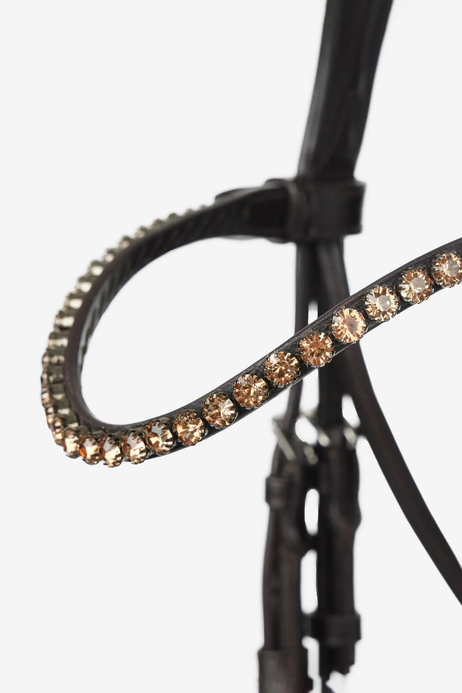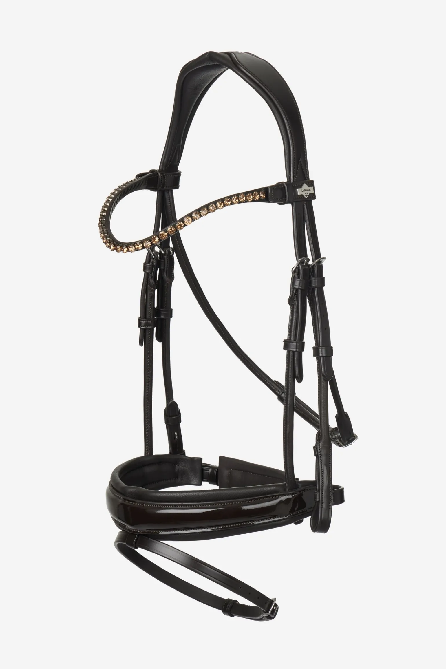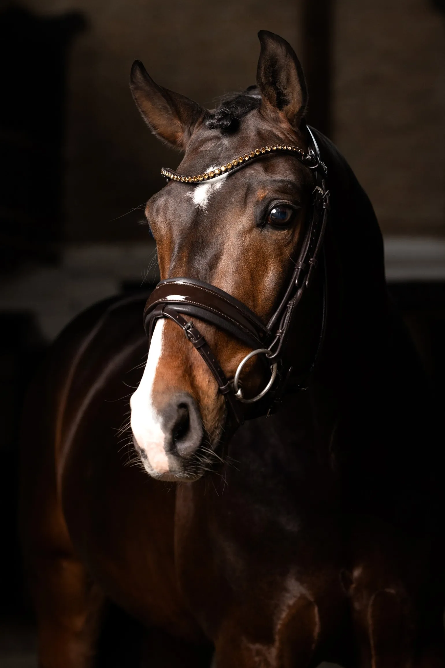 Diese spezielle Dressurkandare wird aus hochwertigem, vorgeöltem italienischem Leder gefertigt und verfügt über rundgenähte Elemente sowie einen abnehmbaren Sperrriemen. Das anatomisch geformte, gepolsterte Genickstück bietet angenehme Freiheit hinter den Ohren und verteilt den Druck gleichmäßig über das Genick. Das abnehmbare Stirnband mit Clincher-Details ist geschwungen, weich gepolstert und mit Kristallen verziert – für eleganten Tragekomfort. Das Reithalfter mit Lackbesatz und Umlenkverschnallung ist besonders gut gepolstert. Rollenschnallen am Kinnriemen und Sperrriemen ermöglichen eine präzise Anpassung – ideal für eine feine Einwirkung. Eine Kandare mit Ausdruck, die deinem Auftritt eine dezente, turniergerechte Eleganz verleiht.