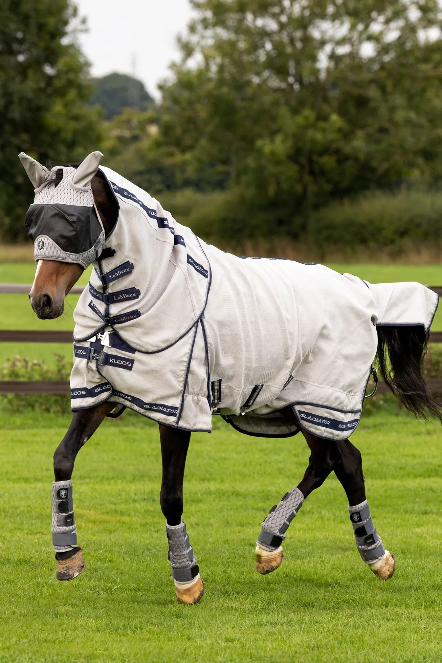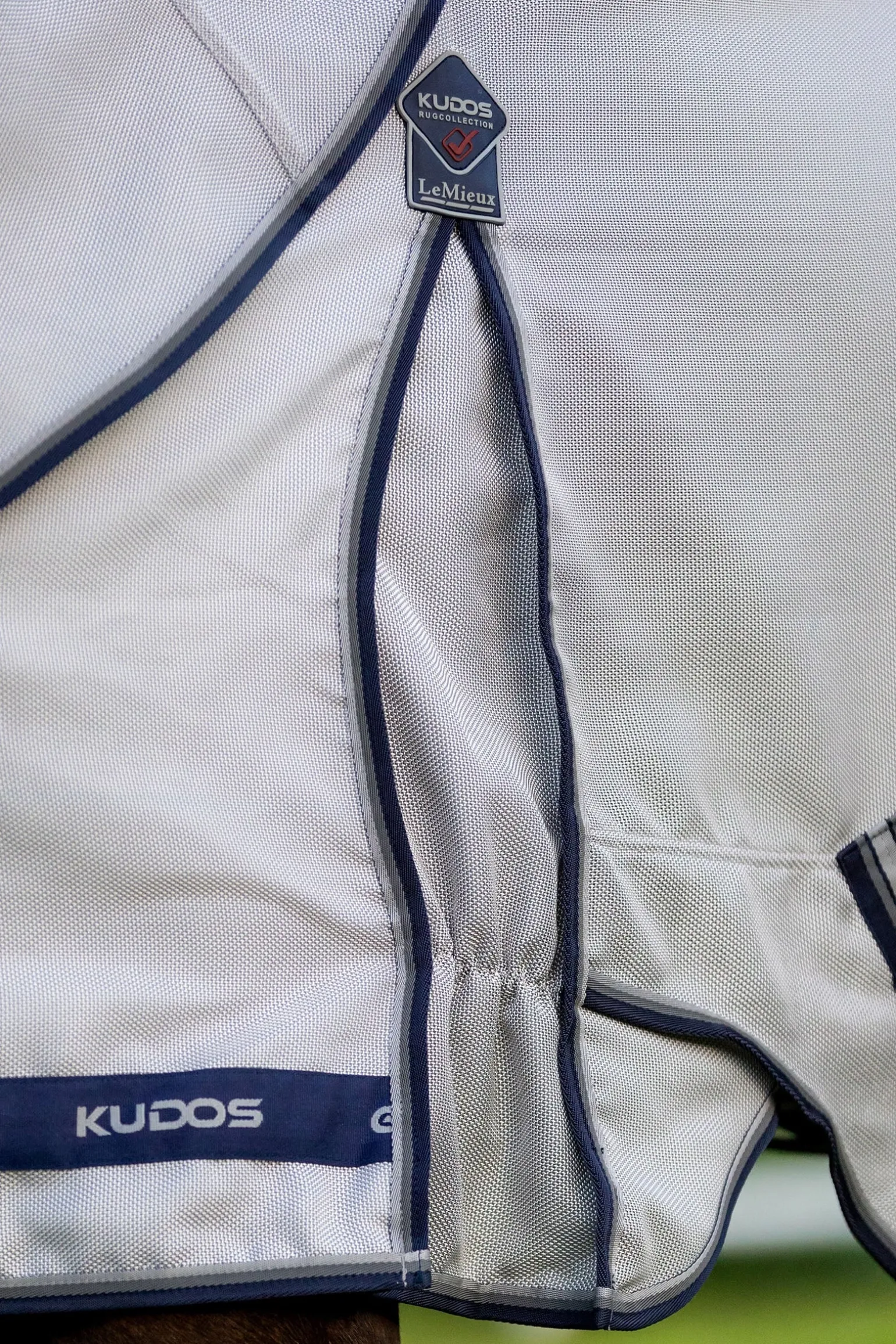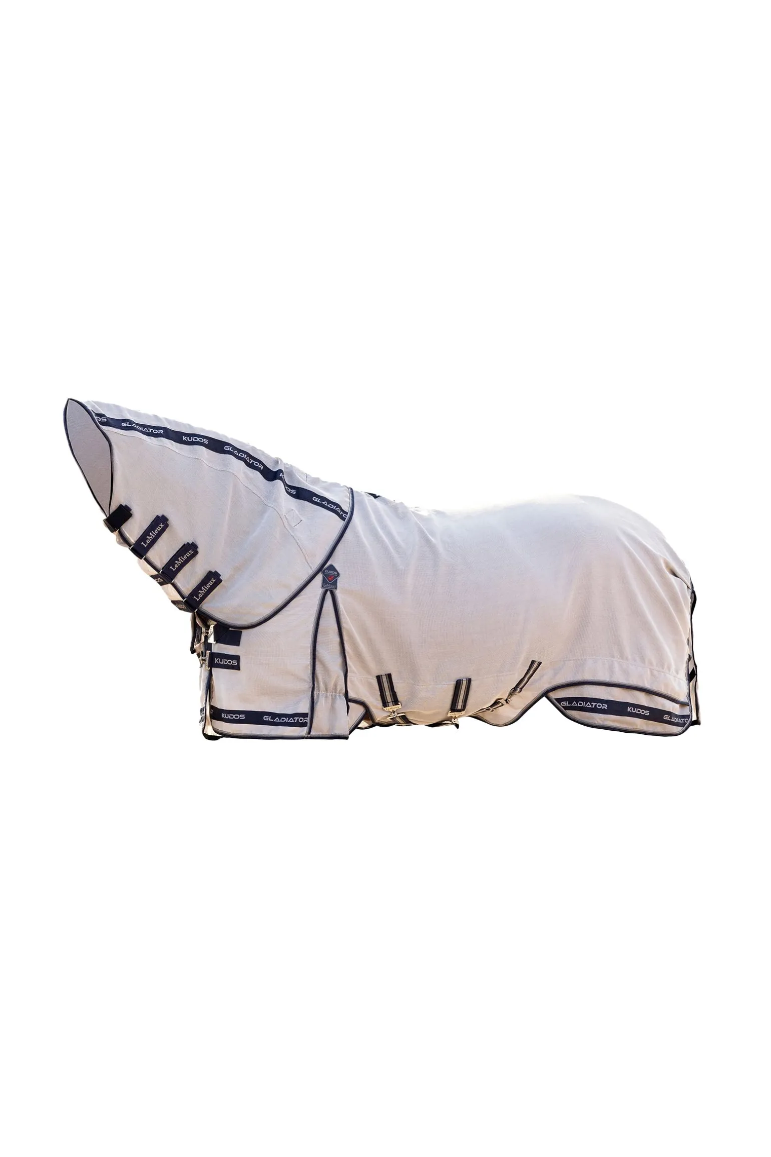 Die Kudos Gladiator Fliegendecke ist der Inbegriff von Luxus und Funktionalität. Sie besteht aus einem besonders strapazierfähigen, intelligenten Power-Form-Mesh, das sich mit der Zeit der Körperform des Pferdes anpasst. Das leichte Gewebe aus robustem Nylon und Monofilament-Polyester ist hoch atmungsaktiv, wasserabweisend und trocknet schnell. Die verlängerte, anatomisch geschnittene Bauchklappe bietet optimalen Schutz und ist mit einem dreifachen Verschluss ausgestattet, inklusive abnehmbarem Mittelriemen, der hilft, die Decke bei Bewegung in Position zu halten. Das designgeschützte, schräge Brustverschlusssystem verteilt den Druck gleichmäßig und verhindert Scheuerstellen an Schulter und Brust. Der patentierte, zweiteilige Deckenschnitt sorgt für einen Spannungsabbau entlang des Saums und ermöglicht maximale Bewegungsfreiheit.