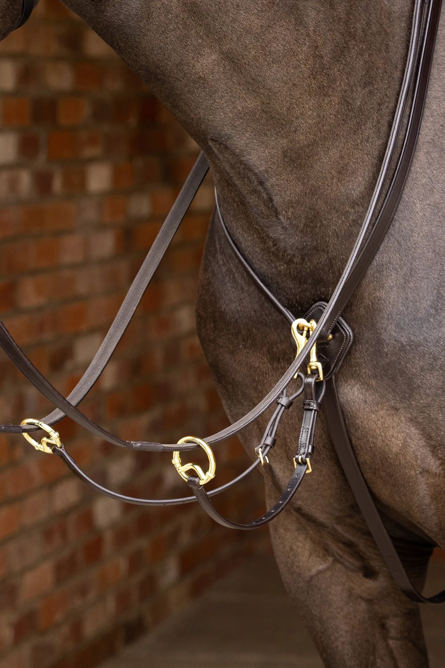 Die speziell entworfenen Martingalringe lassen sich schnell und einfach an- und abschnallen, ohne dass du die Zügel öffnen musst. Die abnehmbaren Zügelbefestigungen können entfernt werden, wenn sie nicht benötigt werden.