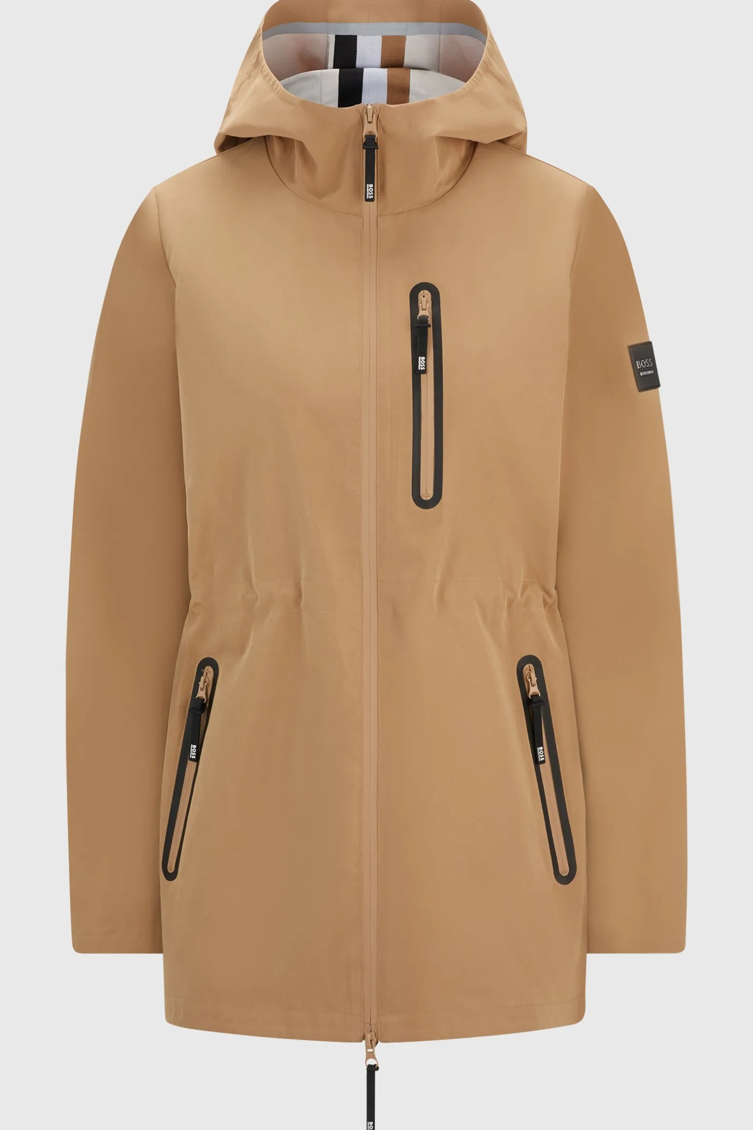 Hardshell-Regen- und Windjacke, die dich bei jedem Wetter warm und trocken hält. Obere Schicht mit Klebebandnähten, Taschen, Verstellmöglichkeit in der Taille.