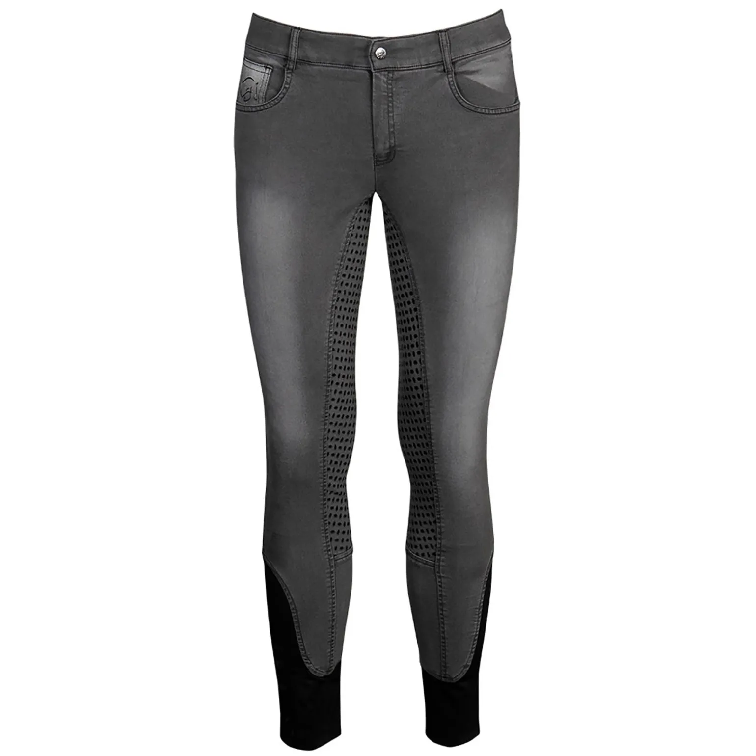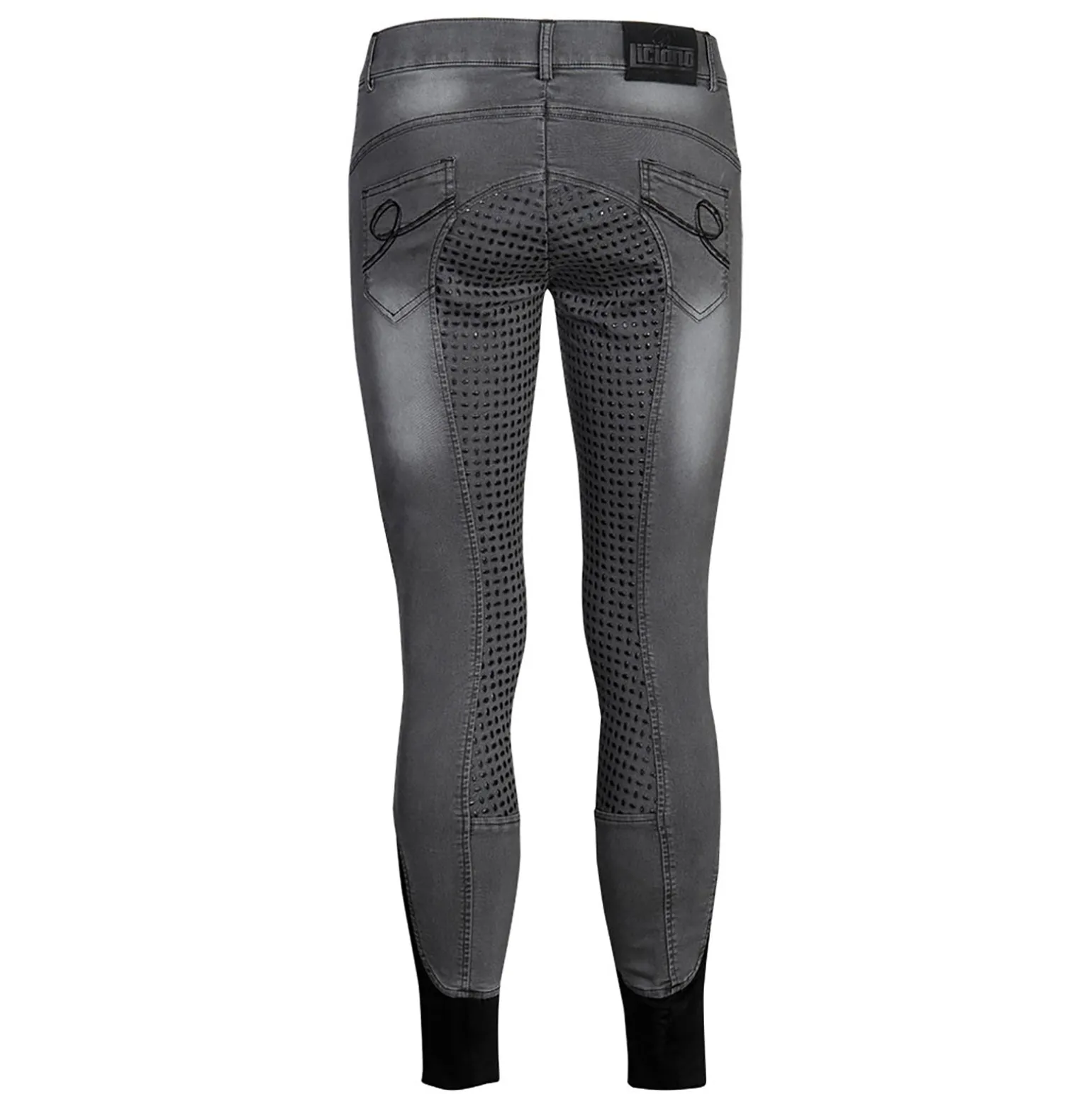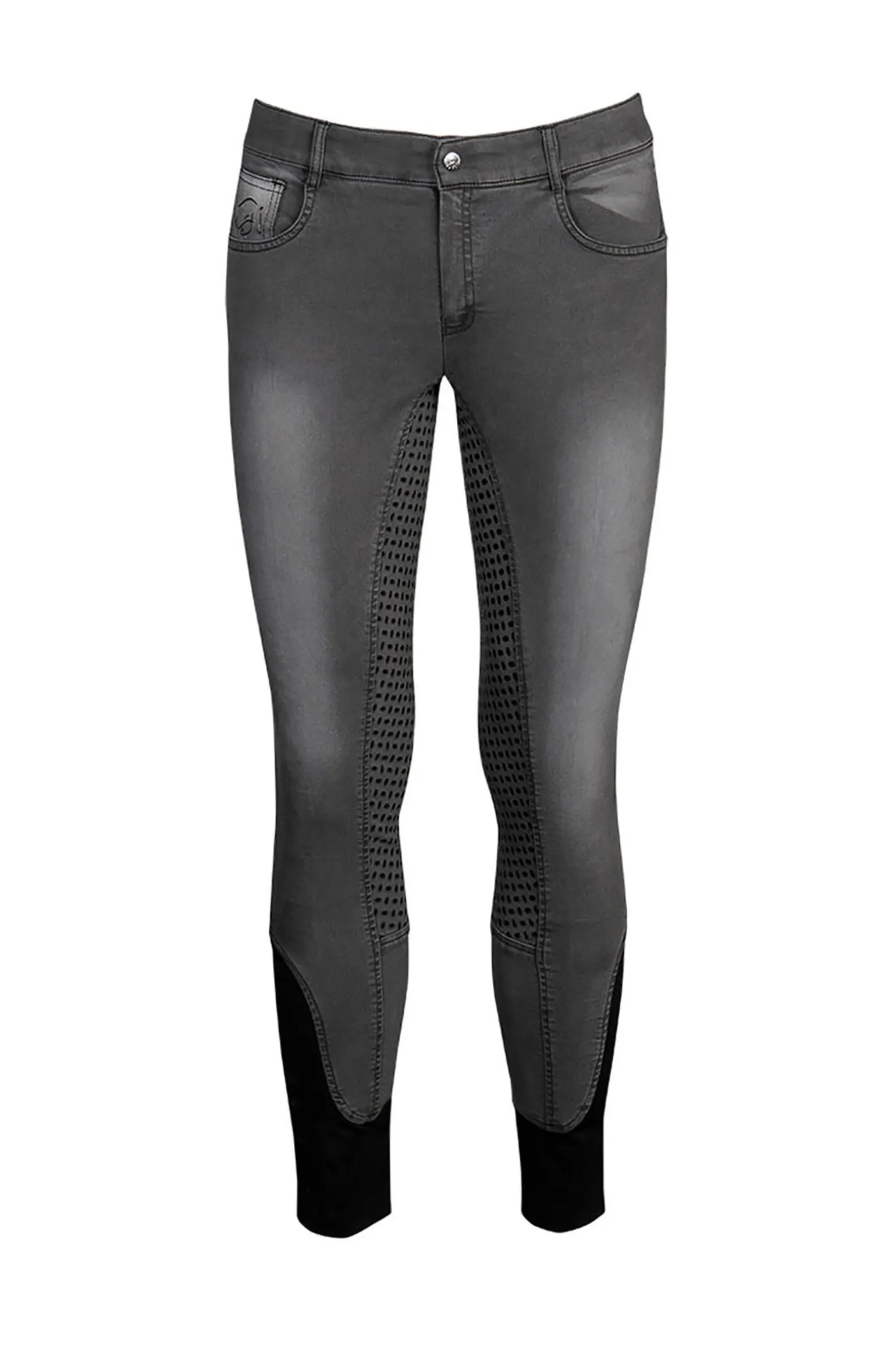 Denim-Reithose mit zwei Einschubtaschen, zwei Gesäßtaschen mit dekorativer Stickerei, mit Logo-Badge, rundgenähter Sitzfläche mit Silikon-Aufdruck, Lycra-Flex-Beinen. 97% Baumwolle / 3% Lycra.