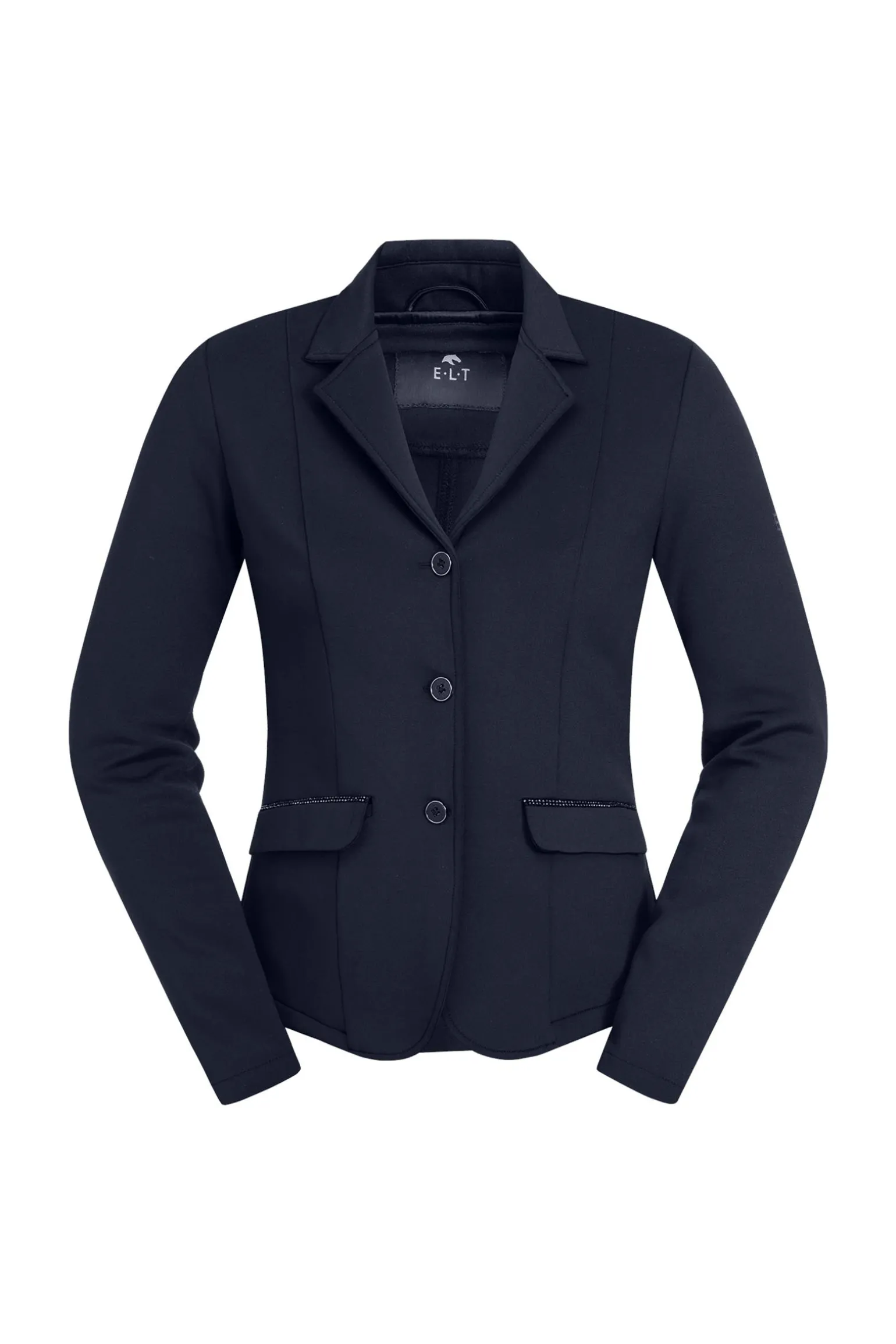 Dieses modische Turnierjacket von ELT bietet mit seinem atmungsaktiven und elastischen Material optimale Bewegungsfreiheit. Es verfügt über zwei praktische seitliche Eingrifftaschen und einem Reitschlitz auf der Rückseite. Seine taillierte Passform und die dekorativen Strasssteine an den Taschen machen es zu einem echten Hingucker.