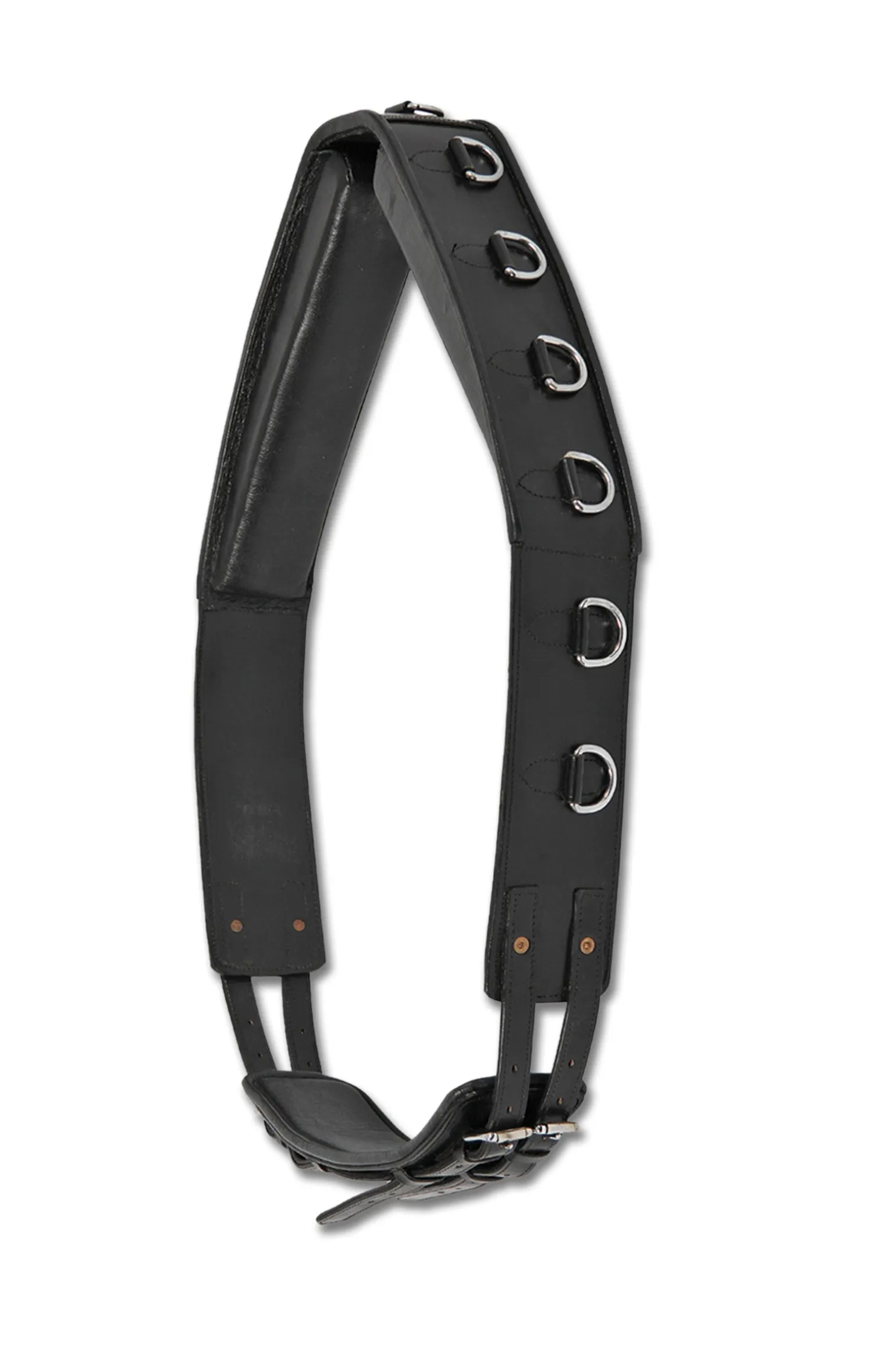 Ledergurt mit 13 Ringen für die individuelle Longenführung. Auch für die Doppellongen-Arbeit gut geeignet. Weich abgepolstert.