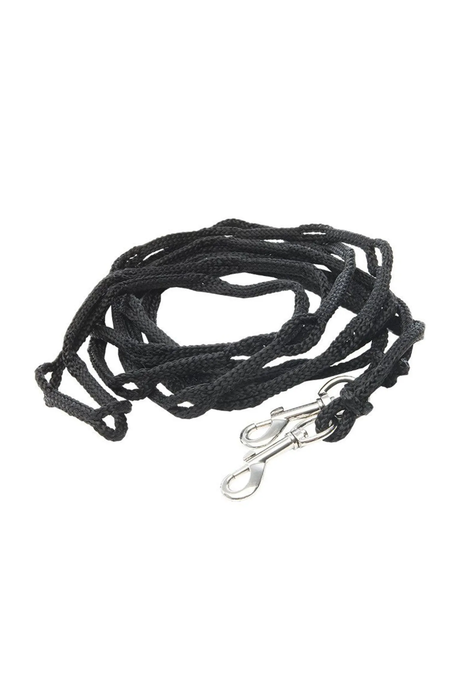 Praktische Hilfszügel aus einer Perlonschnur, mit Karabinerhaken und Schlaufen zur individuellen Längeneinstellung.