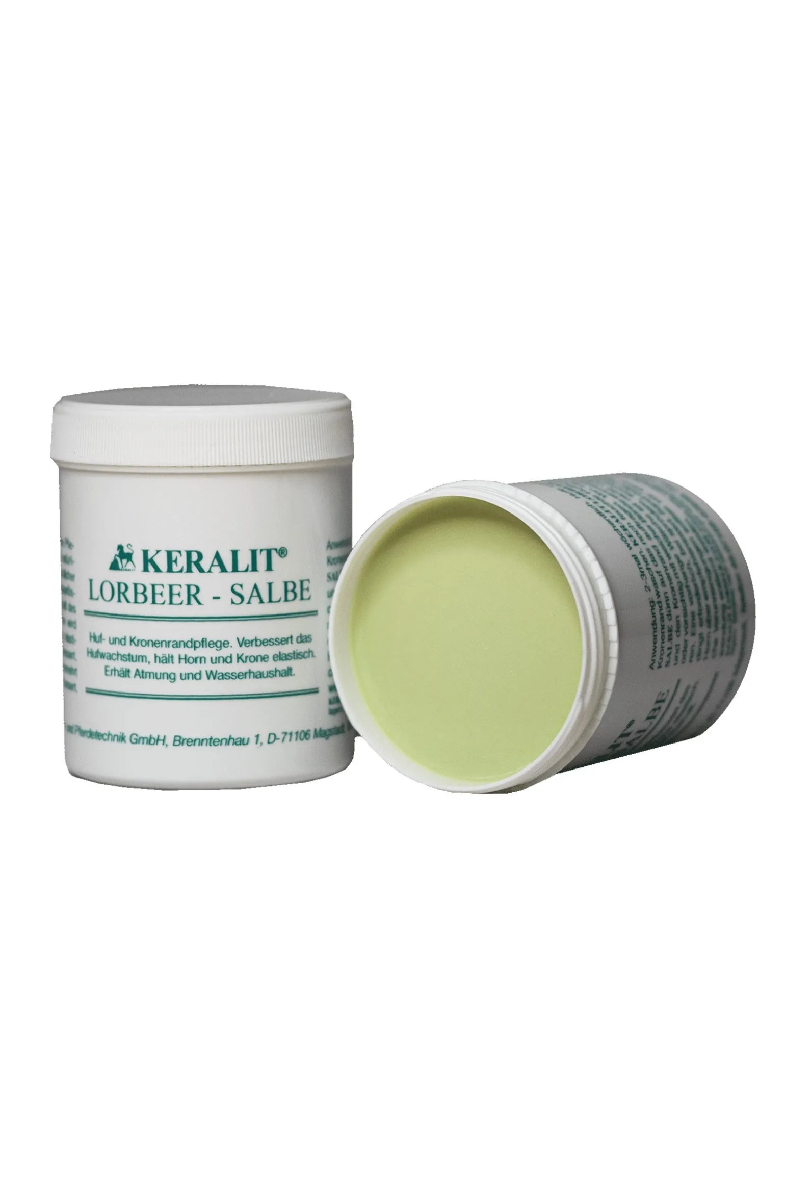 Die KERALIT Lorbeersalbe ist eine Pflege- und Wirkstoffkombination aus natürlichen Bestandteilen in einer hochwertigen, wasserlöslichen Grundlage. Die Salbe enthält 20% reines Lorbeeröl. Durch die wasserfreundlichen Eigenschaften können die gelösten Pflegestoffe ideal ins Horn und den Kronrand einziehen. Hufwachstum und Hufmechanismus werden dadurch verbessert. Aufgrund der Wasserlöslichkeit kann der Huf auch bei mehrmaliger Anwendung ungehindert Feuchtigkeit aufnehmen und abgeben. Der Wasserhaushalt des Hufes bleibt somit ungestört. Herkömmliche Fette lassen dies nicht zu und verschließen die Poren für mehrere Tage. KERALIT Lorbeersalbe verbessert den Wasserhaushalt des Horns, dadurch wird der Huf in der Bewegung des Pferdes vermehrt durchblutet. Die verbesserte Elastizität des Hufes erhöht den Stoffwechsel am Kronrand und somit das Hufwachstum.