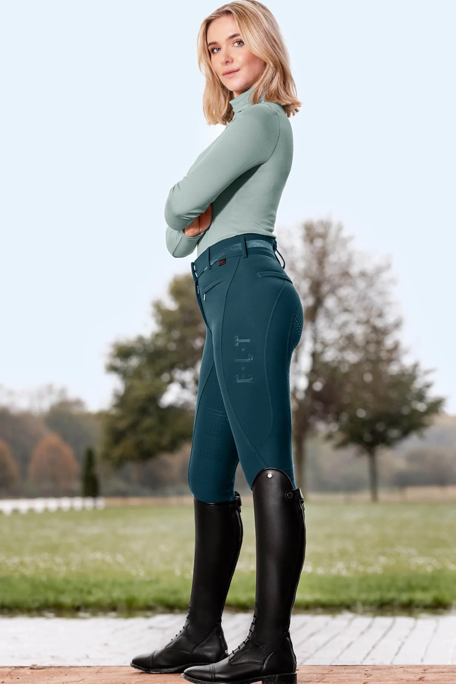 Diese Reithose verfügt über einen Silikon-Vollbesatz mit unterschiedlichen Grip-Zonen für optimale Stabilität und Komfort. Das Logo-Silikonprint ist im Besatz integriert, während das gebondete Material hoch elastisch, formstabil, atmungsaktiv und weich auf der Innenseite ist. Der bi-elastische Stoff sorgt für eine figurformende Passform mit einem Kompressionseffekt. Weitere Merkmale sind dekorative Paspeltaschen auf der Rückseite, eine Handy-Einschubtasche, nahtverdeckte Reißverschlusstaschen auf der Vorderseite sowie hochwertige E·L·T-Metall-Details, einschließlich des dekorativen E·L·T-Schriftzugs am linken Oberschenkel.