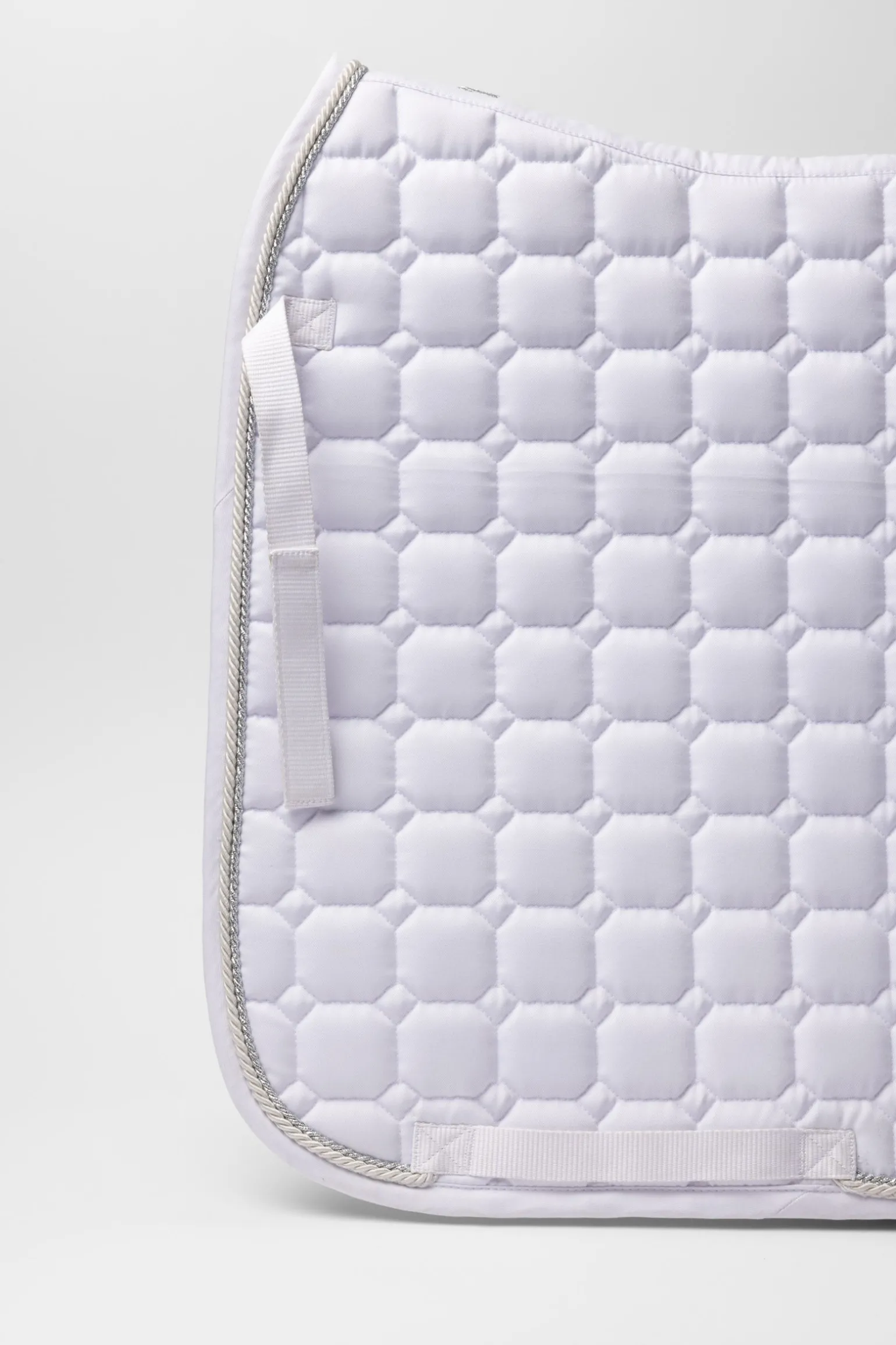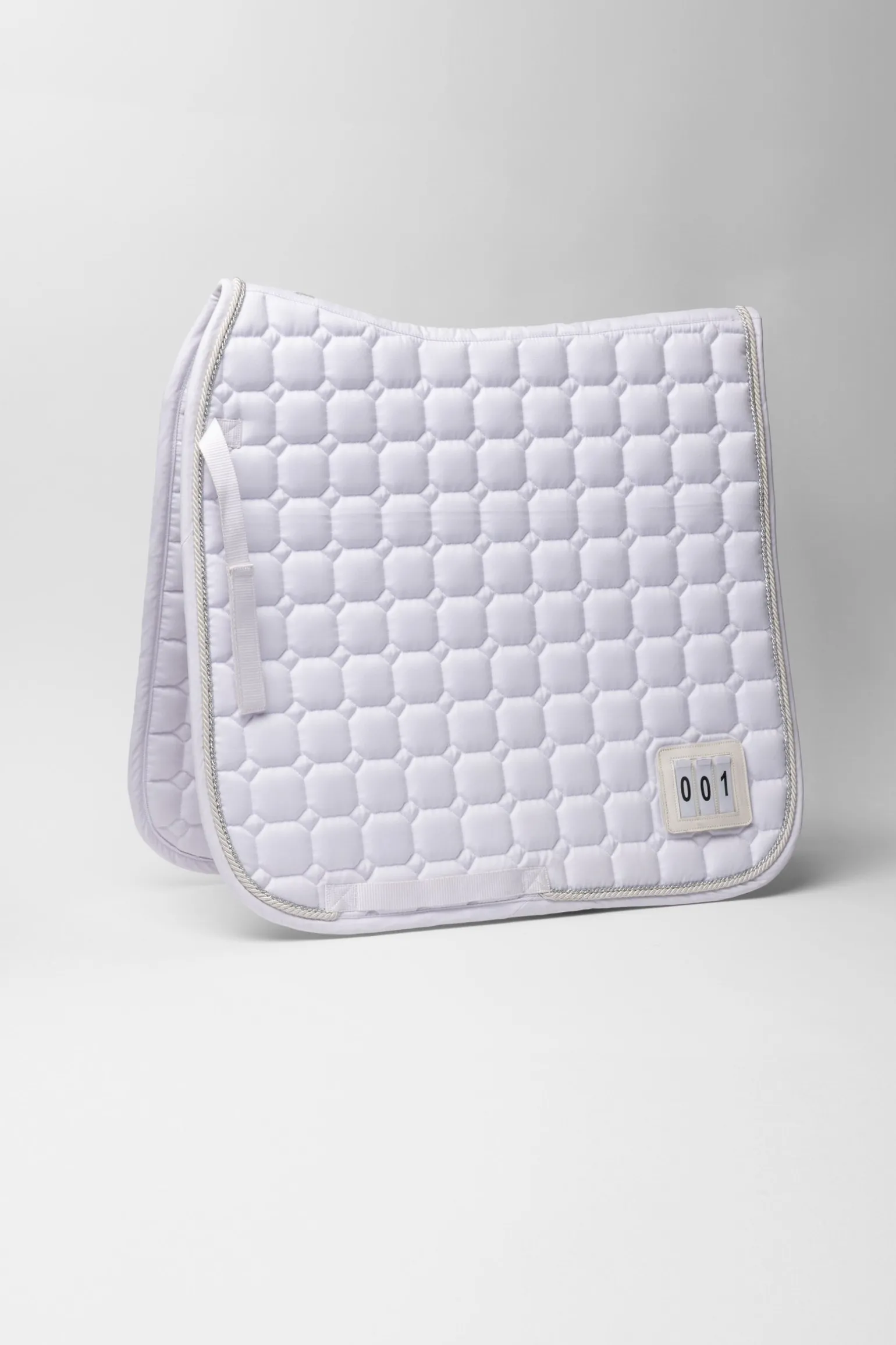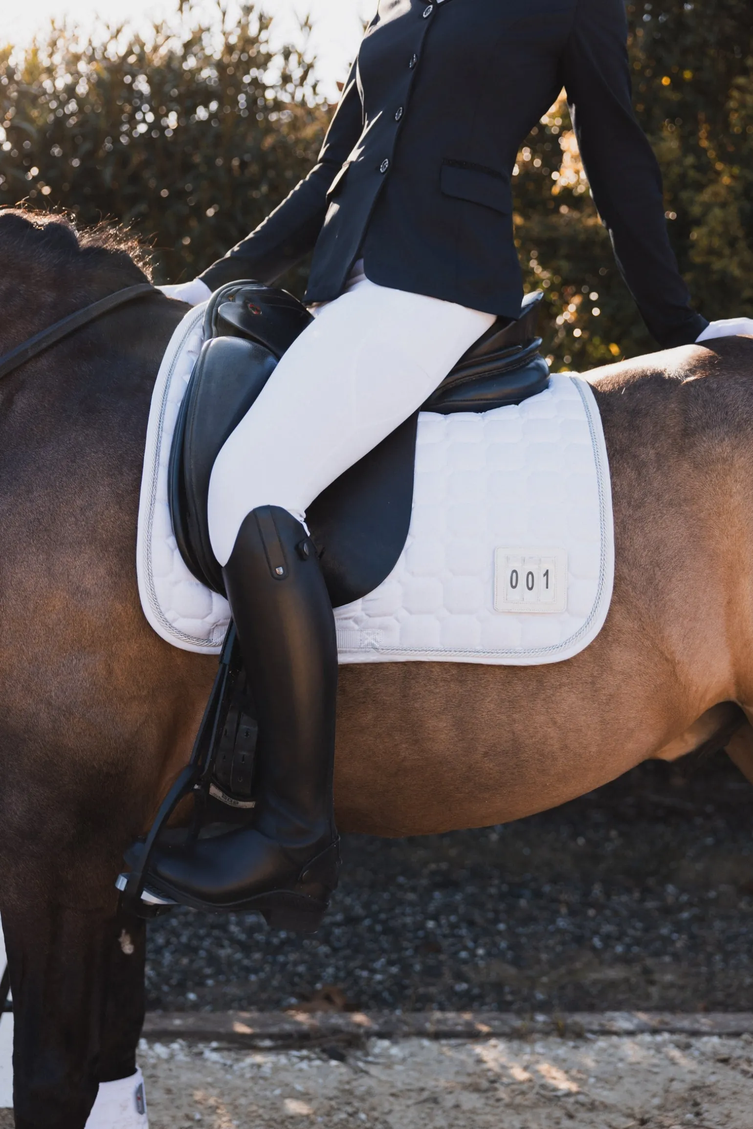 Diese elegante Dressurschabracke wurde speziell für Turniere entwickelt. Die anatomische Rückenlinie sorgt für eine optimale Passform und hohen Tragekomfort für das Pferd. Befestigungsriemen mit Haken- und Flauschverschluss gewährleisten sicheren Halt. Ein Lederpatch mit Aussparung ermöglicht die einfache Platzierung der Startnummer. Die Stickerei am Widerrist verleiht eine edle Optik. Weiche Polsterung bietet zusätzlichen Schutz, während das Silikon-Badge auf der linken Seite einen modernen Akzent setzt.