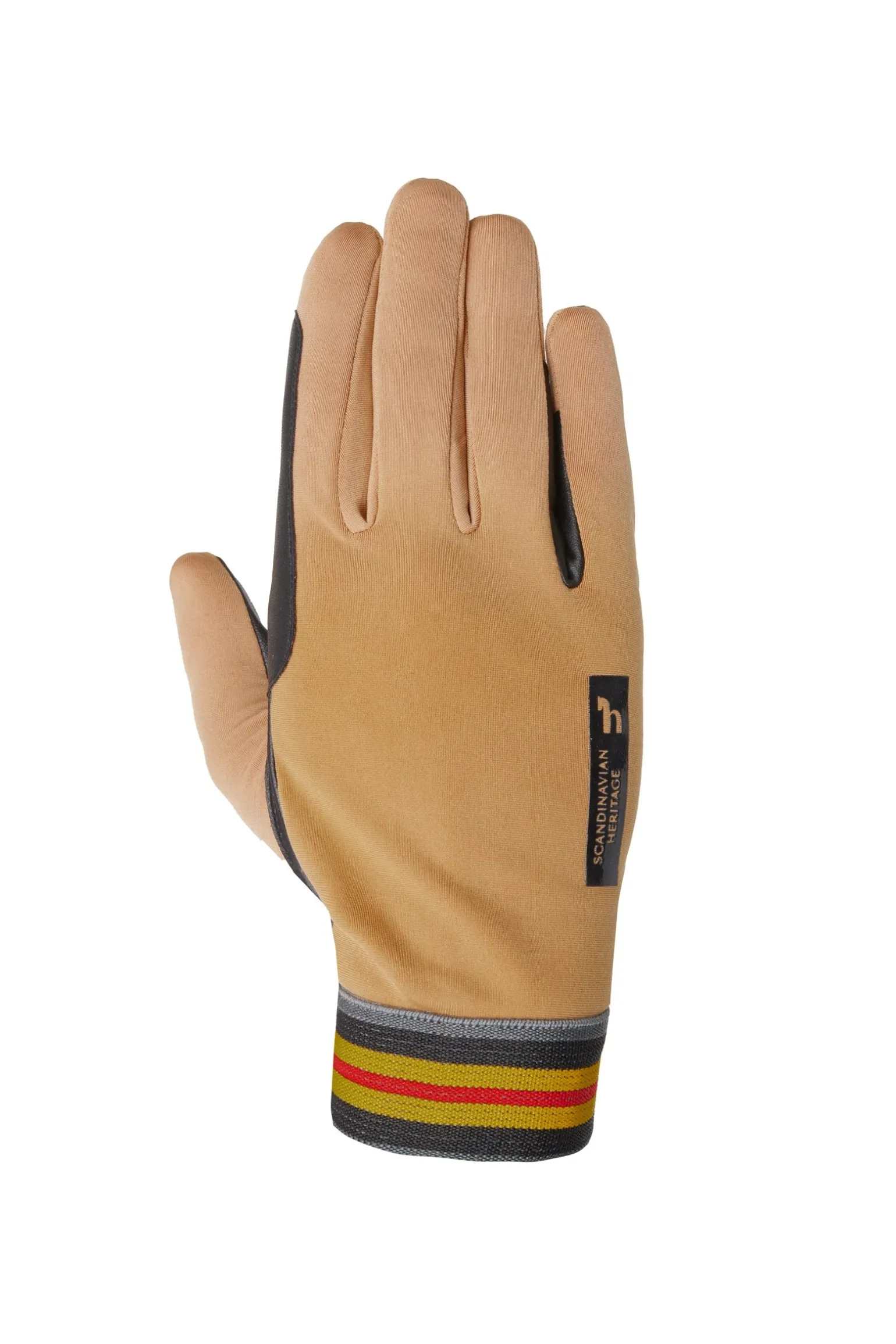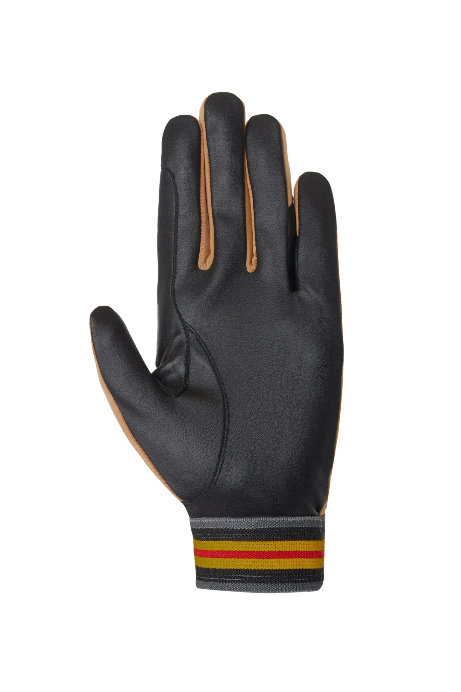 Schlupf-Reithandschuhe für die ganze Saison. Die Manschette ist mit einer gestreiften Paspel versehen und ein kleines Logodetail ziert die Seiten. Ganzflächig griffiges Material auf der Handfläche und Zügelverstärkungen.