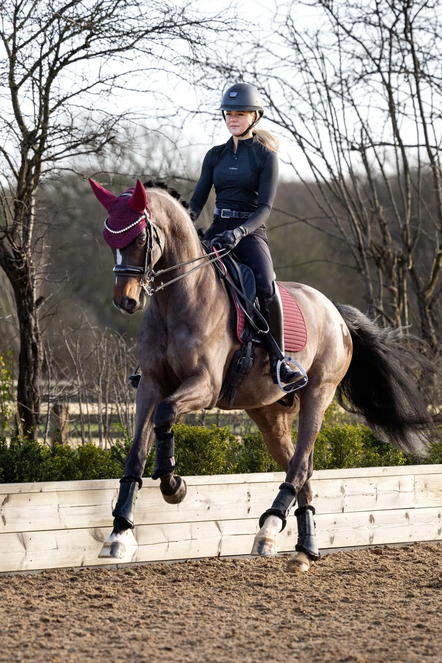 Eine UV50+ Basisschicht mit Viertelreißverschluss für aktive Reiter. Dieses Shirt wurde entwickelt, um dich kühl und komfortabel zu halten. Es verfügt über belüftende Mesh-Einsätze in Kombination mit schweißableitendem Thermostoff für optimale Temperaturkontrolle. Das einzigartige, schweißableitende technische Material wurde entwickelt, um die Körpertemperatur zu regulieren und optimalen Komfort zu gewährleisten. Das seidig weiche Material bietet eine stilvolle, maßgeschneiderte Passform und die Netzeinsätze erhöhen die Luftzirkulation und sorgen für Atmungsaktivität. Ultraweiche Nähte mit flachen Steppnähten reduzieren Druckstellen. Das 360°-Stretch-Material bietet volle Bewegungsfreiheit und ist somit die perfekte Reitbekleidung. Ideal als Basisschicht oder als eigenständigs Kleidungsstück.