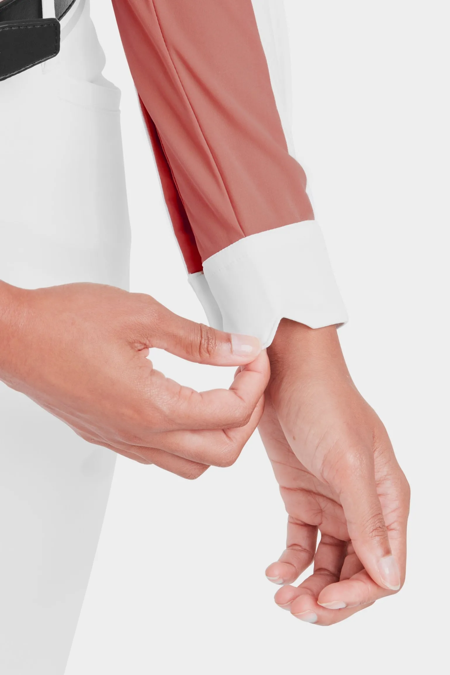 Wie das Kurzarmhemd Monica gewährleistet auch diese neue Variante das gleiche technisch ausgeklügelte Niveau. Mit seinem ergonomischen Schnitt und vorgeformten Ärmeln passt sich das Volumen des Hemdes perfekt an unsere Körperhaltung beim Reiten an. Die Form des Handgelenks wurde entwickelt, um Bewegungen beim Reiten zu erleichtern – perfekt für Turniere. Das Material wurde aufgrund seiner Elastizität und Atmungsaktivität ausgewählt. Die UV-BLOC-Technologie sorgt für Komfort und Schutz. Da man beim Reiten ganz schön ins Schwitzen kommen kann, leitet eine mikroperforierte Zone im Rückenbereich die Wärme bei intensiver Anstrengung effektiver ab. Der erhöhte Kragen eignet sich für Disziplinen wie Hunter.