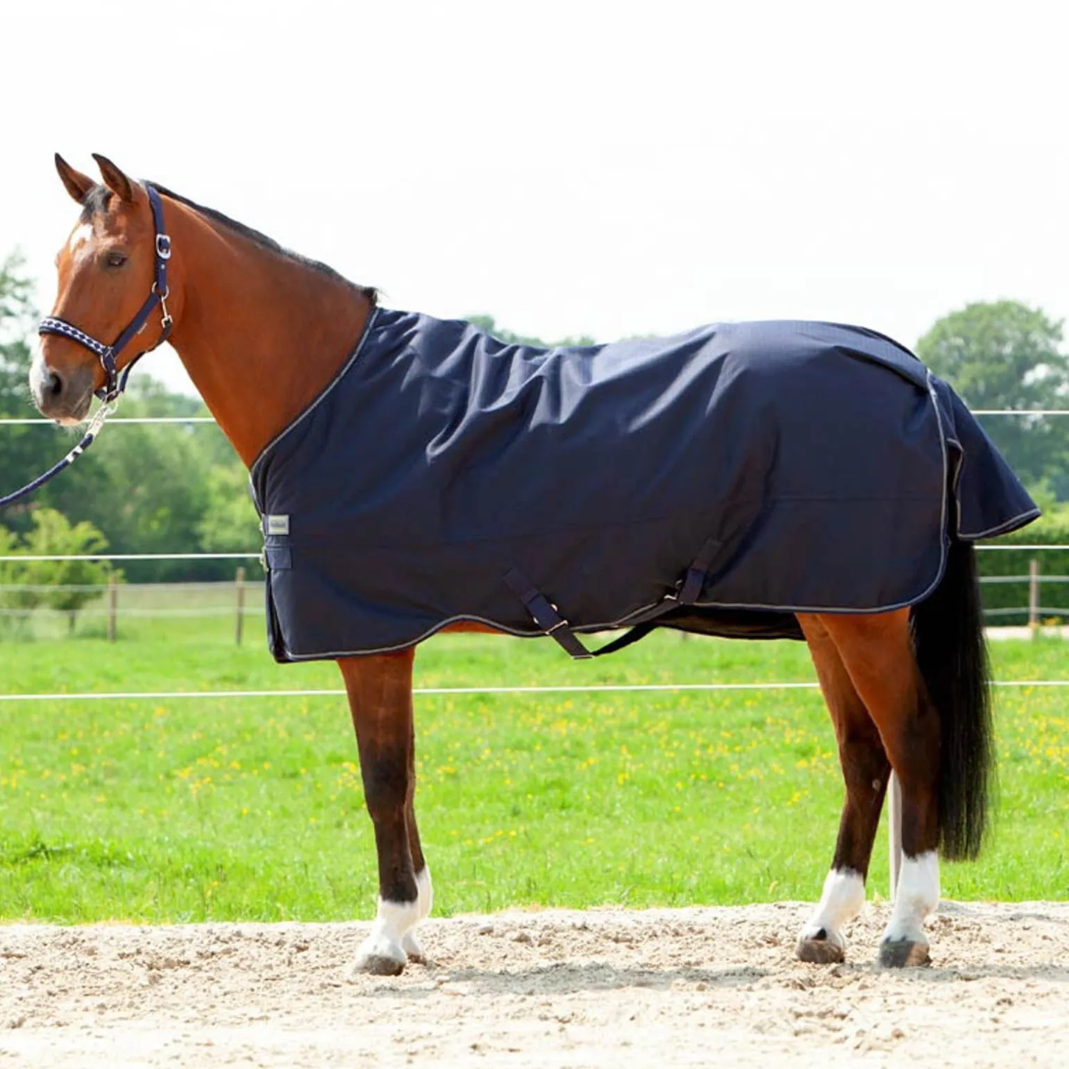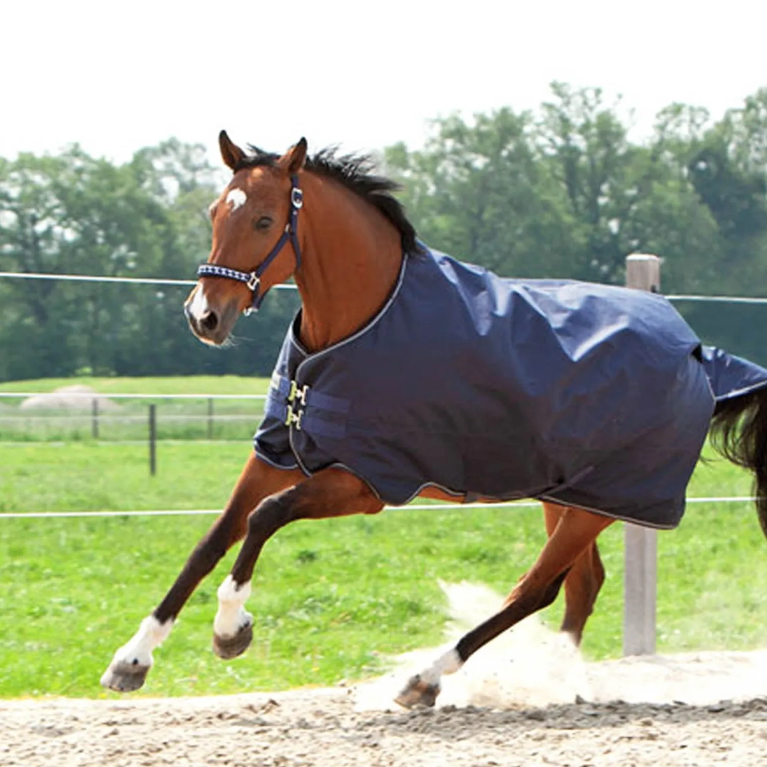 Die Outdoordecke ist wasserdicht (3000 mm Wassersäule, Atmungsaktivität 4000 g/qm inh. 24 h) und begeistert durch ihre hervorragende Passform. Die Decke ist reiß- und scheuerfest durch 1200 DEN Nylon-Gewebe. Tiefer Schweifriemen-Schweiflatz, doppelter Drehhakenbrustverschluss mit zusätzlichem Klett, elastische Einsätze bei der Kreuzbegurtung, Ösen zur Befestigung eines separat erhältlichen Halsteil. Ohne Gehfalte. 100g Füllung.