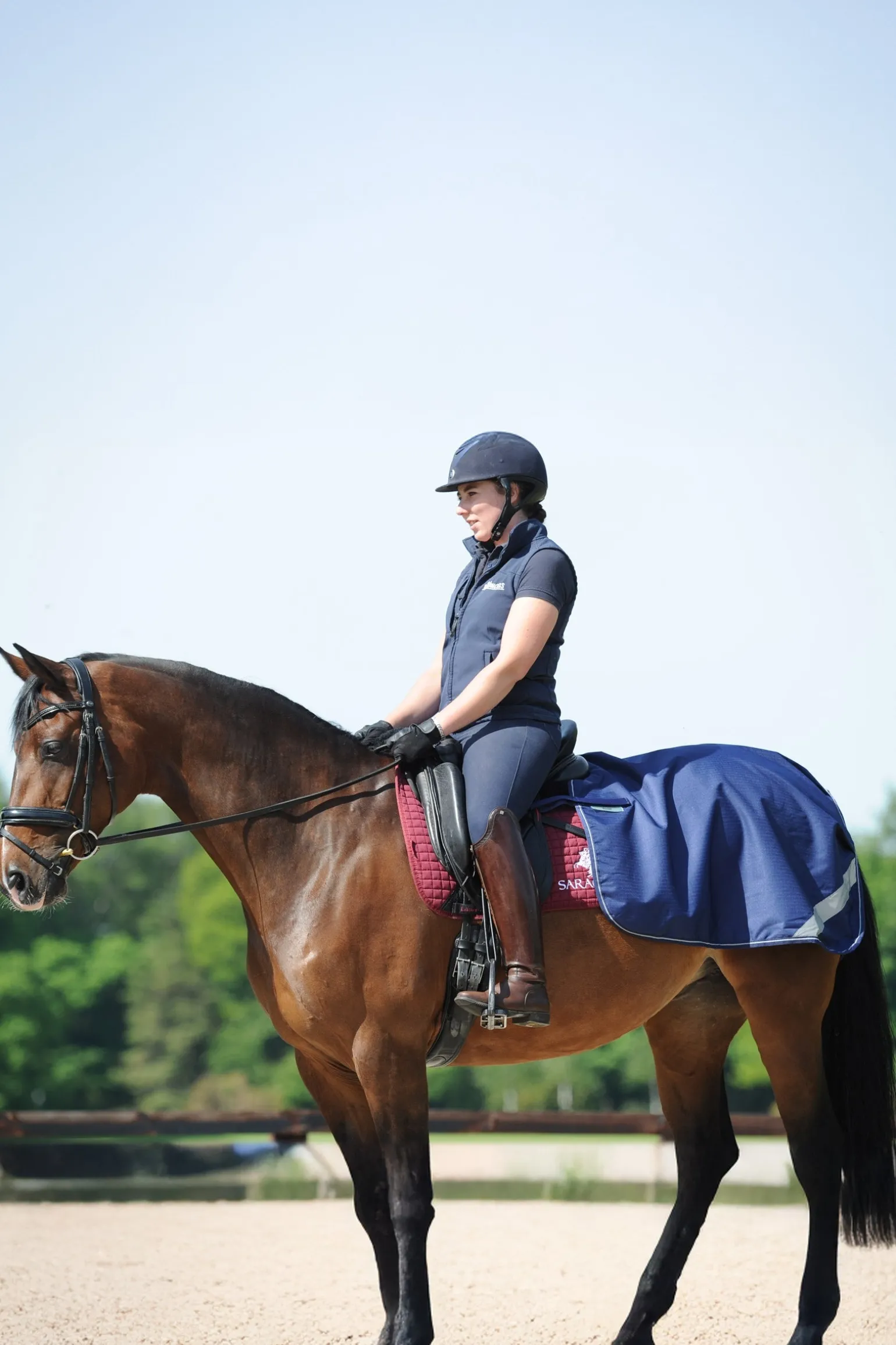Diese Nierendecke ist die ideale Allwetter-Trainingsdecke, die perfekt über den Rücken und hinter dem Sattel sitzt. Sie hält dein Pferd beim Training warm und trocken, ist wasserdicht und atmungsaktiv mit Ripstop-Außenmaterial sowie reflektierenden Paspeln und Streifen. Da sie leicht und strapazierfähig ist, ist sie ein perfekter Begleiter auf der Weide. Das stay-dry und antibakterielle Fleece-Futter hält die Decke frisch und transportiert Feuchtigkeit nach außen. Sie kann einfach mit Klettverschlüssen entweder an den Steigbügelriemen oder an den Sattelstrippen befestigt werden.