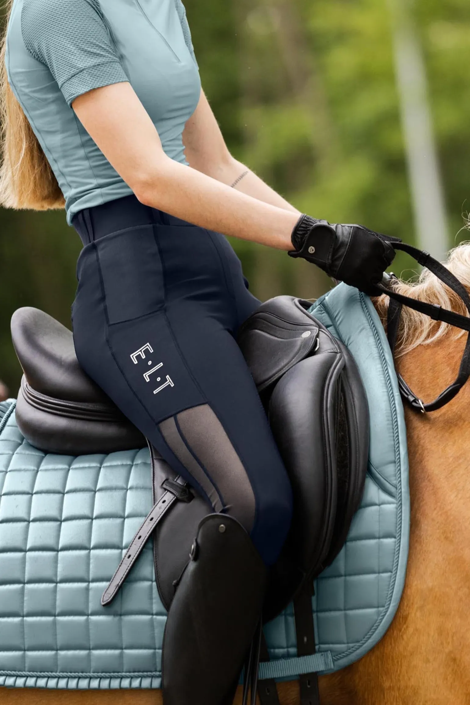 Diese Reitleggings verfügen über einen Silikon-Vollbesatz mit verschiedenen Grip-Zonen für mehr Stabilität. Die elastischen Beinbündchen bestehen aus atmungsaktivem Mesh-Material mit einem Silikonprint am inneren Saum. Das bi-elastische, atmungsaktive und wasserabweisende Material sorgt für Komfort und Langlebigkeit. Eine Handy-Einschubtasche auf der rechten Seite mit irisierendem E·L·T-Schriftzug verleiht einen stilvollen Akzent. Seitliche Einsätze aus zwei verschiedenen Mesh-Materialien und Gürtelschlaufen ergänzen das funktionale und trendige Design. Der E·L·T Logo-Silikonprint am hinteren Bund rundet den Look ab.