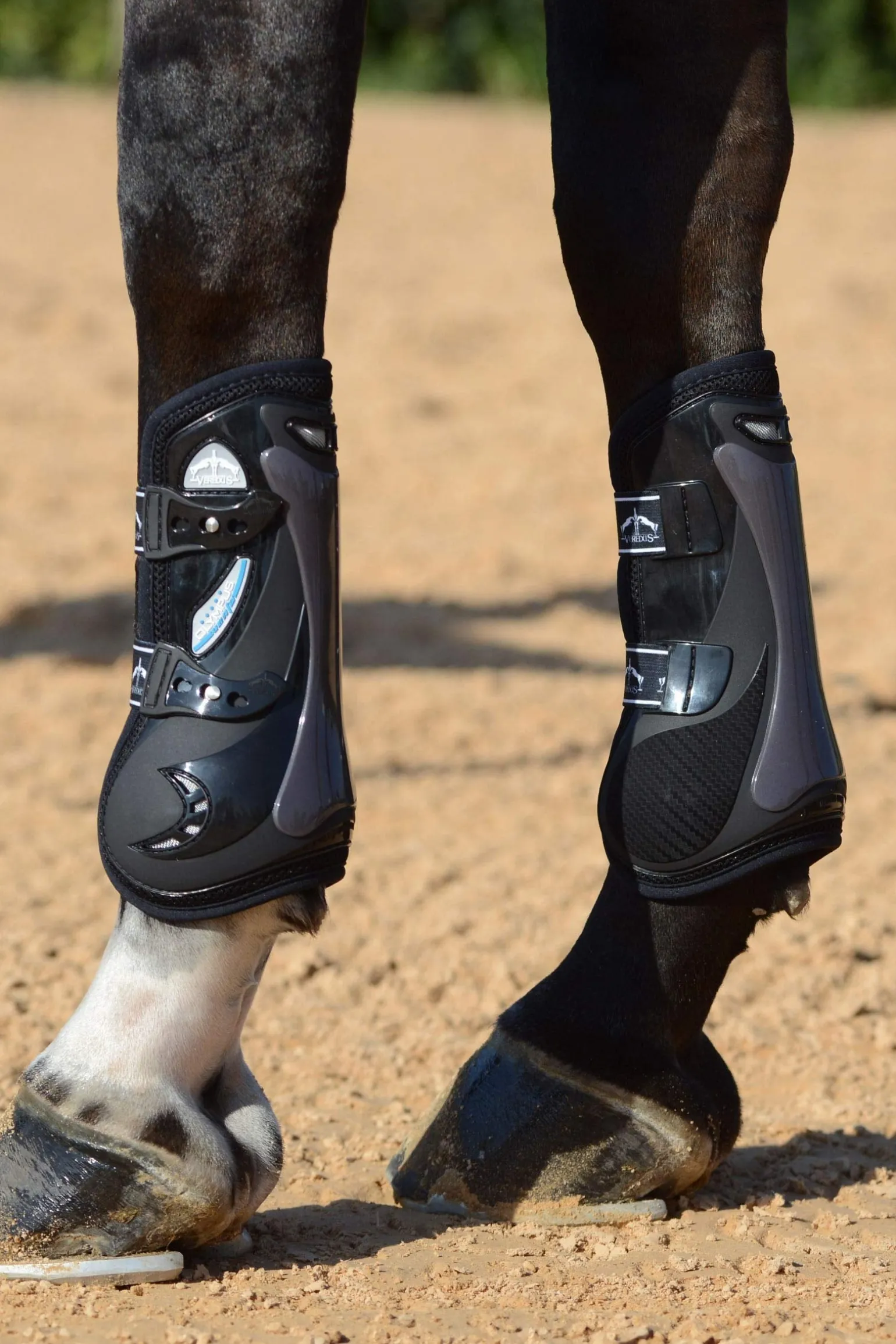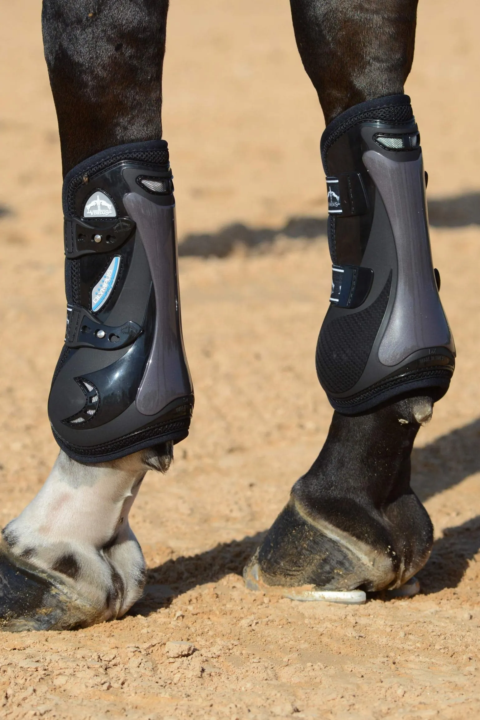 Die vom Pferdebein abgegebene Wärme durchdringt die Schicht aus mikroperforiertem Neopren und verteilt sich dann in den Kanälen des 3D-Mesh-Gewebes. Durch die Lüftungsöffnung tritt frische Luft ein und leitet die Wärme nach oben zum Auslassgitter. Die Belüftung erfolgt somit sowohl horizontal als auch vertikal. Der Schutz der vorderen Sehnen wird durch einen stoßdämpfenden Film aus EVA-Schaum gewährleistet.