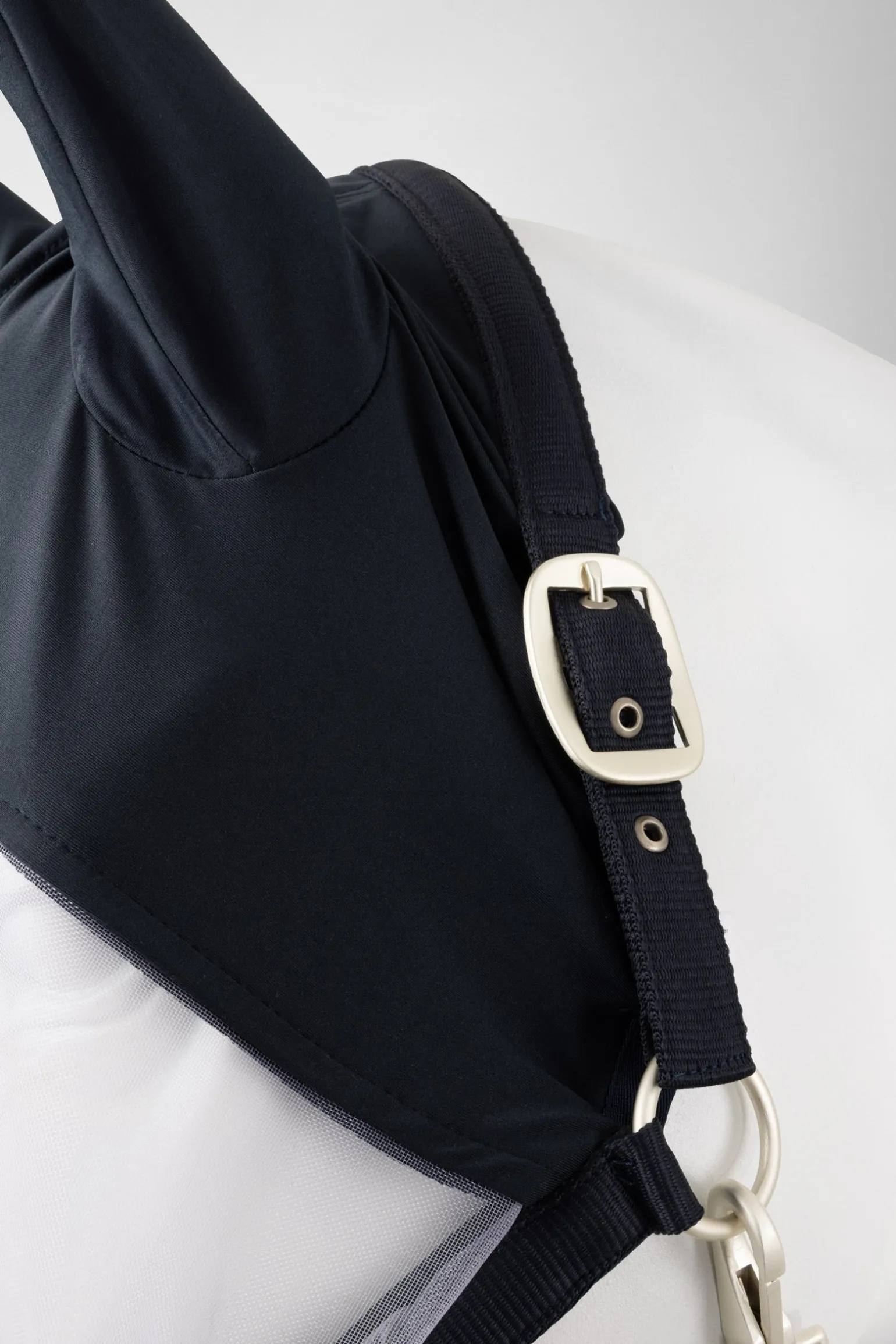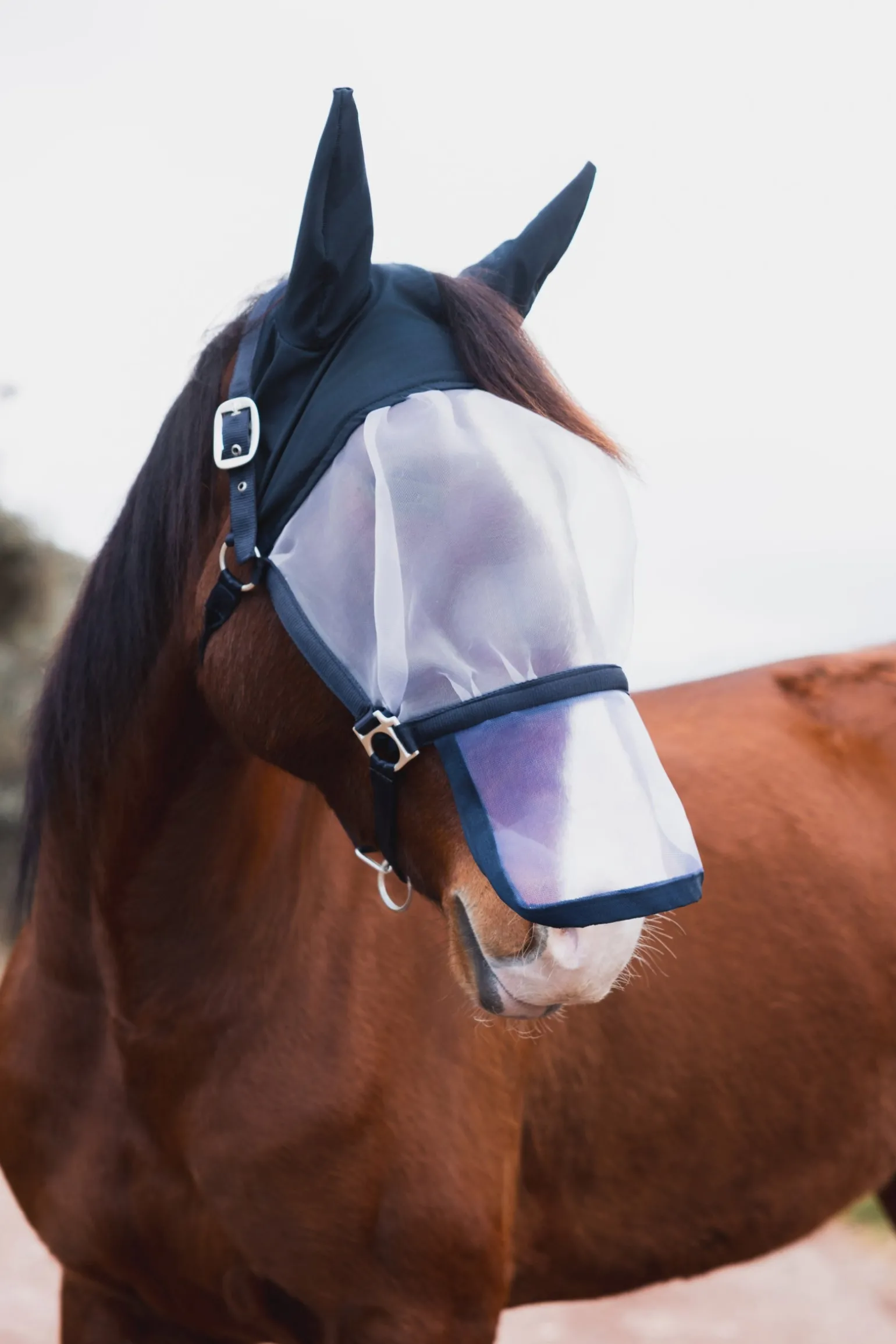 Dieses Halfter mit Fliegenmaske bleibt da, wo es hingehört, und ist leicht anzulegen.