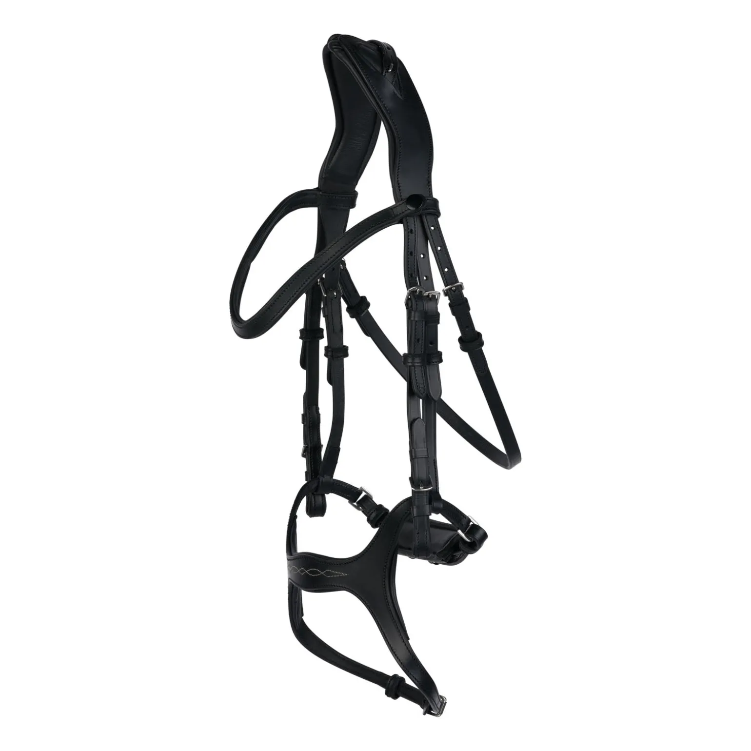 Die Horze Peckham Trense ist mit einer anatomisch geformten Genickpartie ausgestattet, um Reibung zu vermeiden, und zusätzlich an Nase, Genick und Stirnriemen für extra Komfort gepolstert. Das glatte Leder liegt weich auf. Der U-förmige Stirnriemen kann durch Druckknöpfe leicht ausgetauscht werden, und die detaillierte Bestickung auf der Nase ist ein elegantes Detail. Metallbeschläge passen gut zu dem schwarzen oder braunen Leder.