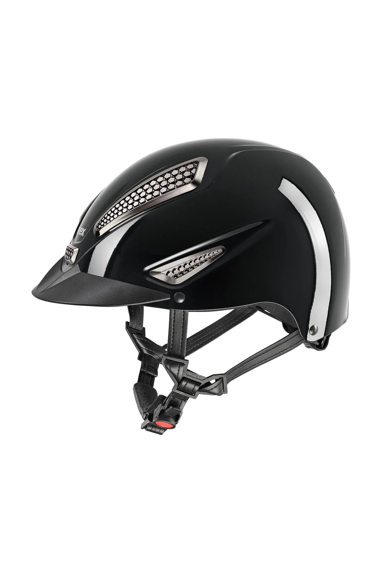 Komfort, Ergonomie und die richtige Temperatur – das bekommst du mit dieser sportlichen Reithelm in einem pianolackartigen Glanzfinish, das mit verchromten Belüftungsgittern verstärkt ist.