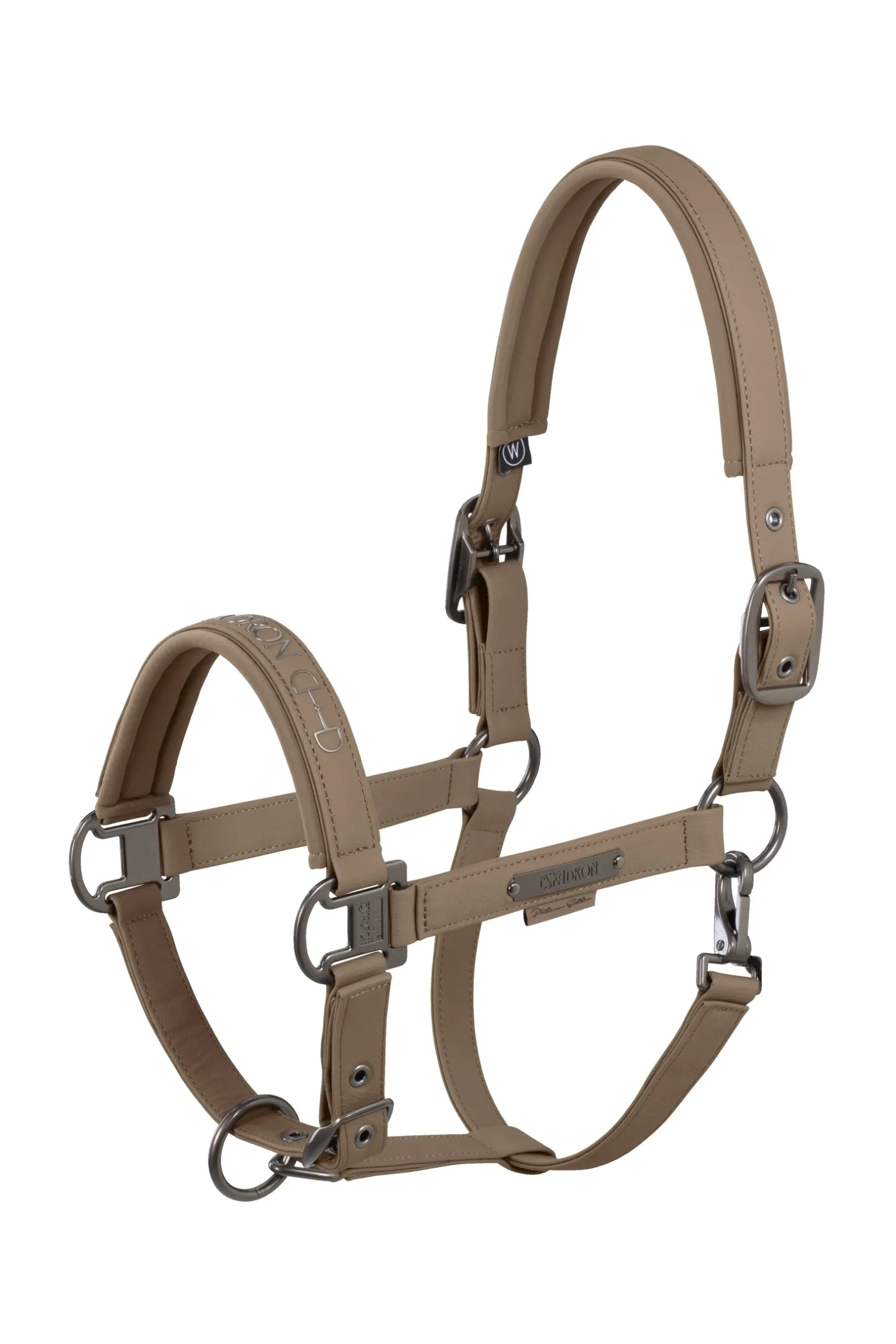 Dieses elegante Halfter verfügt über eine Premium-Oberfläche aus Kunstleder mit reißfestem Webbing innen für zusätzliche Haltbarkeit. Die weiche Softshell-Polsterung an der Nase und am Kopfstück sorgt für zusätzlichen Komfort. Pin-Buckles auf beiden Seiten ermöglichen eine optimale Anpassung, mit zusätzlicher Einstellmöglichkeit im Kinnbereich für eine perfekte Passform. Das Halfter ist mit hochwertigen taupe Metallbeschlägen, einem Noble Platinum Schriftzug auf dem Nasenriemen und einer zusätzlichen Eskadron Metallplatte an der linken Seite abgeschlossen.