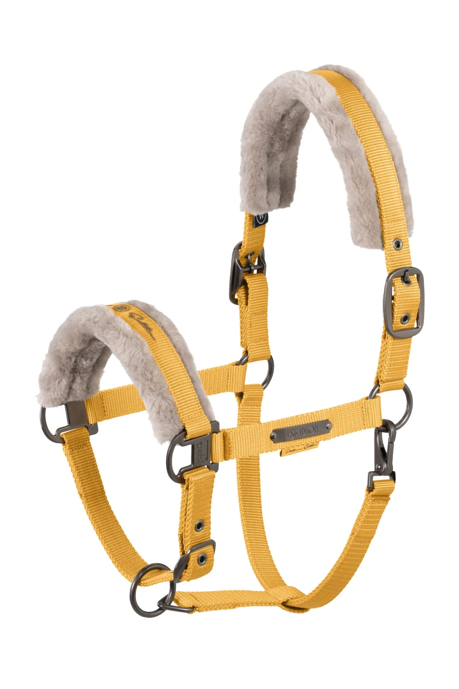 Dieses hochwertige Halfter besteht aus reißfestem Gurtband und ist komplett mit weichem Kunstfell gepolstert – für maximalen Komfort und einen edlen Look. Das pflegeleichte Polster ist an Nasen- und Genickstück abnehmbar und bietet so zusätzliche Flexibilität. Dornschnallen auf beiden Seiten ermöglichen eine optimale Anpassung, ergänzt durch eine weitere Verstellmöglichkeit im Kinnbereich. Hochwertige Metallbeschläge in Taupe, ein edler Platinum-Schriftzug auf dem Nasenband und eine exklusive Eskadron-Metallplakette auf der linken Seite runden das Design ab.