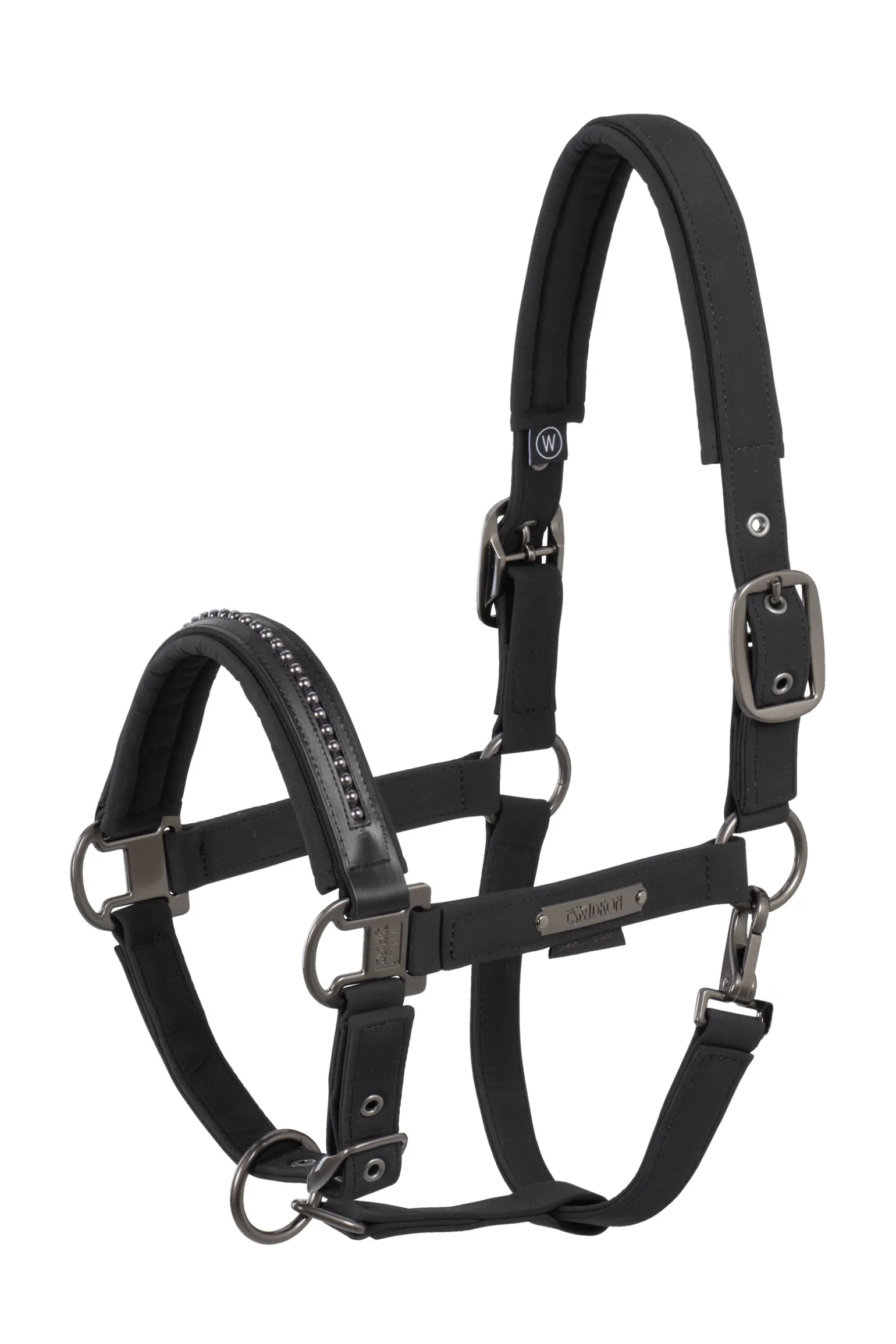 Dieses Halfter verfügt über eine robuste Softshell-Oberfläche und ein reißfestes Gurtband innen für zusätzliche Haltbarkeit. Weiche Polsterung an der Nase und dem Stirnriemen sorgt für Komfort, während Pin-Schließen auf beiden Seiten eine optimale Anpassung ermöglichen. Eine zusätzliche Anpassungsmöglichkeit im Kinnbereich bietet mehr Flexibilität. Die hochwertigen taupefarbenen Metallbeschläge und die eingefügten Perlen am Nasenriemen verleihen Eleganz, und die Eskadron Metallplatte auf der linken Seite verstärkt das anspruchsvolle Design.