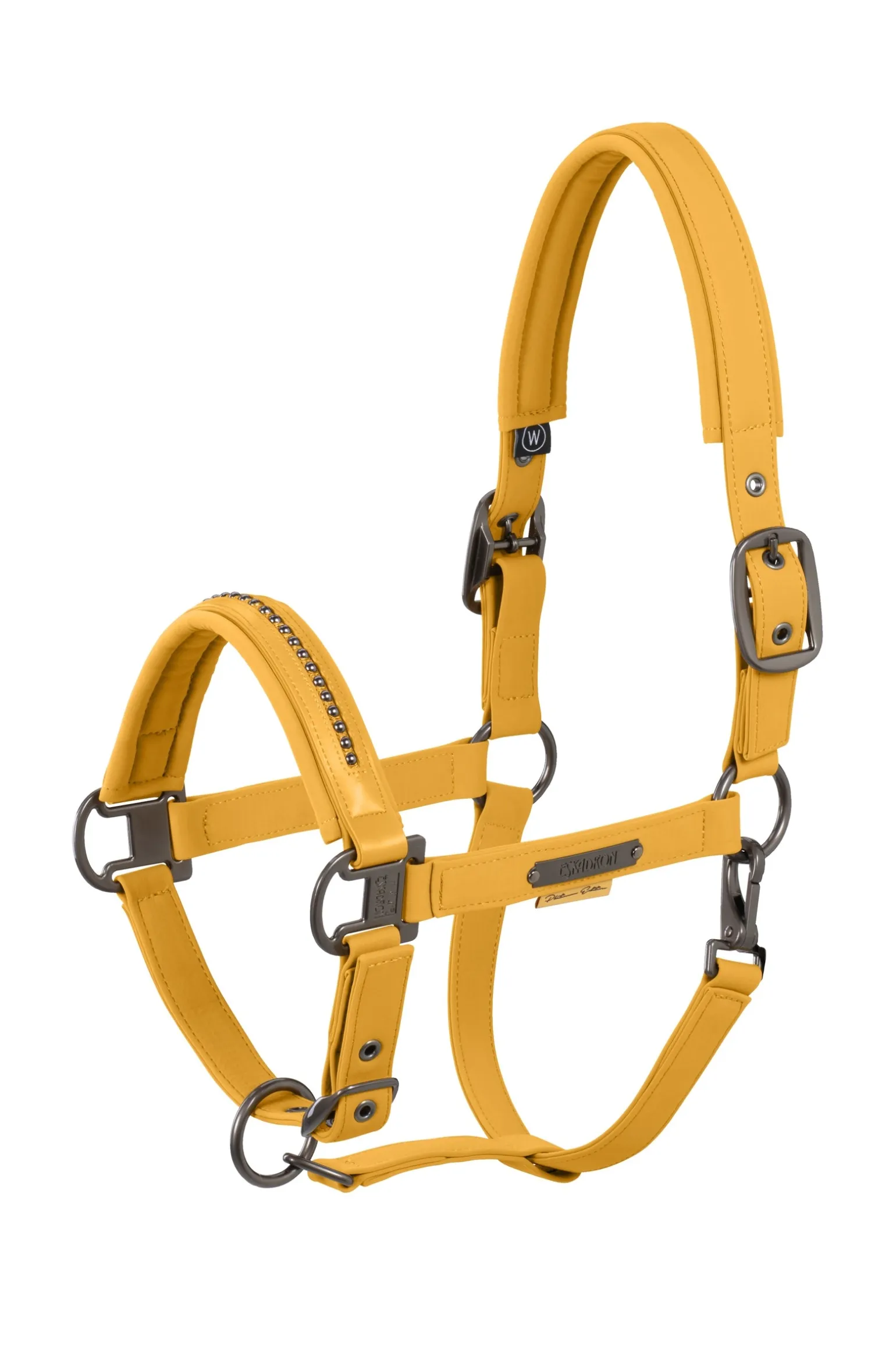 Dieses Halfter verfügt über eine robuste Softshell-Oberfläche und ein reißfestes Gurtband innen für zusätzliche Haltbarkeit. Weiche Polsterung an der Nase und dem Stirnriemen sorgt für Komfort, während Pin-Schließen auf beiden Seiten eine optimale Anpassung ermöglichen. Eine zusätzliche Anpassungsmöglichkeit im Kinnbereich bietet mehr Flexibilität. Die hochwertigen taupefarbenen Metallbeschläge und die eingefügten Perlen am Nasenriemen verleihen Eleganz, und die Eskadron Metallplatte auf der linken Seite verstärkt das anspruchsvolle Design.