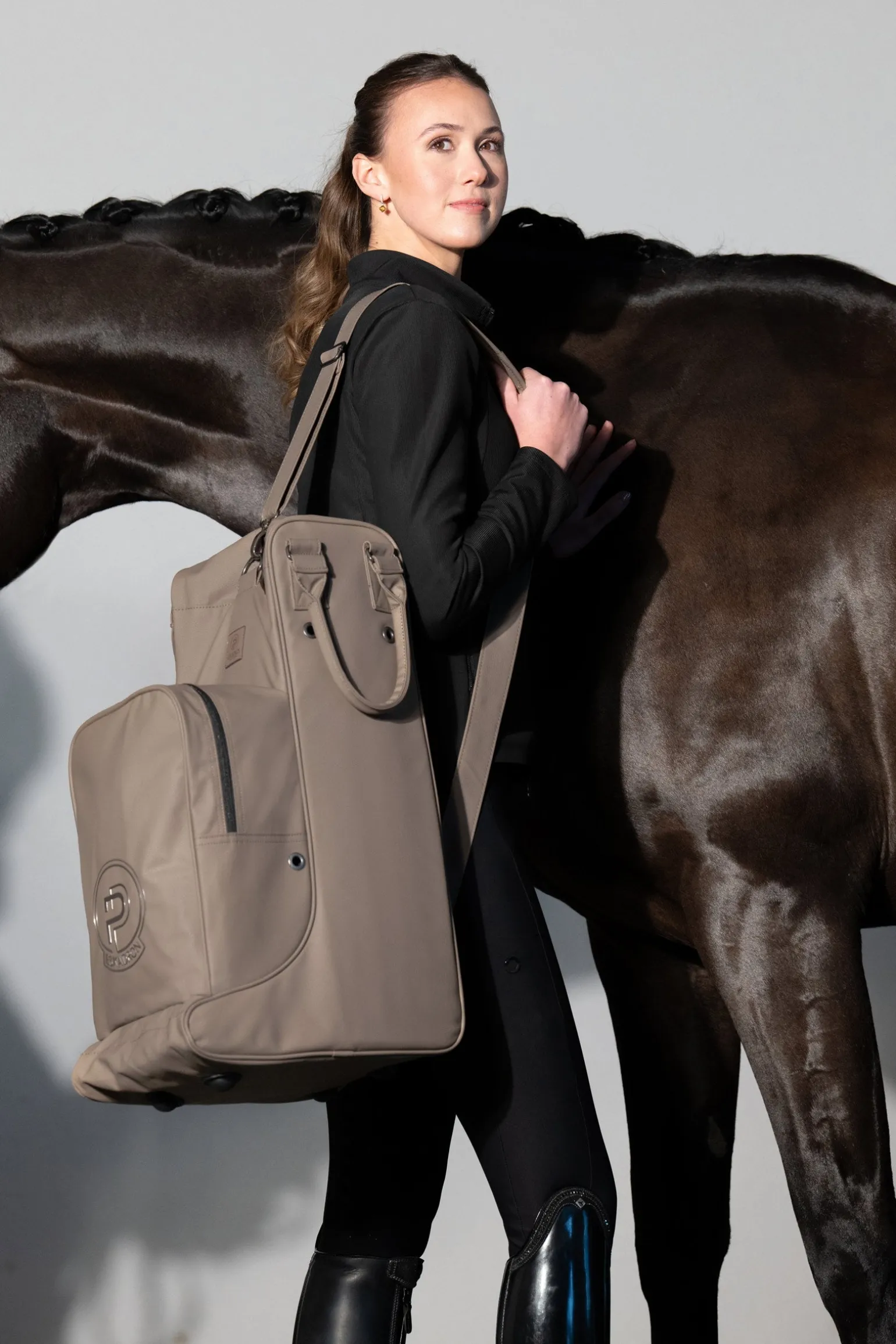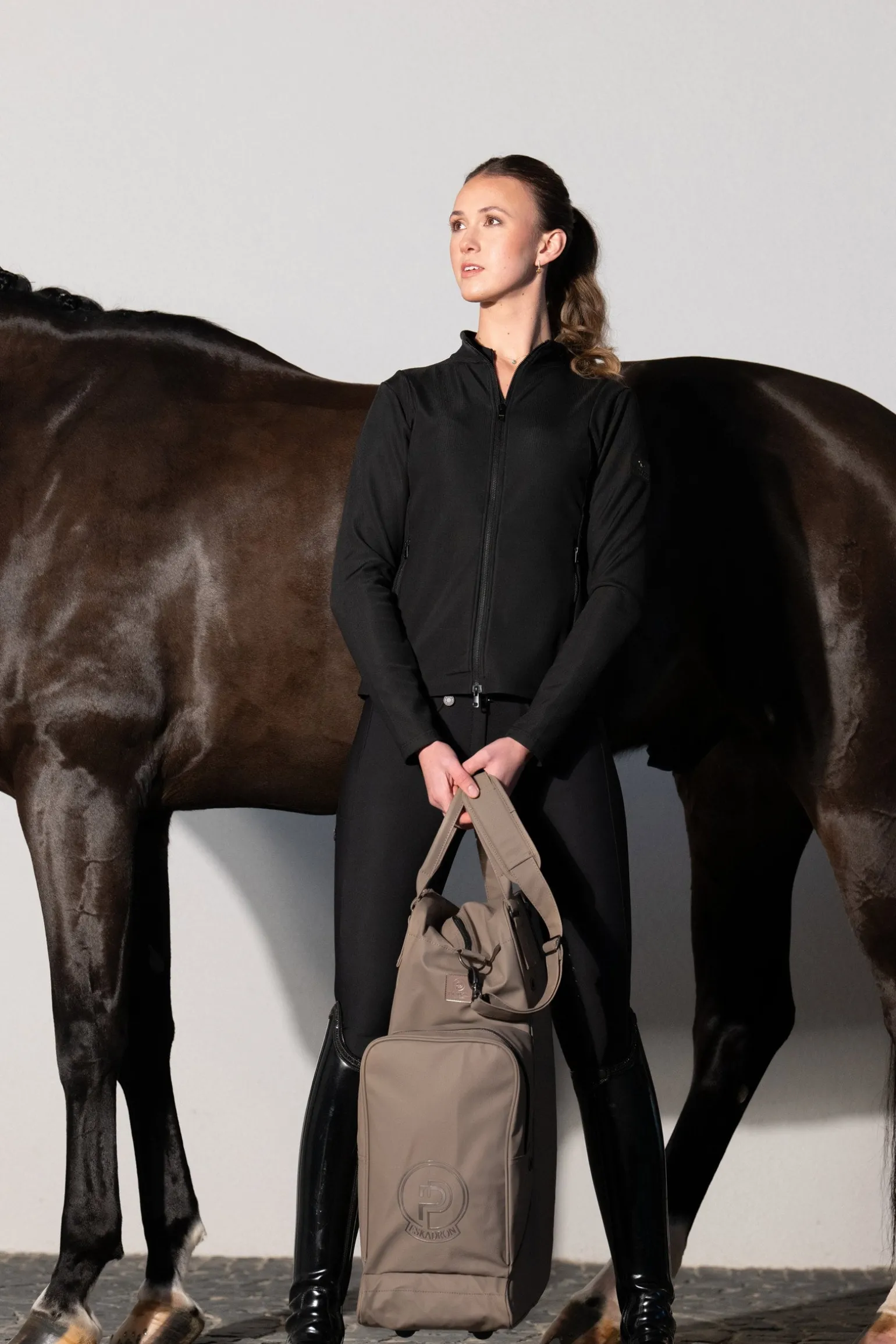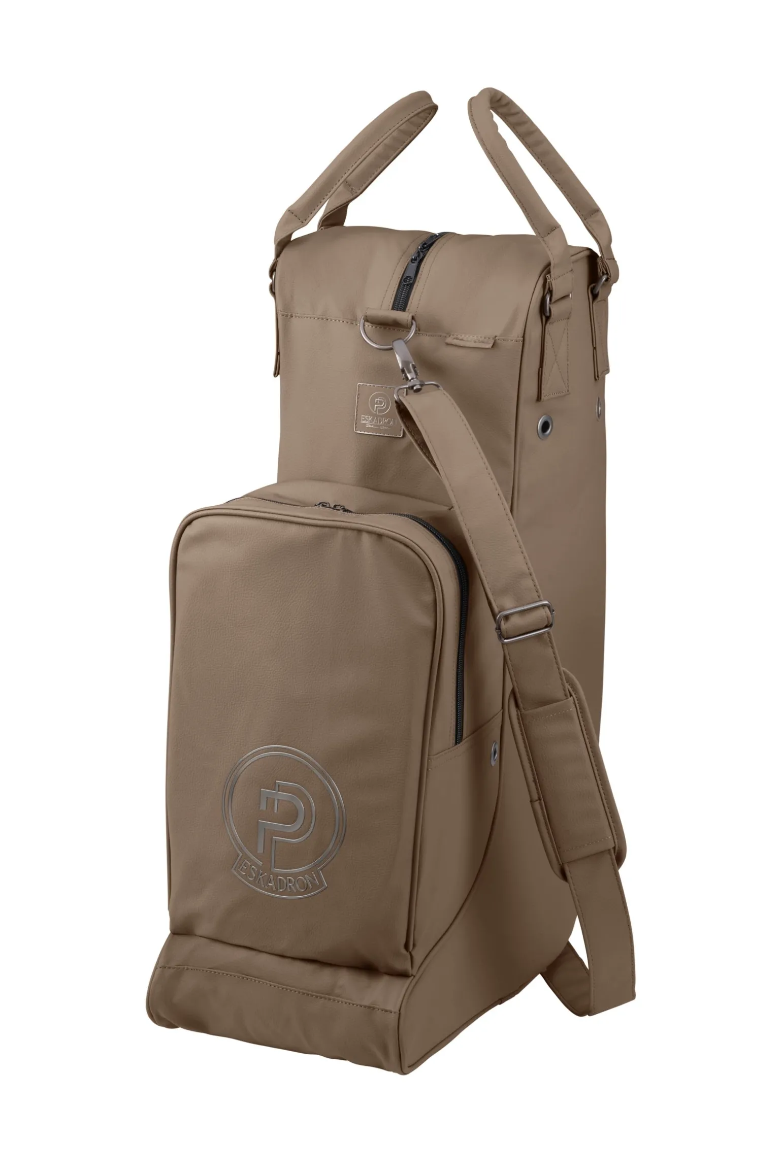 Diese edle Kunstleder-Tasche wurde entwickelt, um sowohl Reitstiefel als auch Helme bequem zu transportieren. Sie verfügt über ein Fach für Reitstiefel mit einer Trennwand und einem Reißverschluss sowie ein separates Fach für den Reithelm mit Reißverschluss. Die Tasche hat einen Griff und einen verstellbaren Schulterriemen aus Kunstleder für komfortables Tragen. Belüftungsöffnungen sorgen für einen Luftaustausch, während Plastiknoppen den Boden schützen. Abgerundet mit einem Platinum-Emblem und hochwertigen Metallbeschlägen in Taupe für einen raffinierten Look.