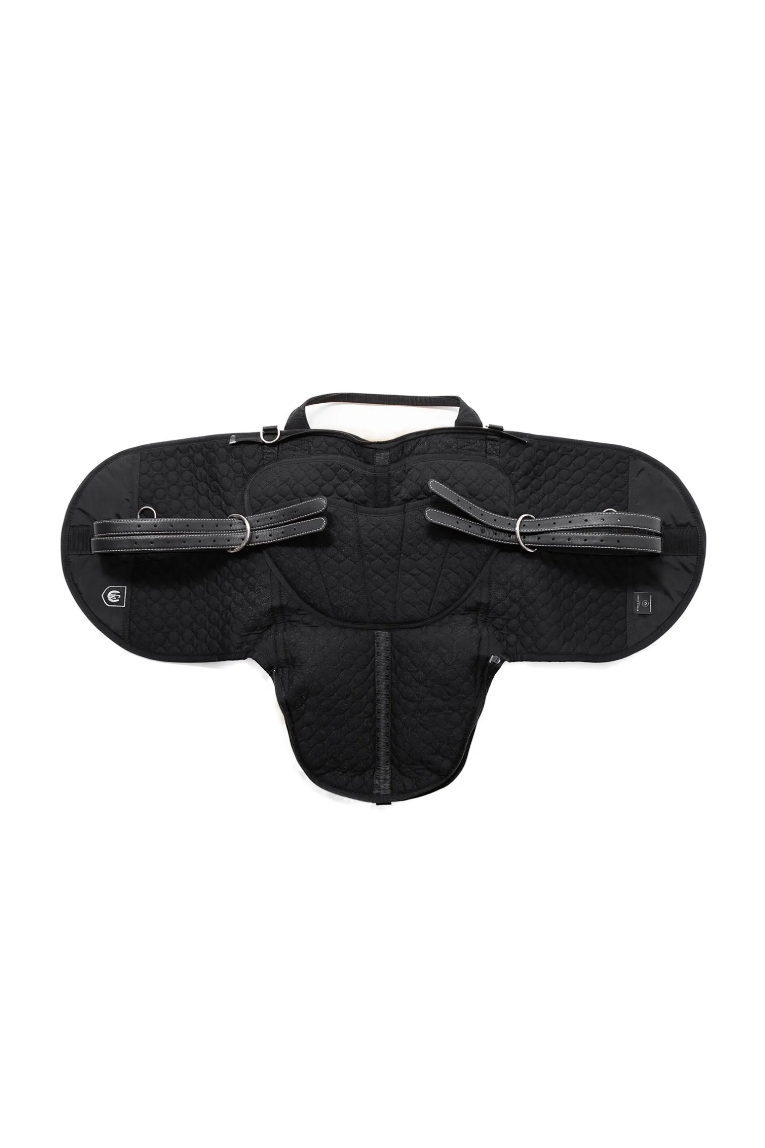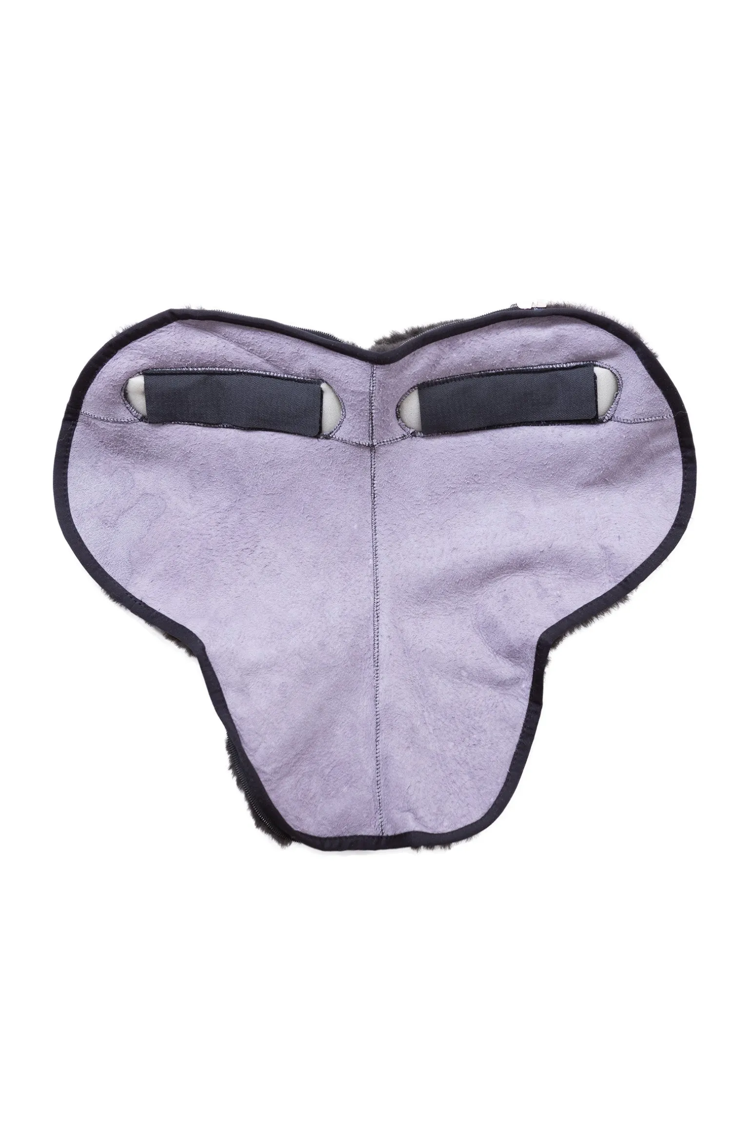 Die Sitzfläche ist komplett aus Lammfell mit einer Wollhöhe von ca. 20mm gefertigt, die Unterseite nur im Rückenbereich. Seitliche Fellpauschen bieten zusätzlichen Halt. Unter dem durch einen Reißverschluß abnehmbaren Sitzfell besteht die Möglichkeit ein spezielles Kopfeisen in eine Tasche einzuschieben. Die am Kopfeisen befestigten Sturzfedern erlauben das Aufsteigen über Steigbügel. Herausnehmbare Polster links und rechts vom Wirbelkanal erhöhen den Sitzkomfort und schonen den Pferderücken. Warmblut- und Ponygrößen werden unter der Artikelnummer 14483 verkauft.