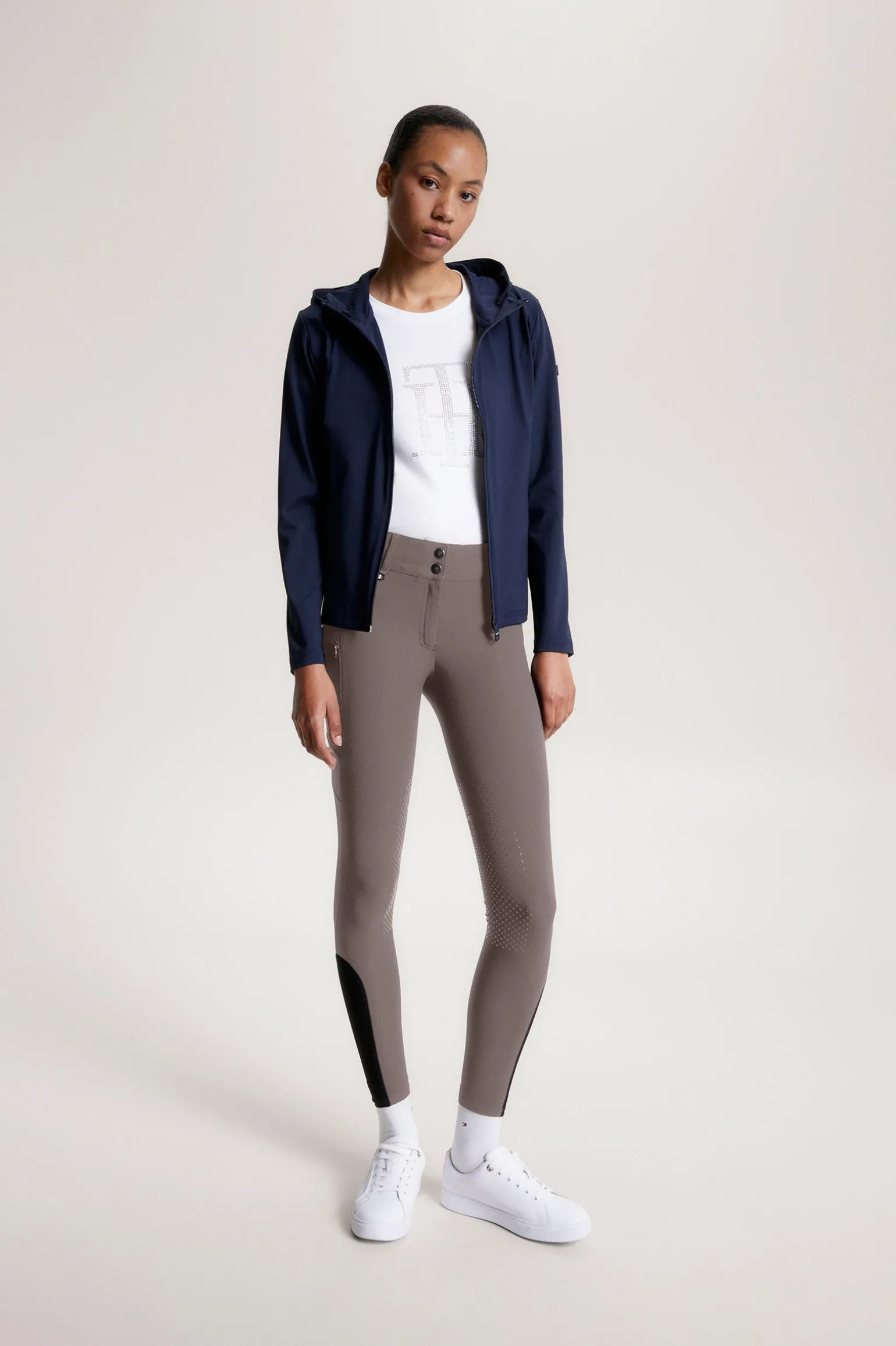 Die Tommy Hilfiger Equestrian Pro All-Year Vollbesatzreithose besteht aus einem technischen 4-Wege-Stretchmaterial, das atmungsaktiv und wasserabweisend ist – ideal für den Einsatz zu jeder Jahreszeit. Der vollflächige Silikonbesatz mit Markenlogo sorgt für sicheren Halt im Sattel, während der weiche Jersey-Beinabschluss maximalen Tragekomfort bietet. Mit Gesäßtaschen mit Klappe, einer praktischen Handytasche, gesticktem Logo auf dem linken Oberschenkel und TH Global Stripe Band an der Gürtelschlaufe.