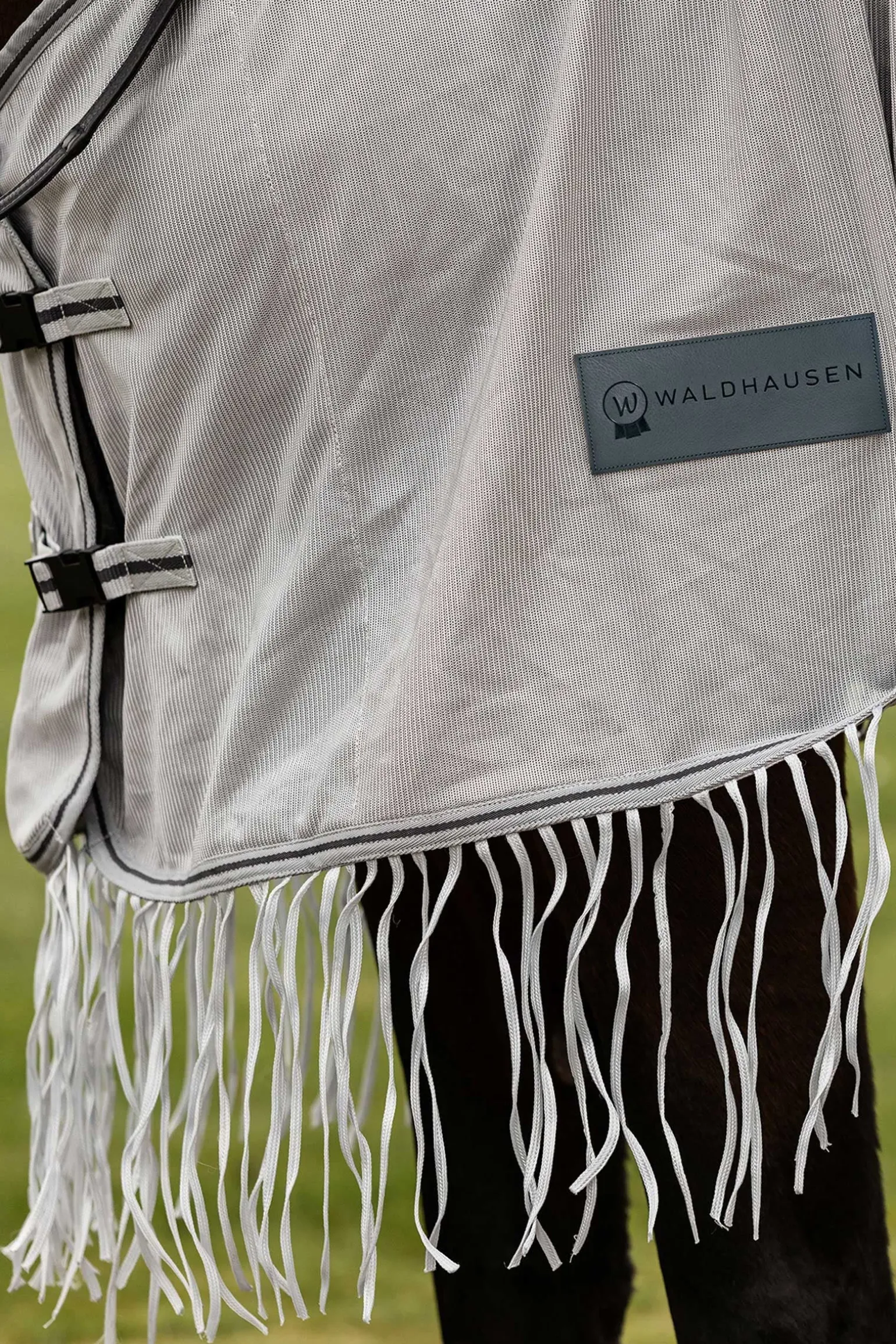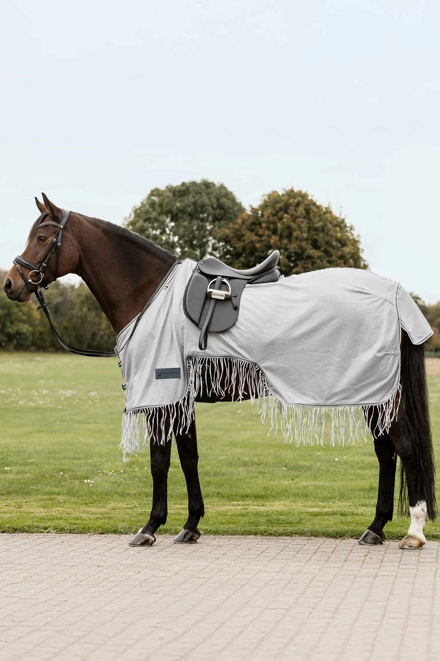 Hochwertige Fliegenausreitdecke aus einem feinen, engmaschigen Material. Sie ist mit einem doppelten Clip-Frontverschluss, einer Schweifkordel, einem abnehmbaren Schweiflatz und einer tief sitzenden Hinterhandkordel ausgestattet. Außerdem verfügt die Decke über Ringe zum befestigen eines Halsteiles. Der seitliche Riding-Cut und die reduzierte Seitentiefe fördern eine ungestörte und sensible Kommunikation mit dem Pferd. Zudem sind extralange Fransen am unteren Rand der Decke angebracht, um Fliegen und Bremsen vom Pferd fern zu halten, sodass man ungestört reiten kann.