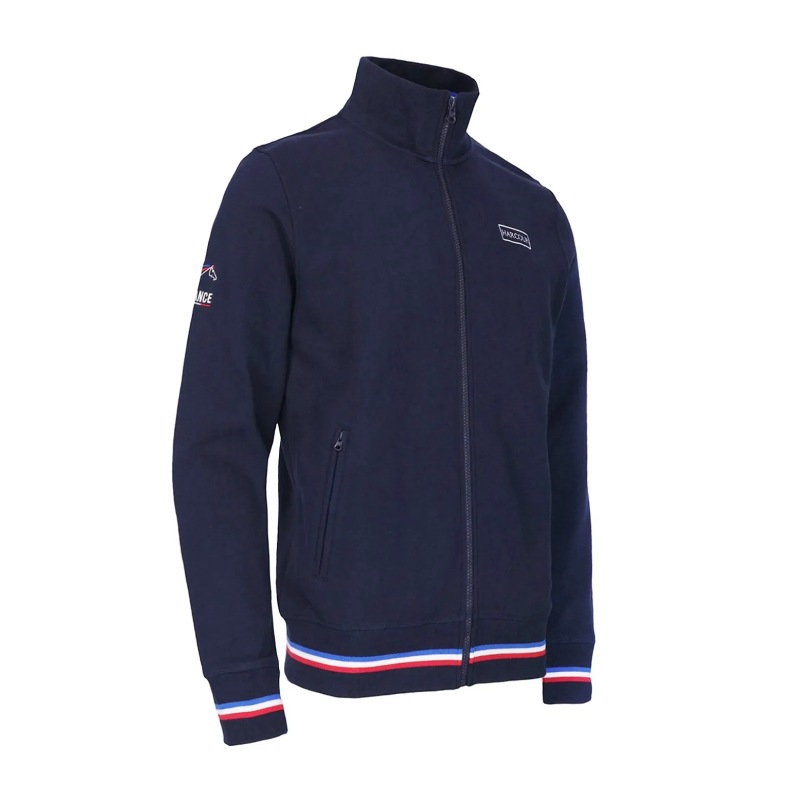 Die Sweatjacke hat ein Harcour-Logo auf der linken Brust und verfügt über französische Flaggen-Logos auf dem rechten Ärmel und ein Frankreich-Logo auf der Rückseite.